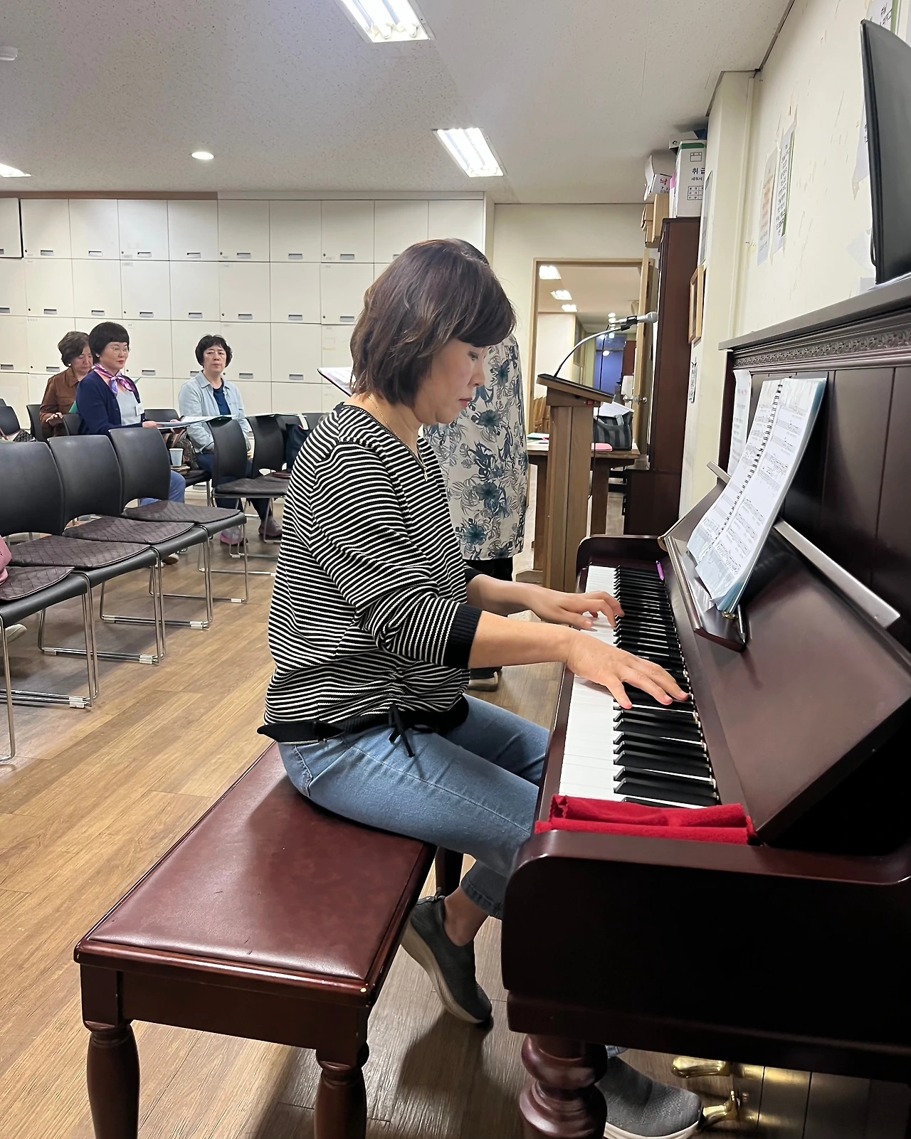 반주자님은 피아노 건반이 제 소리를 내지 못한다고 한 마디 한다.