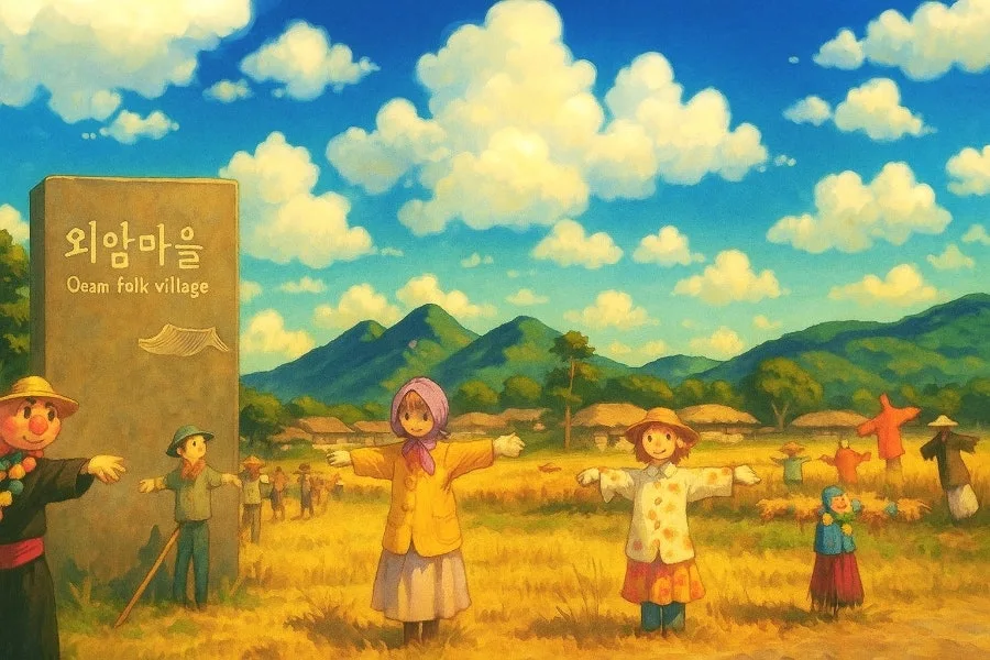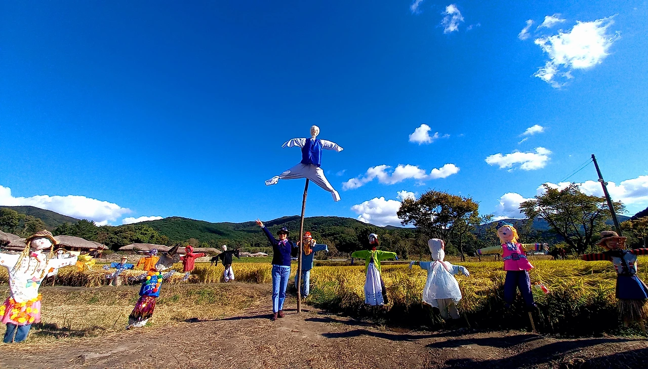 논에는 허수아비를 설치해 놓았다. 집에서 안 입는 옷들을 가져다 나뭇가지를 세우고 입혀놓은 것 같다. 허수아비들이 가지가지 다른 모습이다. 마치 풍년 축제를 벌이기라도 하는 품새이다. 전통적인 외암민속마을이 잘 보존되어 실제 사는 이들이나 여행하는 이들에게 늘 풍성한 축제가 되었으면 좋겠다.