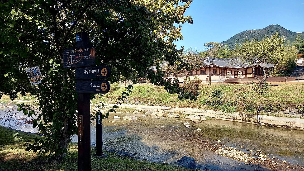 외암민속마을은 뒤쪽으로는 설화산이 보이고 파란 하늘에 흰 구름, 초가집과 기와집이 잘 어우러지고, 앞 쪽으로 개천이 흐르는데 물이 참 맑다. 초가 정자와 물레방아, 소나무를 지나간다.