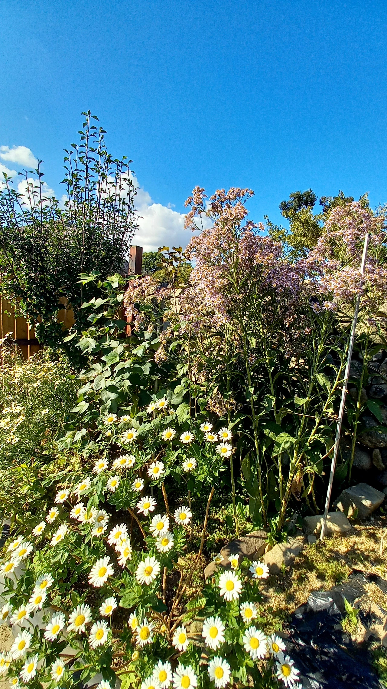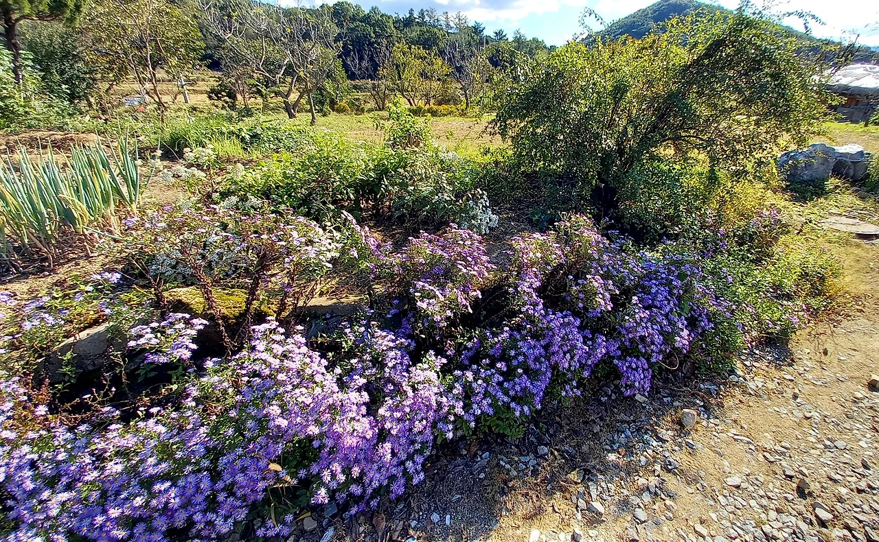 외암민속마을은 돌담길이 참 예쁘다. 초가집, 기와집들이 섞여 있는데, 대부분 돌담을 쌓고 사립문도 싸릿대로 만든 집도 있다. 집 안에도 길가에도 돌담 옆에도 하얀 구절초와 보랏빛 벌개미취 등 예쁜 꽃들이 군데군데 피어 있어서 운치를 더한다. 돌담과는 잘 익은 감나무의 감들이 잘 어우러진다. 길가에 돗자리를 펴고 들깨를 말리기도 한다. 전형적인 시골 풍경이라 정감이 간다.
