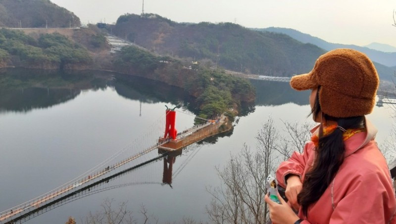 좋은산에서 청양 칠갑산 & 천장호 출렁다리 산행이다. 하루 전에 미리 배낭을 꾸려놓고, 장을 보러 갈까 하다가 그만둔다. 내일 가져갈 비상식(초콜릿, 소시지, 젤리, 쌀국수, 왕만두)도 다 준비해놓은 게 있고, 반찬거리도 며칠 전에 장 봐 놓은 게 있어서 그냥 쉰다. 서해안 산간지역에 눈 소식이 있어서 우리가 갈 청양 칠갑산에도 혹 눈이 내렸을지 모르겠다. 주말 날씨는 조금 추울 거라고 한다. 아이젠과 스패치, 스틱과 장갑, 모자와 워머 준비를 하고, 여벌 옷은 웃옷과 양말 한 켤레만 넣는다. 날씨가 추우면 땀을 많이 흘리지 않기에 산행 후에 얼굴 정도 닦으면 되고, 웃옷이나 속옷은 갈아입지 않아도 괜찮지만 그래도 혹 모르기 때문이다. 칠갑산 산행코스는 두 가지인데, 나는 조금 쉬운 A코스를 걸을 예정이다. 그래도 8.5km 약 4시간 30분은 걸어야 한다. 점심은 산 위가 추울 수 있어서 따뜻한 물과 쌀국수, 그리고 밥과 김치 조금 가져가려고 한다. 추울 때는 자리를 펼쳐놓고 편하게 앉아서 점심을 먹기가 마땅치 않을 수도 있다. 돌이나 나무에 걸터앉아서 먹거나 서서 먹어도 산행 후 점심은 꿀맛이다. 겨울산행은 또 색다른 맛이 있다. 부디 눈꽃 산행이면 좋겠다. 그렇지 않더라도 추위에 땀을 살짝 흘리며 걷는 맛이 있다. 주말에 영하 10도로 내려가 날씨가 춥다는 일기예보에 옷을 두껍게 입고 나선다. 그런데 밖에 나와보니 날은 그다지 춥지 않다. 산을 오르는 데도 춥지 않을 것 같아서 두꺼운 옷은 차에 두고 가을에 입는 잠바만 입고 장갑도 가을 장갑을 끼고 출발한다. 그렇지만 워머와 모자는 쓰고 나선다. 멋진 천장호 출렁다리가 먼저 우리를 반긴다. 오늘의 짝꿍과 나는 여유 있게 사진을 찍고 간식도 조금 먹고 천천히 산을 오른다. 칠갑산 천장호에는 <고향의 봄> 시비와 <콩밭 매는 아낙네상>과 <용과 호랑이 전설> 그리고 포토존도 마련되어 있다. 이야기가 있어서 재미나다는 생각이다. 칠갑산을 조금 오르니 천장호와 출렁다리가 한눈에 조망이 된다. 참 그윽하니 멋스럽다. 산은 겨울에 올라도 좋을 만큼 완만하다. 정상까지 오르는 길도 그다지 험하지 않고 능선길이 많아 편안하다. 눈이 내려도 무난하게 걸을 수 있는 길이다. 눈이 살짝 내린 데다 바닥이 얼어있지만 스틱을 짚고 조심조심 걸으니 그다지 미끄럽진 않다. 걸음이 빠른 짝꿍은 먼저 올라가고 쉬엄쉬엄 혼자서 걷노라니 고즈넉하니 참 좋다. 이런 생각 저런 생각, 올 한 해를 돌아보며 고마운 생각, 그리운 생각, 두루두루 하며 걷는다. 새해 소망을 담아 기도도 드린다. 올해보다 나은 새해, 꿈꾸는 것들이 무르익는 새해, 건강하고 복된 새해가 되기를 기도드린다. 그리고 내가 알고 있는 모든 분들이 행복했으면 좋겠다고 기도드린다. 45명이 한 차를 타고 와도 산행할 때는 혼자 할 수 있어서 더 좋다. 걷다 보니 어느새 정상이다. 정상에서 짝꿍이 손짓을 한다. 인증숏을 찍으려는 사람들이 줄을 서 있다. 정상 풍경을 담고 싸온 간식을 먹는다. 쌀국수, 소시지, 고구마 등으로 간단하게 요기를 한다. 날이 춥지 않아 도시락을 싸와도 좋았을 것 같다. 칠갑산 정상에서 블랙야크 100대 명산 인증숏을 찍는다. 짝꿍은 올 4월부터 시작해서 이제 27번째 찍었다고 한다. 나는 이제 7번째 인증숏이다. 서두르지 않고 산행하고 있어서 느리지만 그래서 더 여유 있고 좋다. 하산길에서는 <칠갑산 아흔아홉 골> 촬영 장소를 만난다. 날씨가 아주 맑지는 않지만 그래도 제법 산 능선과 골짜기 굽이굽이가 잘 보인다고 좋아라 한다. 사진과 동영상을 찍고 부지런히 내려온다. 아무래도 시간이 좀 남을 것 같다. 조금 더 내려오니 <연인 소나무>가 있다. 뿌리가 다른 두 나무가 하나로 뭉쳐져 밑에서 보면 하나인데 중간에 갈라졌다가 붙었다가 또 갈라졌다가 붙었다가 뱅뱅 돌면서 신기하게 자랐다. 아마도 연인들도 이러지 않을까 싶다. 함께인 듯 아닌 듯 그래도 그 자리를 벗어나지 않고 늘 한 자리에서 뱅글뱅글 맴돌면서 함께 가는 것이다. 이 나무에 <연인 소나무>라는 이름을 붙인 게 재미나다.