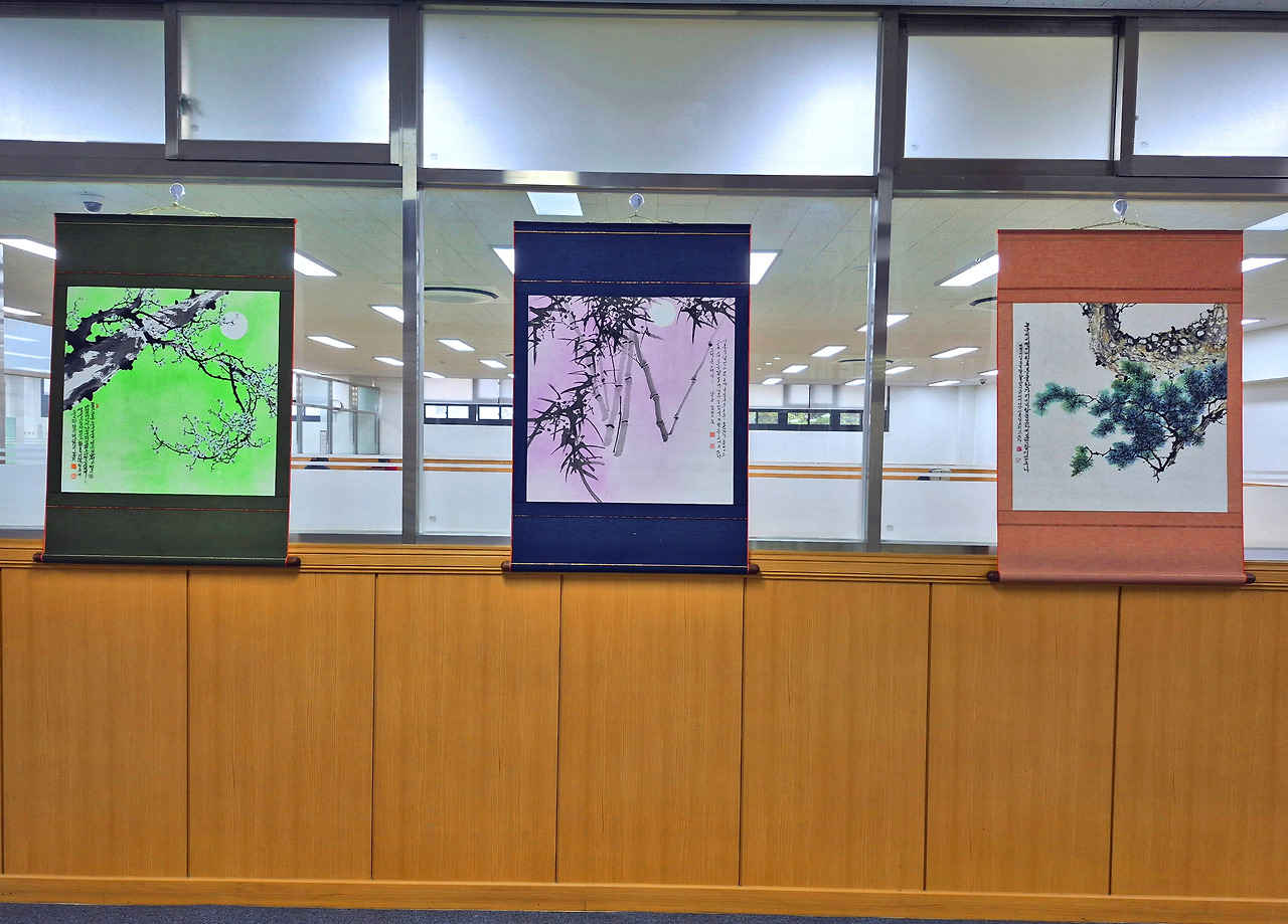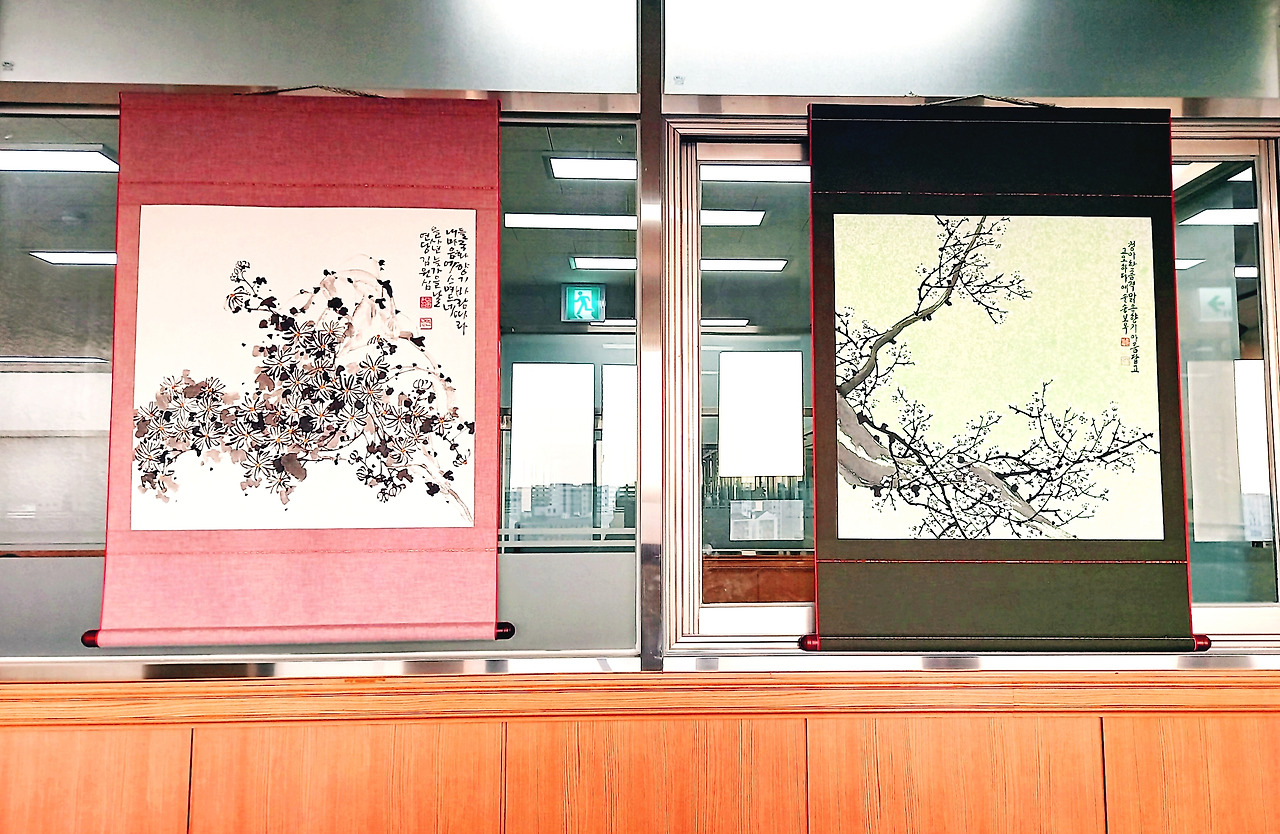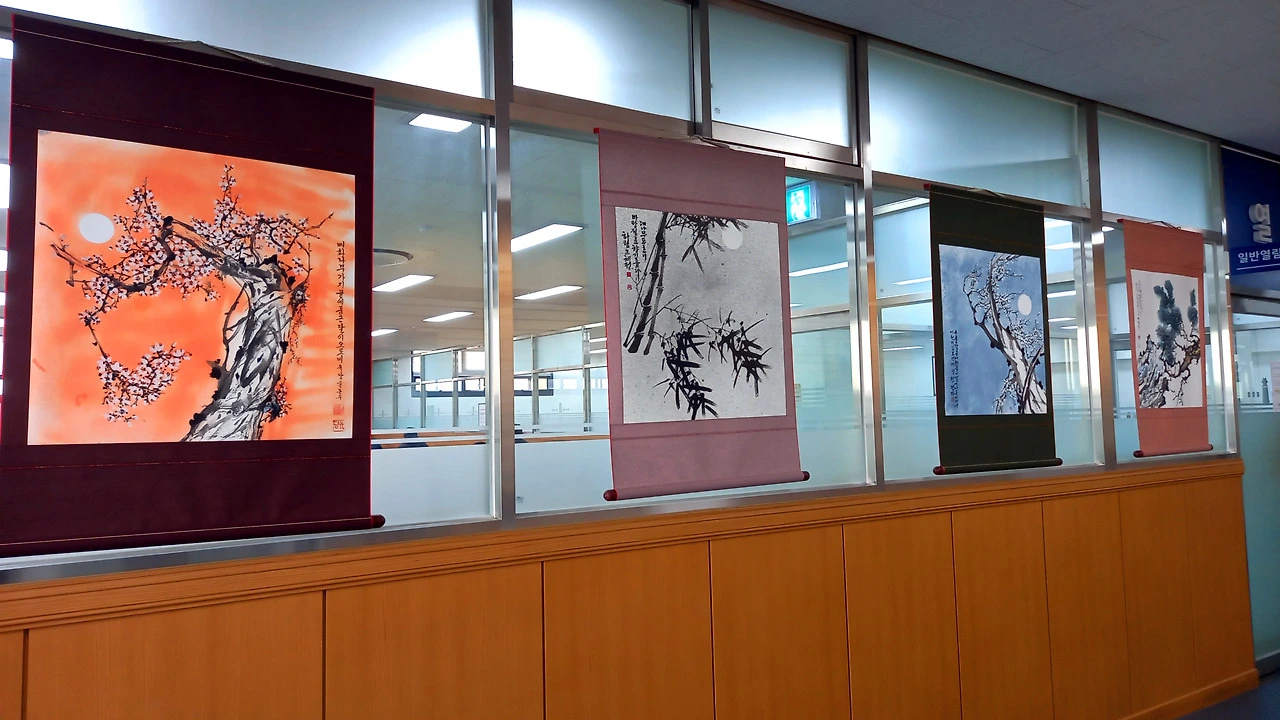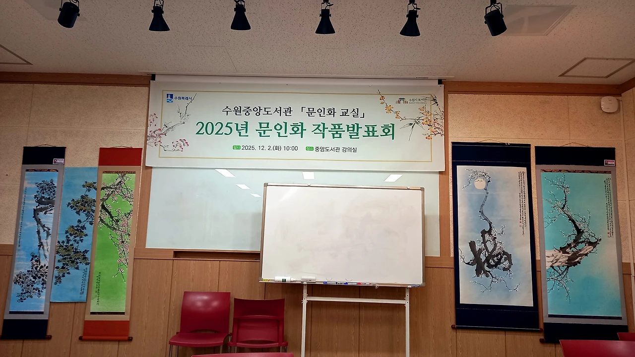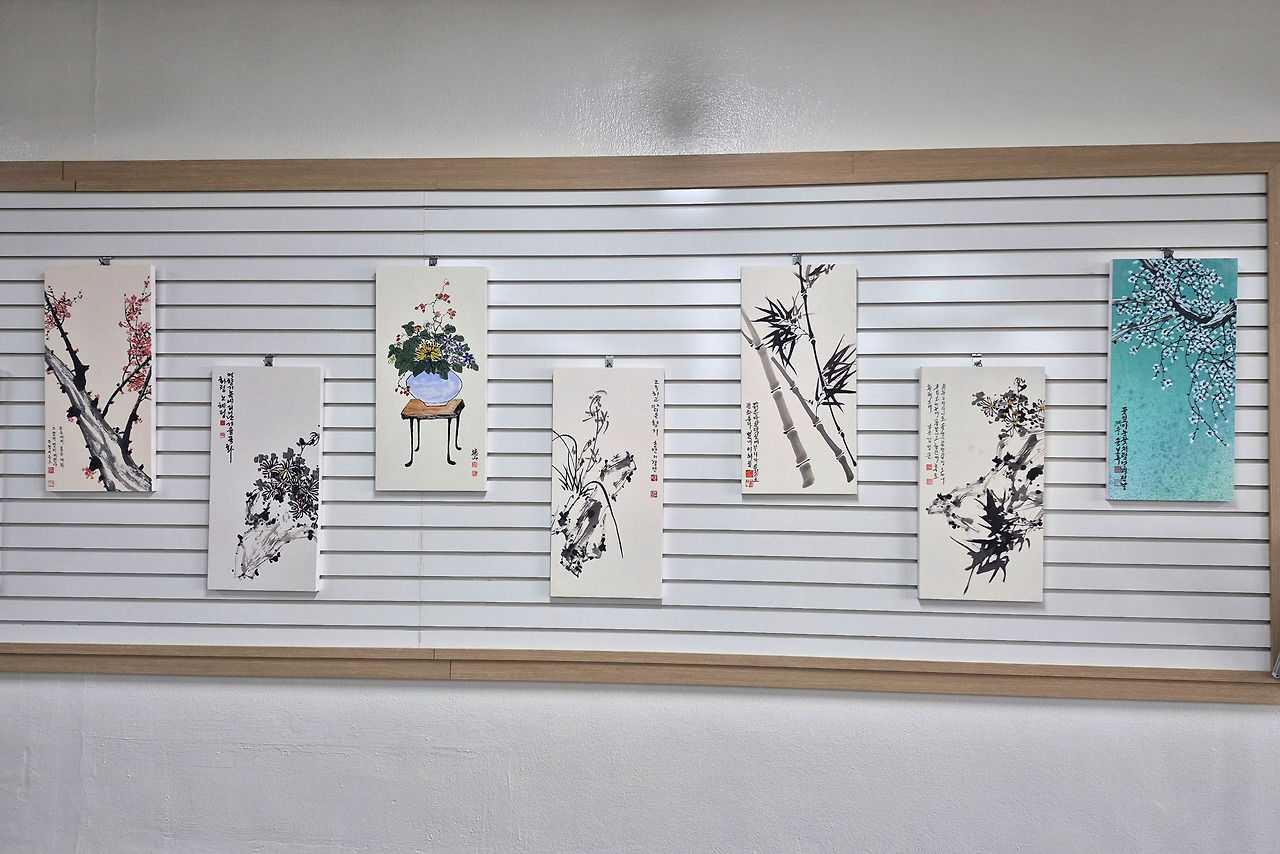 중앙 문인화 [매난국죽] 전시회는 2025년 11월 25일(화)부터 시작되어 12월 8일(화)까지 수원중앙도서관 2층 로비에서 작품 28점으로 만나볼 수 있다. 판넬 작품 21점, 족자 작품 8점이다. 나는 판넬 1개, 족자 1개, 두 작품을 전시 중이다. 원래는 판넬용으로 2개 작품을 냈는데, 동아리 인원수가 많고 전시 공간은 한정되어 있어서 1개를 뺐다. 다른 회원들도 그런 경우가 여럿 있다. 가능하면 지난해와 올해 시작한 신입회원들도 한 작품이라도 전시를 해야 하기 때문이다.