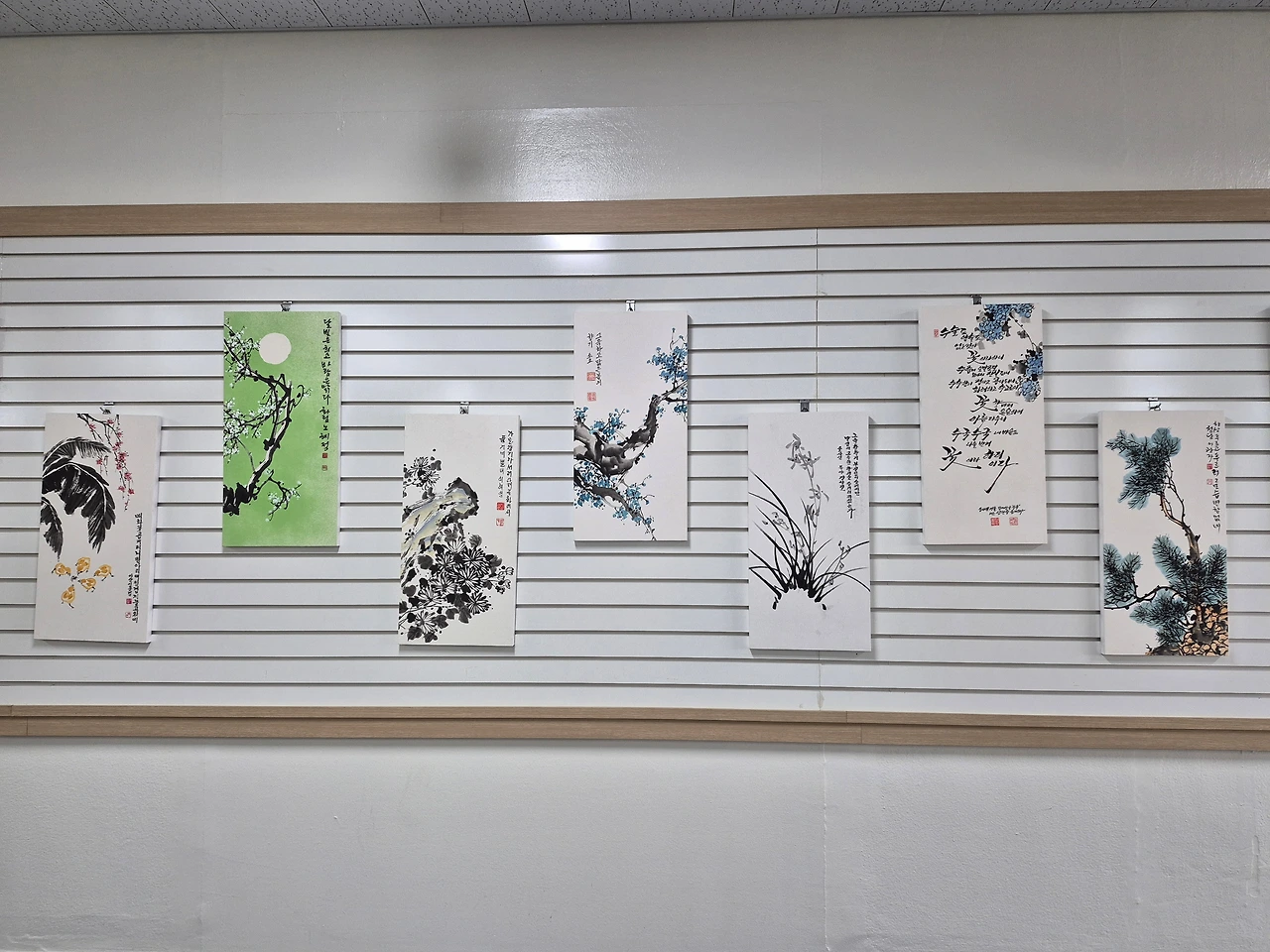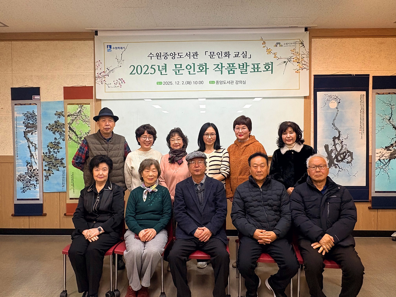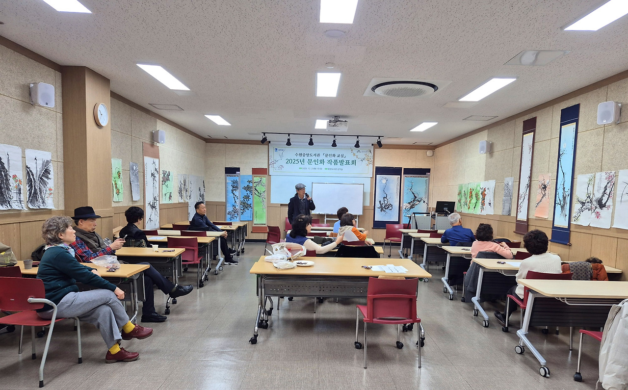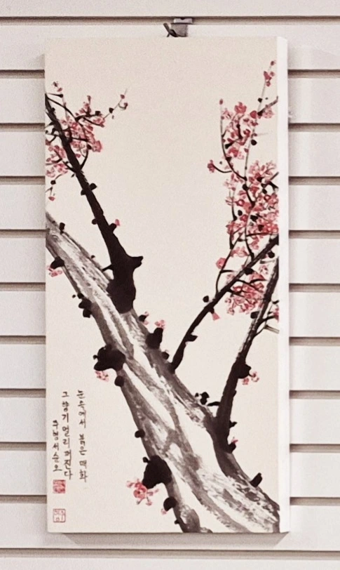 중앙 문인화 [매난국죽] 전시회는 2025년 11월 25일(화)부터 시작되어 12월 8일(화)까지 수원중앙도서관 2층 로비에서 작품 28점으로 만나볼 수 있다. 판넬 작품 21점, 족자 작품 8점이다. 나는 판넬 1개, 족자 1개, 두 작품을 전시 중이다. 원래는 판넬용으로 2개 작품을 냈는데, 동아리 인원수가 많고 전시 공간은 한정되어 있어서 1개를 뺐다. 다른 회원들도 그런 경우가 여럿 있다. 가능하면 지난해와 올해 시작한 신입회원들도 한 작품이라도 전시를 해야 하기 때문이다.