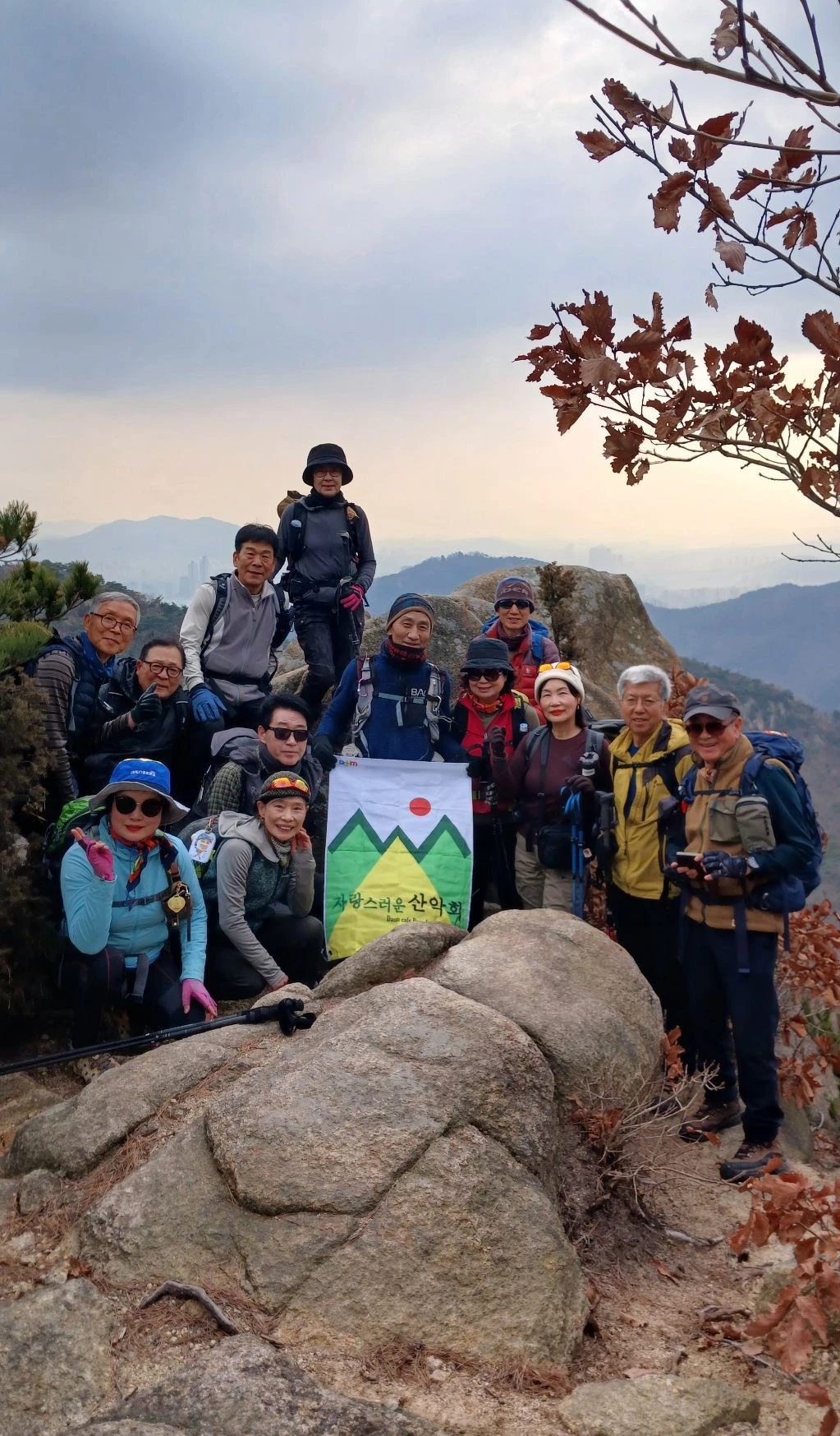 나는 가능한 한 1주1산을 실천하고 있는 사람이다. 기독교인인 나는 주일에는 산행이 어려워 매주 토요일마다 산행을 한다. 그런데 이번 토요일은 이화 80 동창 송년회가 있어서 산행이 어렵다. 그래서 며칠 앞당겨 자랑산 별다섯 대장님 리딩 삼성산 학우봉능선과 관악산 연꽃바위길 산행을 하기로 한다. 참여 인원은 별 대장님과 인테리어 지기님 포함 모두 14명이다. 남산우님 9명, 여산우님 5명이다.