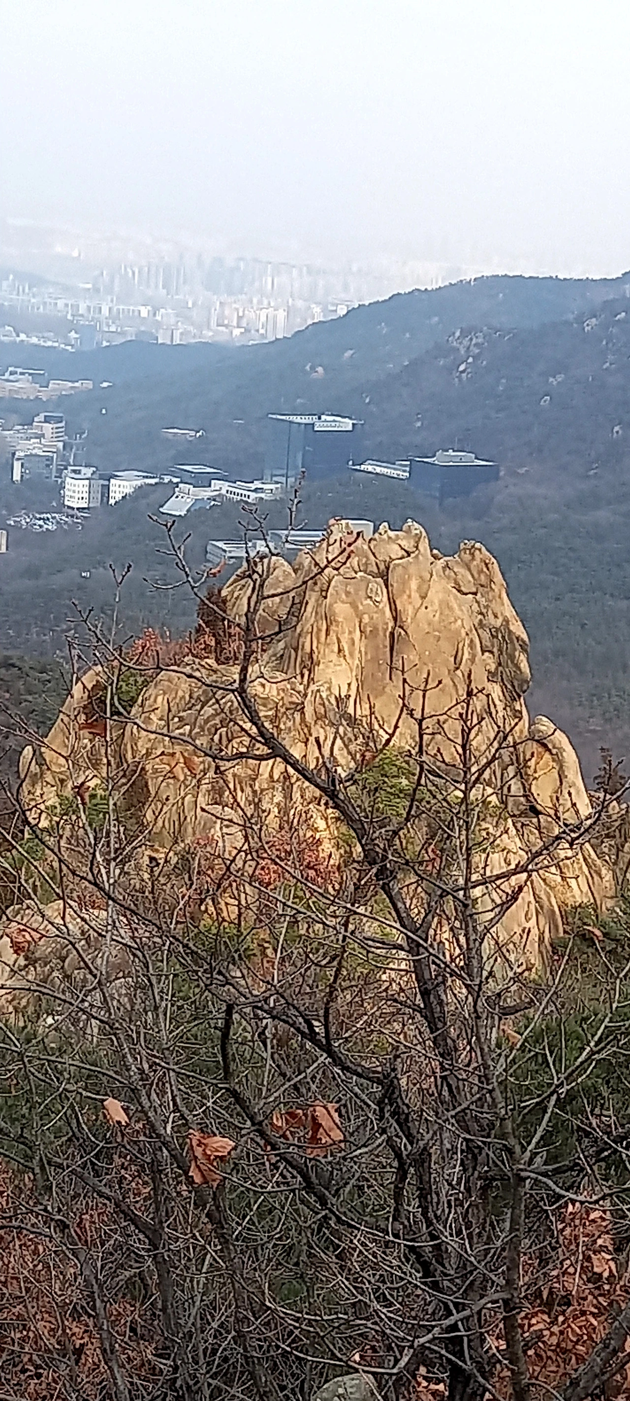연꽃바위에 오르지 않은 산우님들은 다들 연꽃바위 왼쪽길 완만한 길로 간다. 연꽃바위에 오른 이들은 아직 내려오기 전이다. 징검님, 솔벗 방장님, 나는 인 지기님 따라서 오른쪽 암릉길로 내려간다. 그런데 또 그냥 내려오기 위험한 암릉 구간이 나타난다. 인 지기님 자일과 징검님 자일을 묶어서 나무에 걸고 잡고서 간신히 내려온다. 연꽃바위 왼쪽길은 완만한 길인 모양인데 우리가 내려온 오른쪽 길은 암릉길이라 험하지만 조망이 좋다. 철탑이 솟은 관악산 정상도 보이고 주변 산봉우리들과 능선이 그리는 그림이 아주 시원스럽고 수려하다.