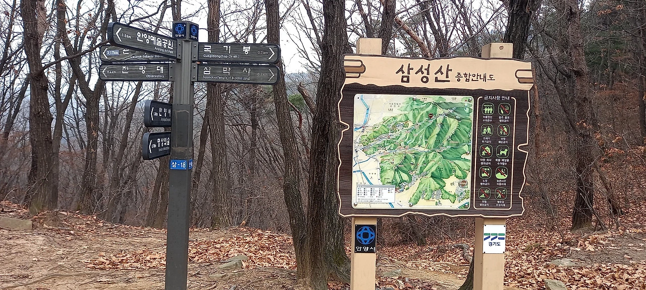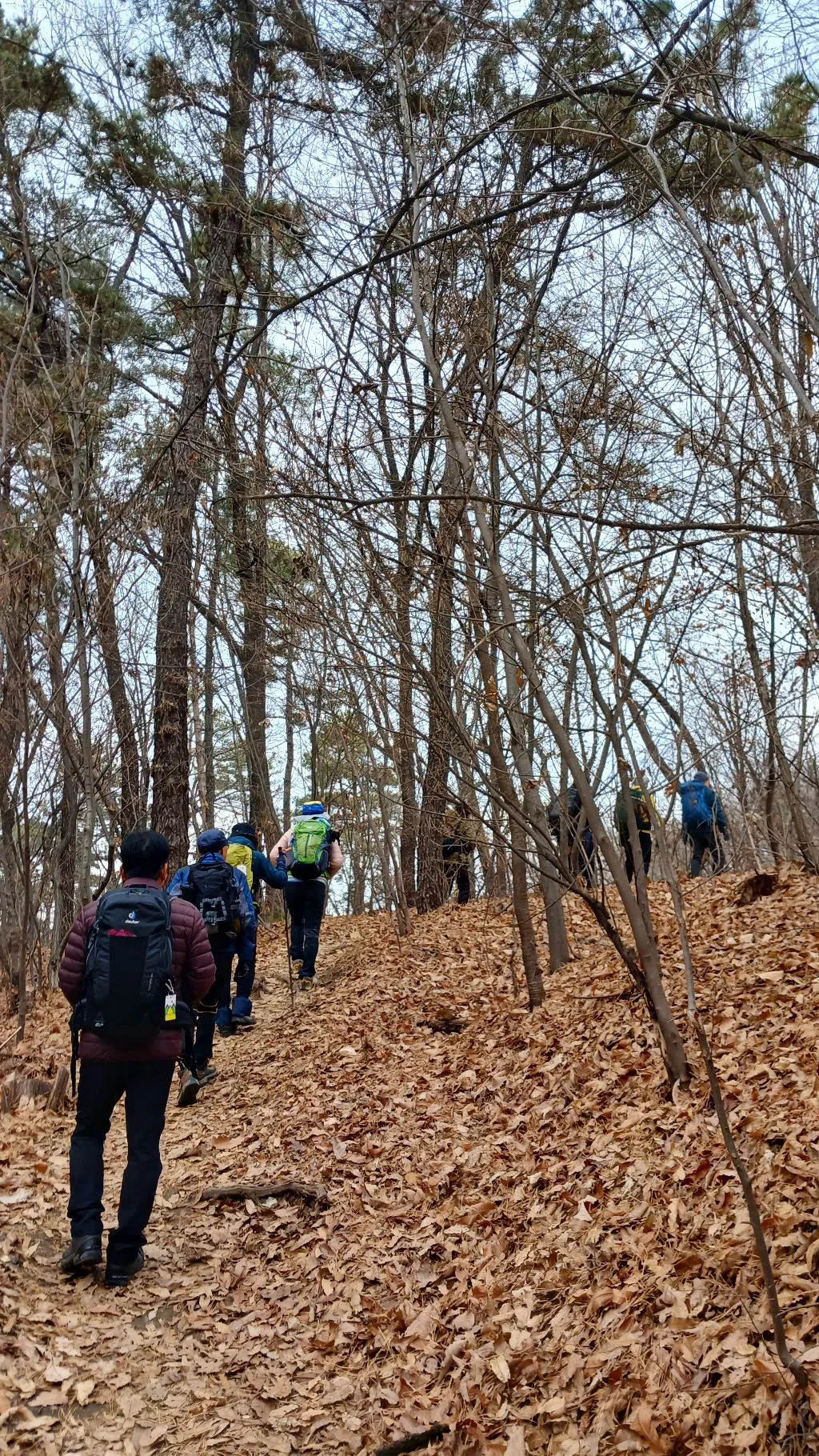 반갑게 서로 인사하고 출발한다. 도로길 따라 걷다가 삼성초등학교 앞을 지나 삼성산을 오르기 시작한다. 초입부터 낙엽이 수북이 쌓여 있어서 바스락거리는 소리가 정겹다. 전국적으로 비 소식이 있지만 비는 내리지 않고 기온도 영상 1도-10도 예보라 산행하기 딱 좋은 날씨이다.
