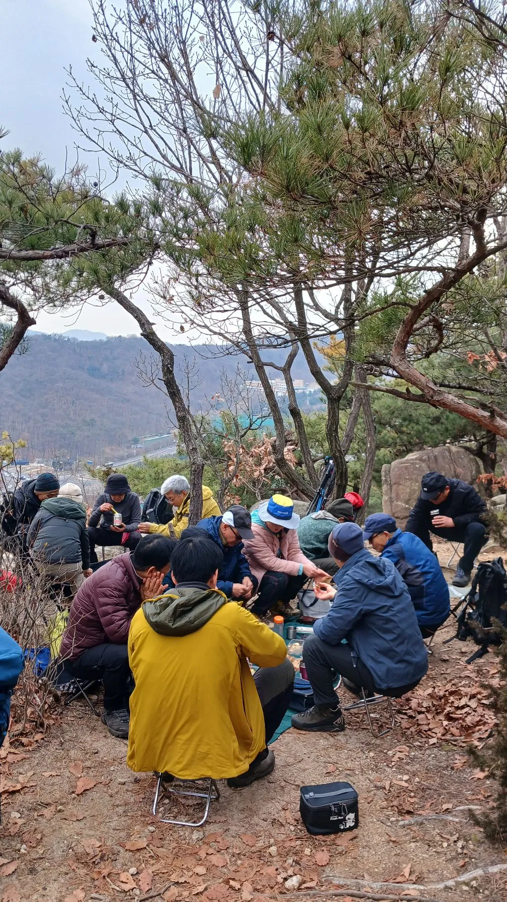 자랑산은 만나는 시간이 오전 11시라 곧 점심을 먹는다. 삼성산 오를 때마다 점심을 먹고 가는 널찍한 밥터에는 벌써 다른 산악회 사람들이 차지하고 앉았다. 아주 시끄러운 소리로 요란하게 점심식사를 하고 있다. 그 옆에 자리가 좀 남아 있어서 별 대장님은 거기서 점심을 먹을까 하나 본데, 산우님들이 시끄럽다며 더 올라가자고 한다. 조금 더 오르니 도로와 시내 조망이 좋은 곳에 널찍한 밥터가 있다. 거기서 세 팀으로 나누어 밥상을 차린다. 두 줄로 죽 늘어앉아서 먹어도 좋은데, 오늘따라 자연스럽게 그렇게 되었다. 그렇지만 가져온 음식들은 서로 사이좋게 나누어 먹는다.