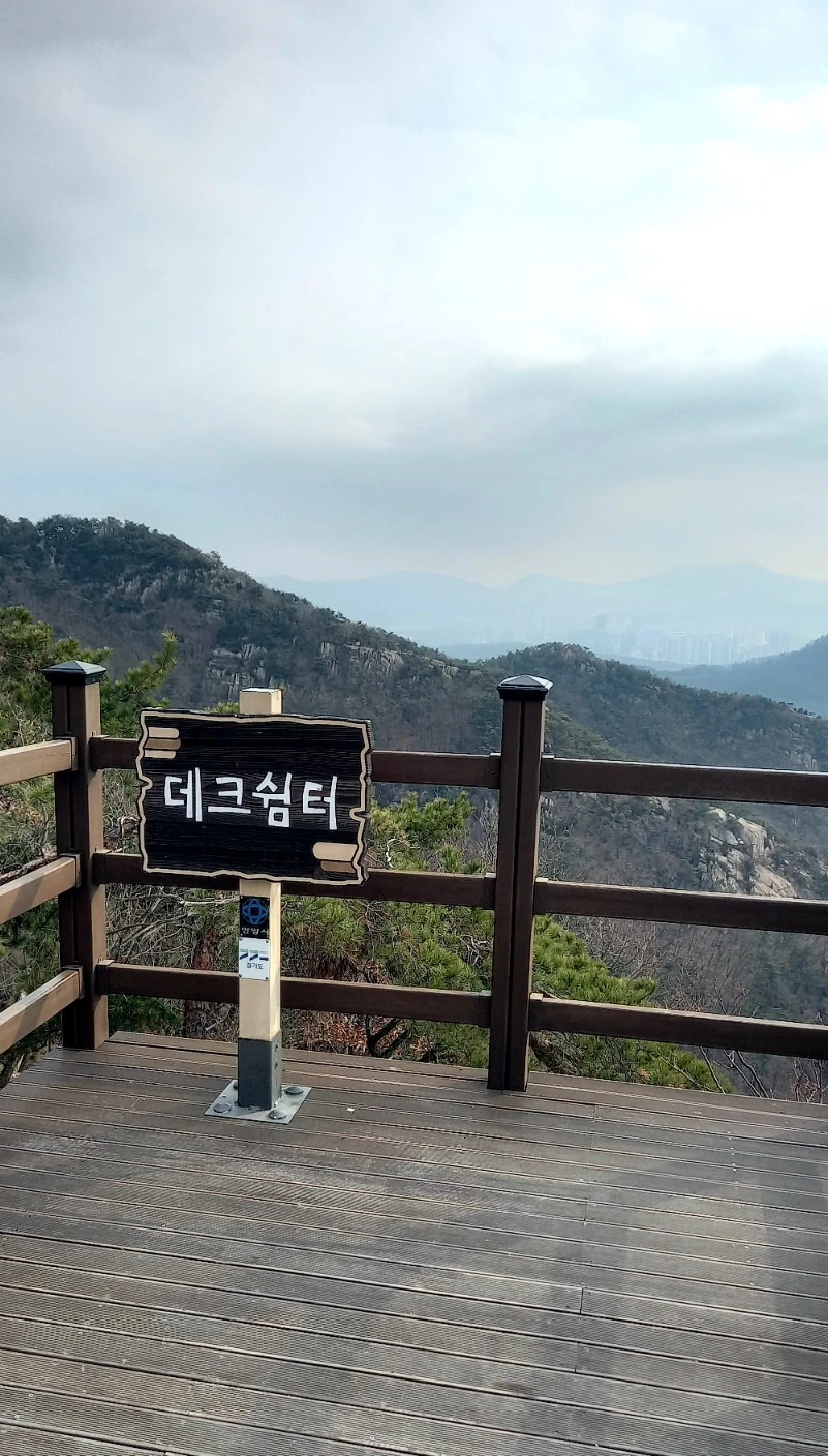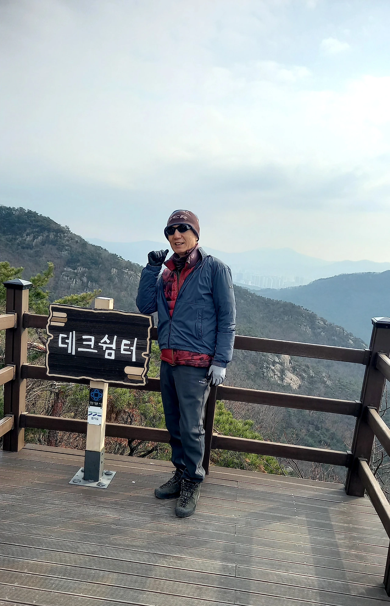 데크쉼터가 나온다. 아마도 여기가 제1전망대인 것 같다. 이곳에서는 항상 사진을 찍어보지만 '데크쉼터'라는 이름표 이외에 멋진 조망은 잘 잡히지를 않는다. 그래도 기념샷을 남겨본다. 징검님과 별 대장님 사진을 찍어드리고 나도 몇 컷 남긴다. 더 올라가야 할 데크길과 암릉길 저 뒤로 제2전망대가 우람하게 서 있다. 봄뜰 방장님 뒤로 솟은 봉우리가 꽤나 멋져서 한 컷 담아본다.
