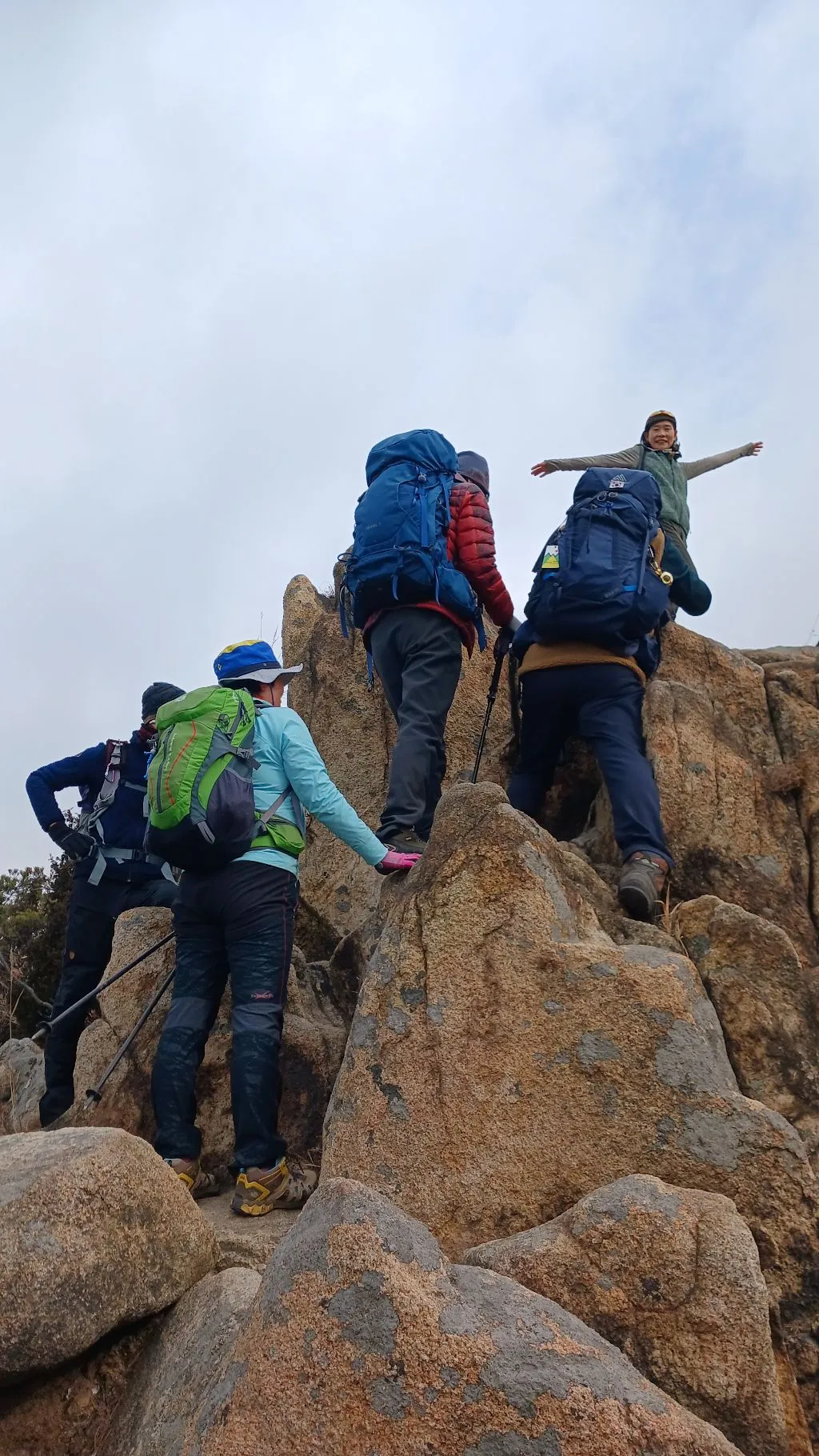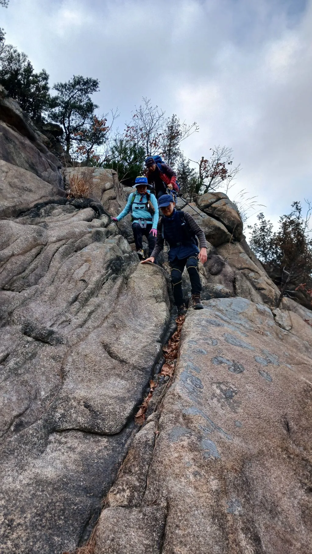 별 대장님이 산우님들이 암릉길 잘 올라오고 있나 살피며 오르신다. 인 지기님은 산우님들 암릉길 올라오는 모습을 사진에 담으면서 후미로 오신다. 다른 남산우님들도 스틱도 받아주시면서 앞에서 뒤에서 여산우님들을 끌어주고 밀어주시는데 그저 고맙기만 하다. 암릉을 오르며 함산 하는 기쁨을 한껏 누린다.