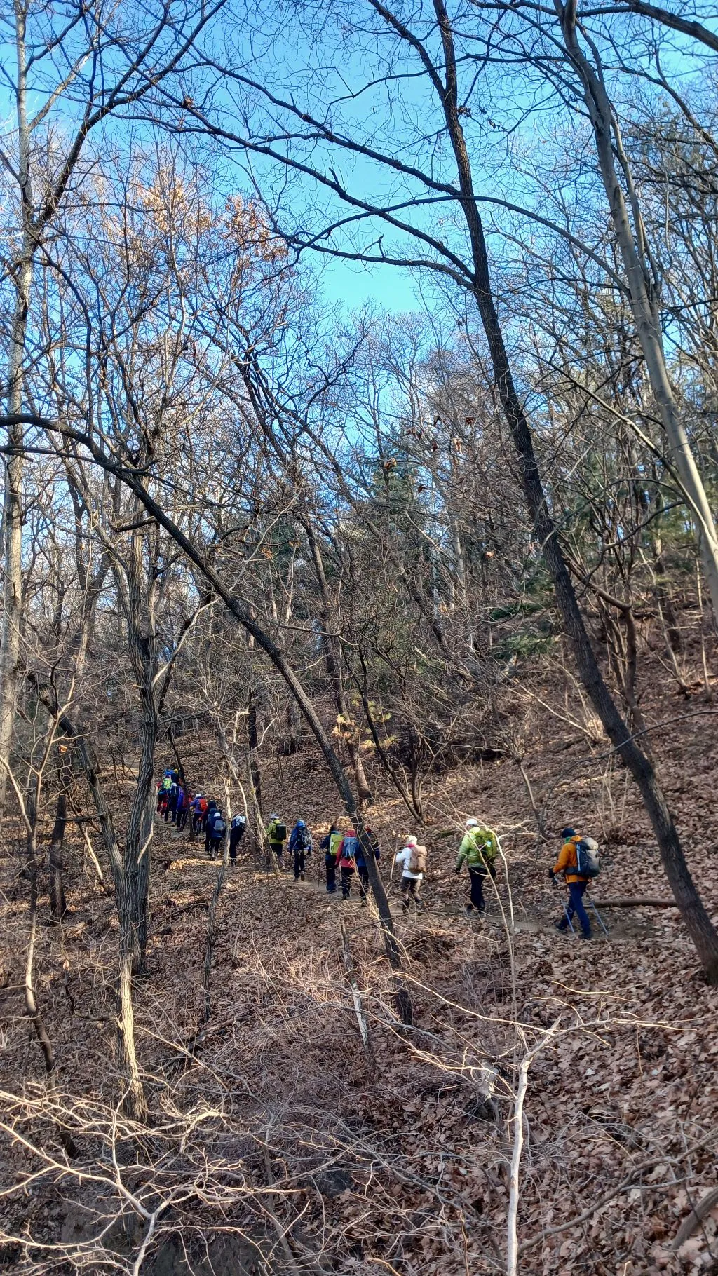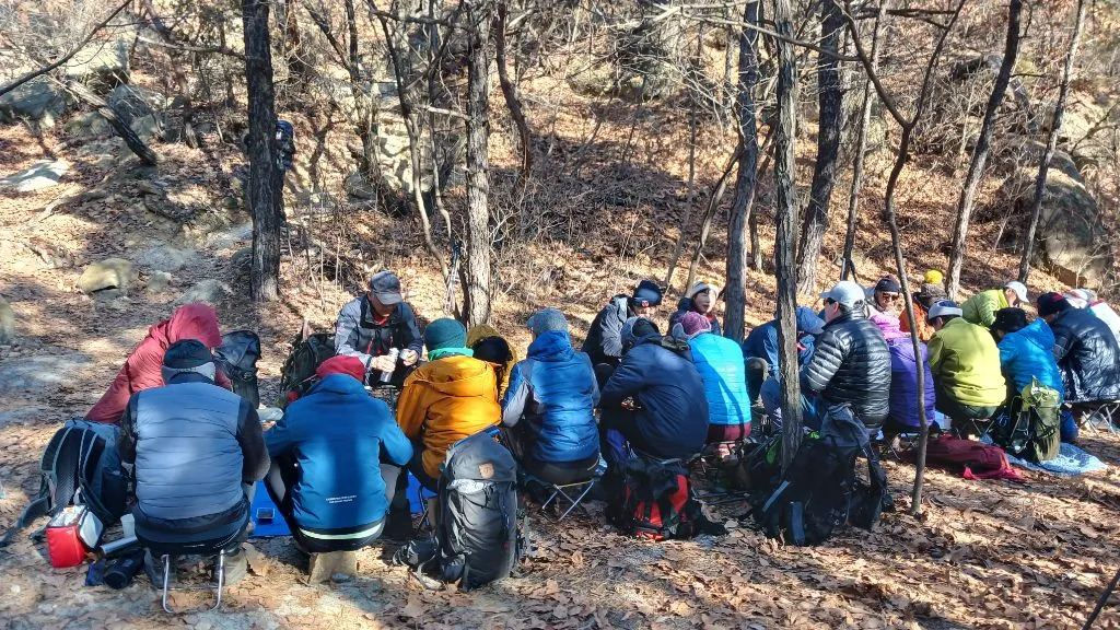 삼성산 조금 오르다가 더워서 겉옷을 벗고 산행 준비를 한다. 서로 인사하고 단체사진도 찍는다. 산길은 대체로 살방살방 걷기가 좋다. 오전 11시 40분쯤 점심식사를 한다. 날이 추울 때는 간단한 게 좋아서 튀김우동 소컵과 뜨거운 물, 밥 조금, 귤, 배, 삶은 계란을 싸 갔다. 나는 방부제가 들어간 음식, 즉 인스턴트식품 알레르기가 있어서 평소에는 라면, 과자, 사탕 같은 것을 거의 안 먹는 사람이지만, 추울 때는 뜨거운 국물이 좋아서 두어 번 라면 소컵을 싸 가고 있다. 집에서 준비할 것이 없어서 간편해서 좋긴 하다. 그런데 산행 후 집에 돌아와서는 팔, 다리, 가슴 등 몸을 계속 긁어대서 곧 후회를 한다. 다음에는 직접 만든 누룽지나 죽으로 싸 가야겠다.