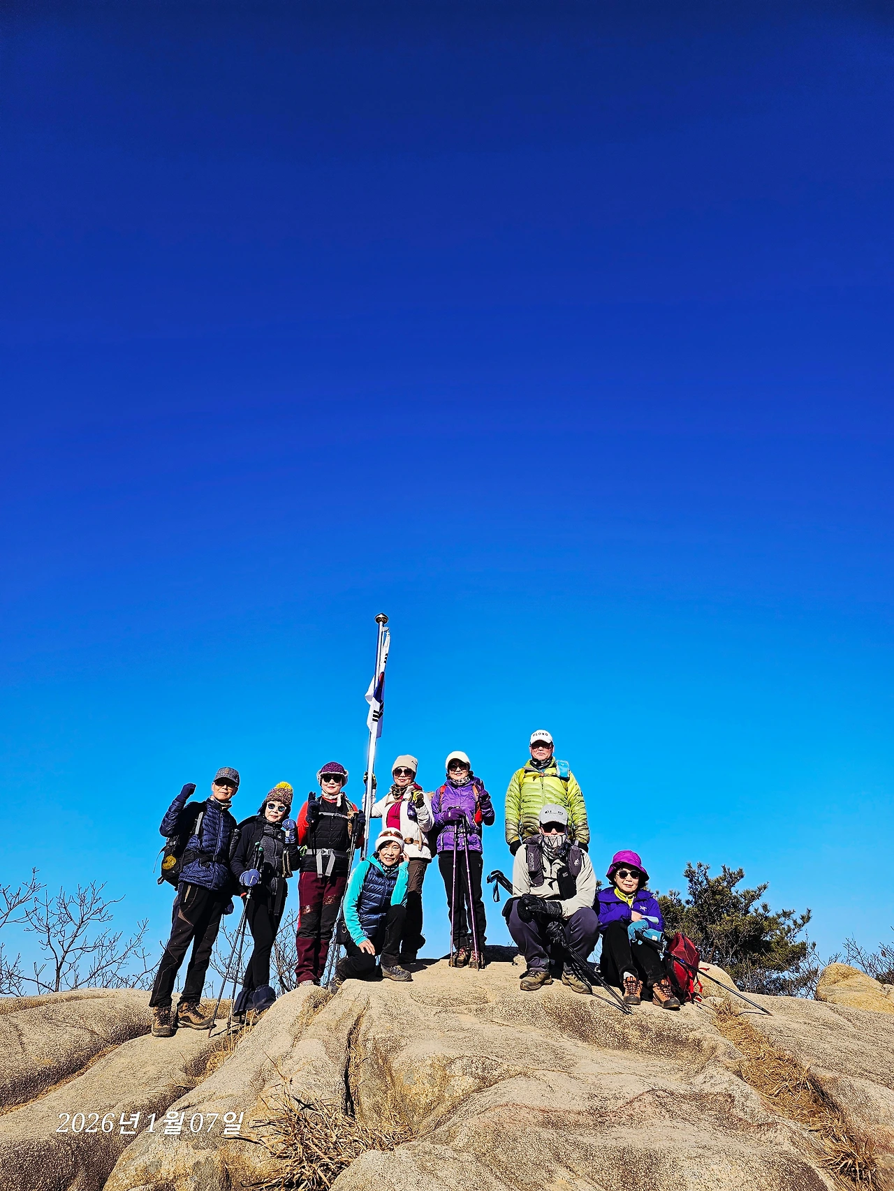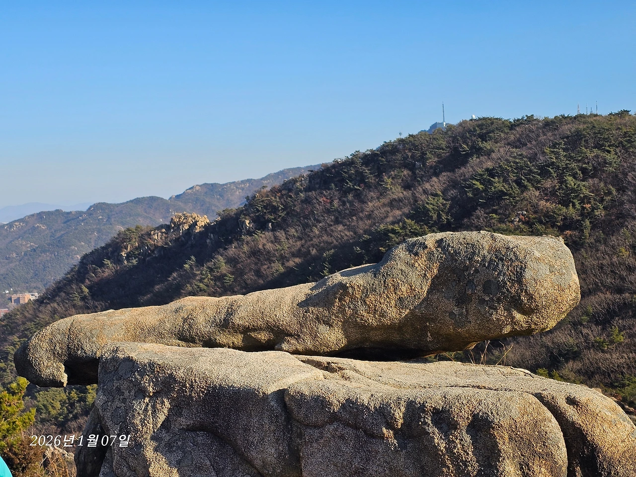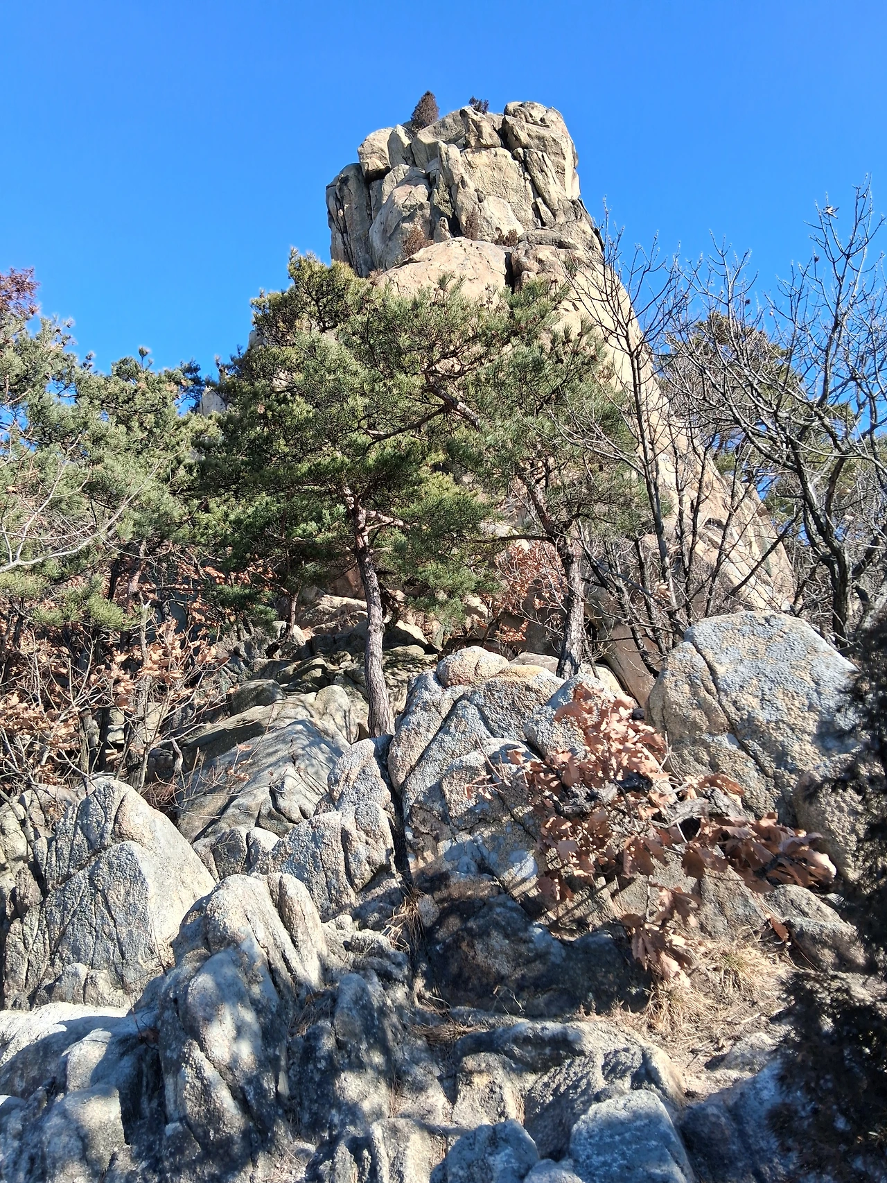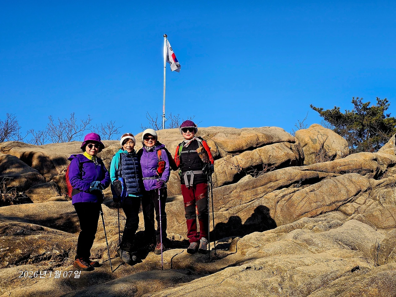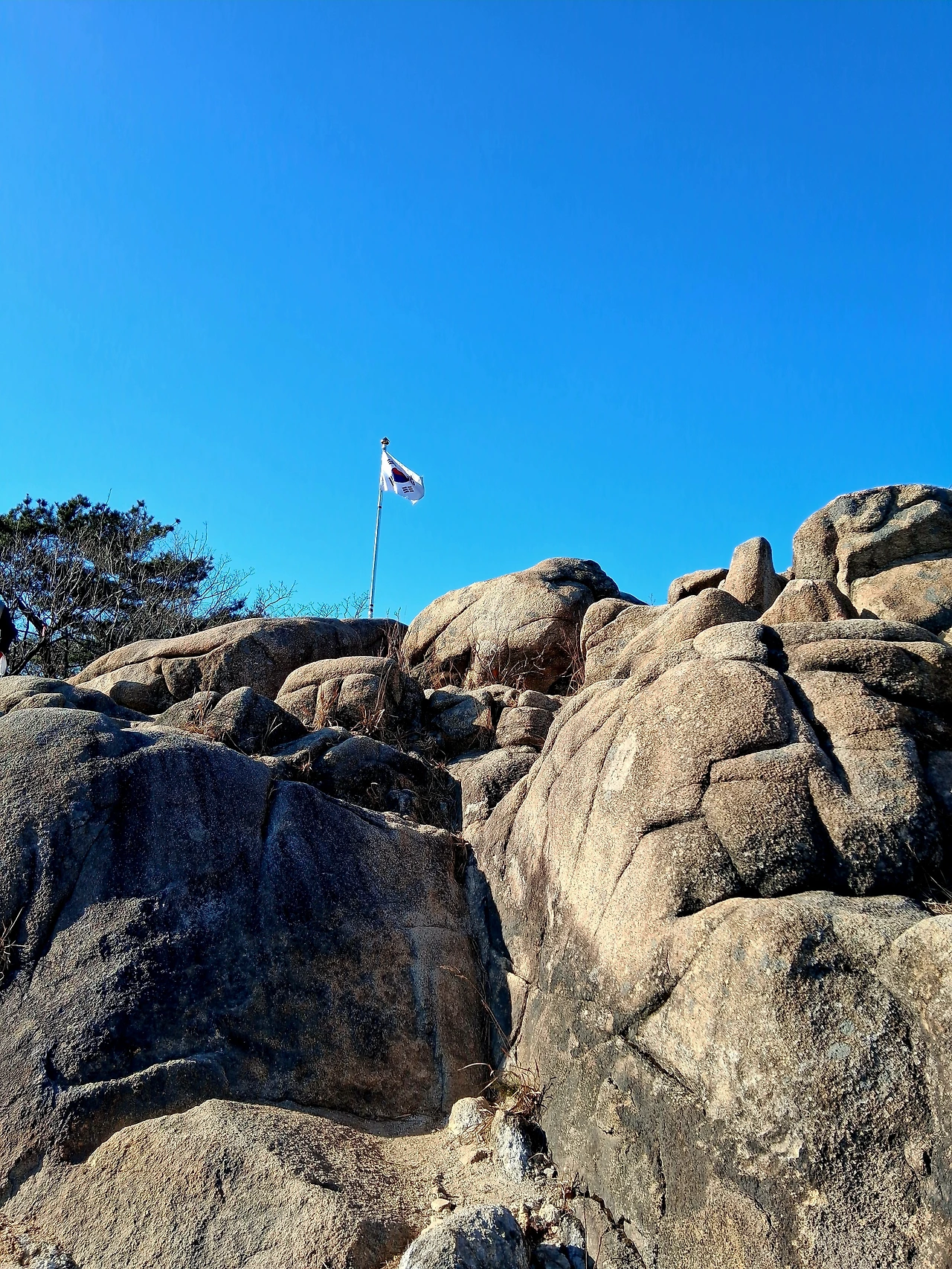 도로길 완만한 오름길 힘겹게 지나 거북바위와 장군봉을 지나간다. 삼성산과 호암산은 몇 번 갔지만 오늘은 석수역 쪽으로 내려오는 코스라 일부분 안 가본 코스가 중간에 들어가 있다. 능선길이라 대체로 흙길이 완만해서 걷기 좋지만 암릉길도 꽤 있다. 늘 지나면서 보기만 하던 호암산 국기봉을 일부러 들른다. 암릉 위에서 태극기가 휘날린다. 우람한 암릉 위로 올라가 태극기와 함께 사진을 찍는다.