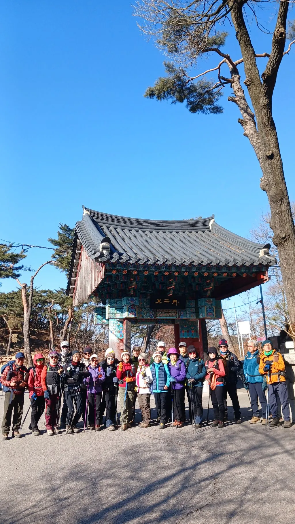 양 옆에 세로로 길게 글귀가 새겨진 불이문 앞에서 단체사진을 남긴다.