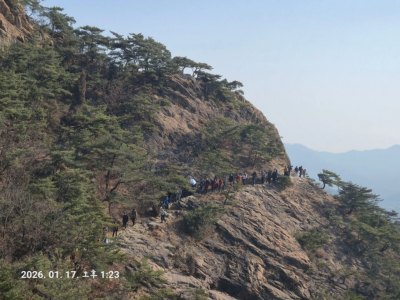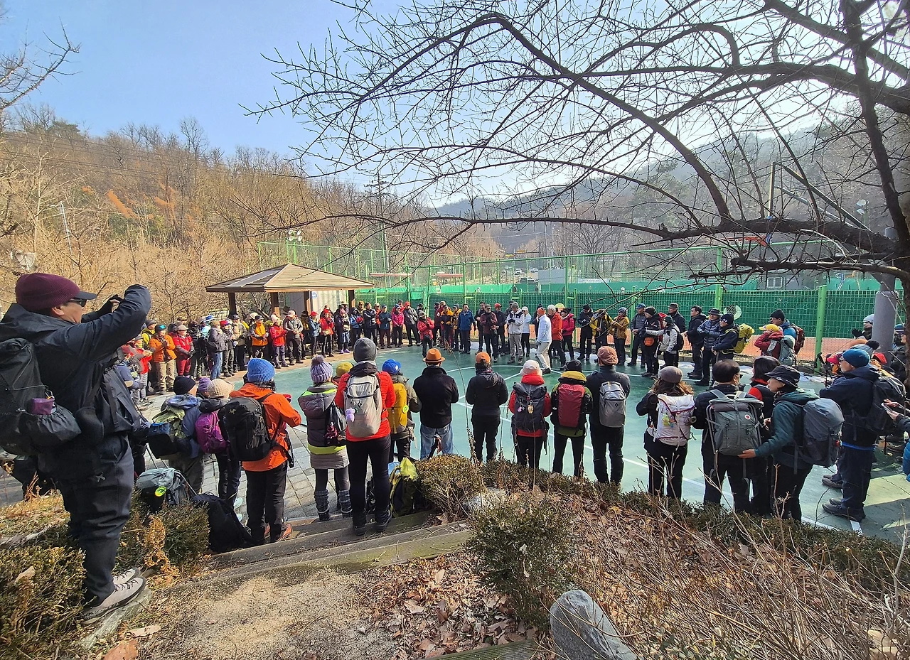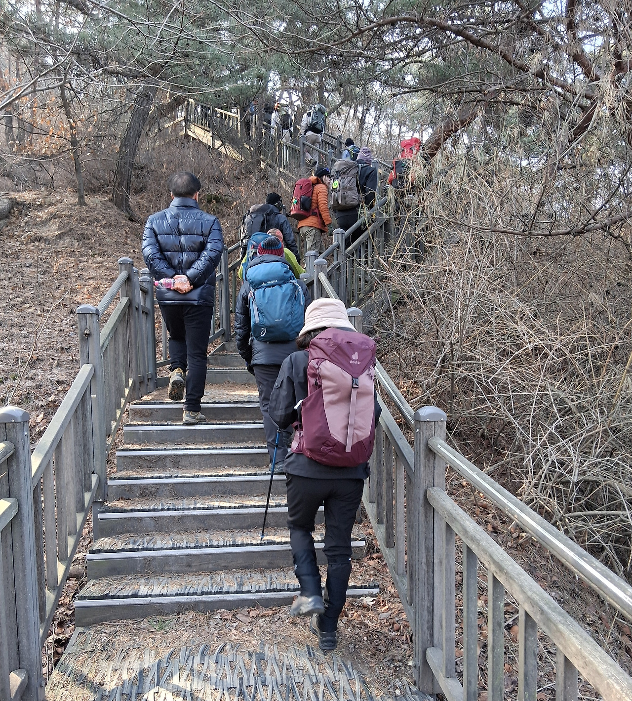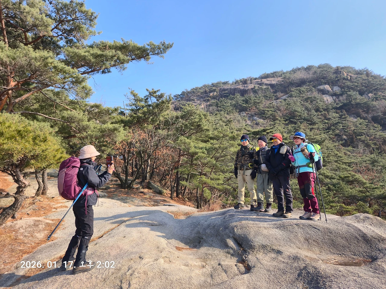 장미공원에서 축하 행사를 한다. 2026년을 이끄실 피오르 회장님이 인사를 하고 매니저 운영팀장님 사회로 진행을 한다. 열심히 산행해서 상을 받는 이들에게 축하를 보낸다. 행사를 하는 동안에도 산행을 할 때도 도란도란 재미가 있다. 살가운 여산우님이라서 동행하는 동안 내내 어째 둘이서 산행을 온 것 같은 정겨움이 있다. 가다가 강풍 대장님을 만나 함산한다. 쉬어갈 때 이정표에서 사진을 찍는다.
