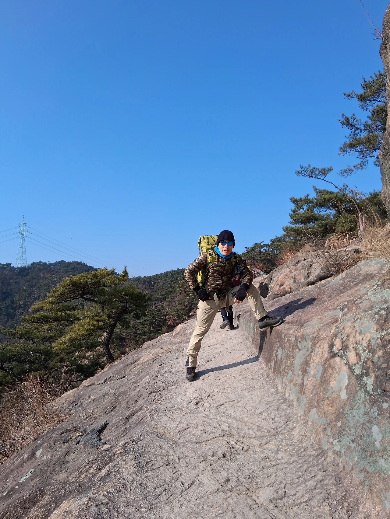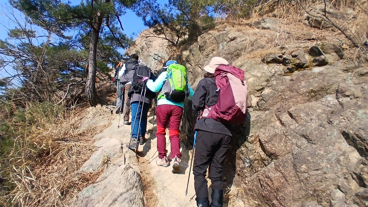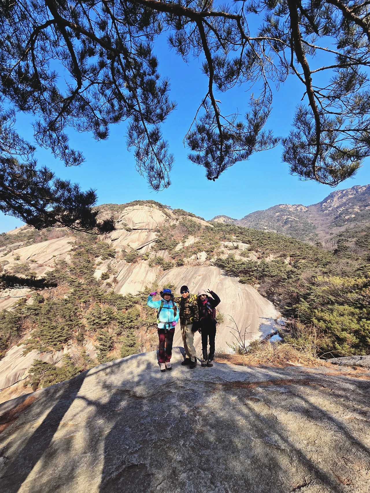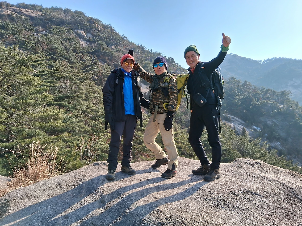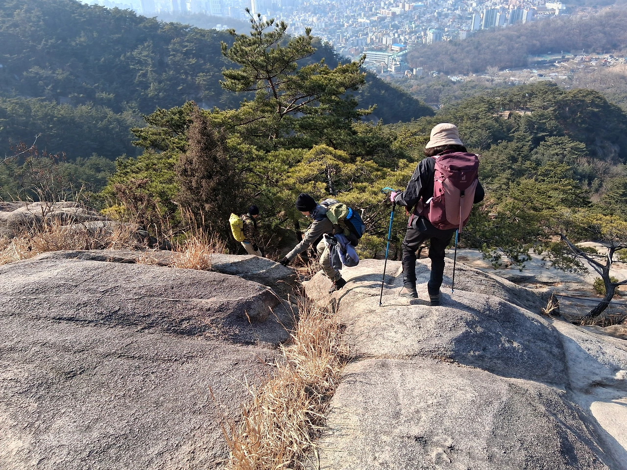 불광사 쪽으로 내려가는 암릉길에서 낙화유수 대장님, 윤달님, 아라이 대장님을 만나 또 사진을 찍는다. 배경이 향로봉 뒤쪽 봉우리인 것 같은데 정확한 이름은 모르겠다.