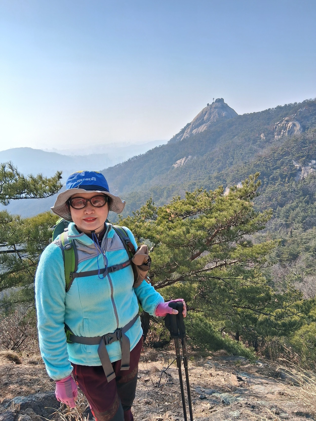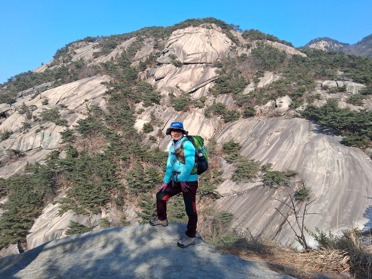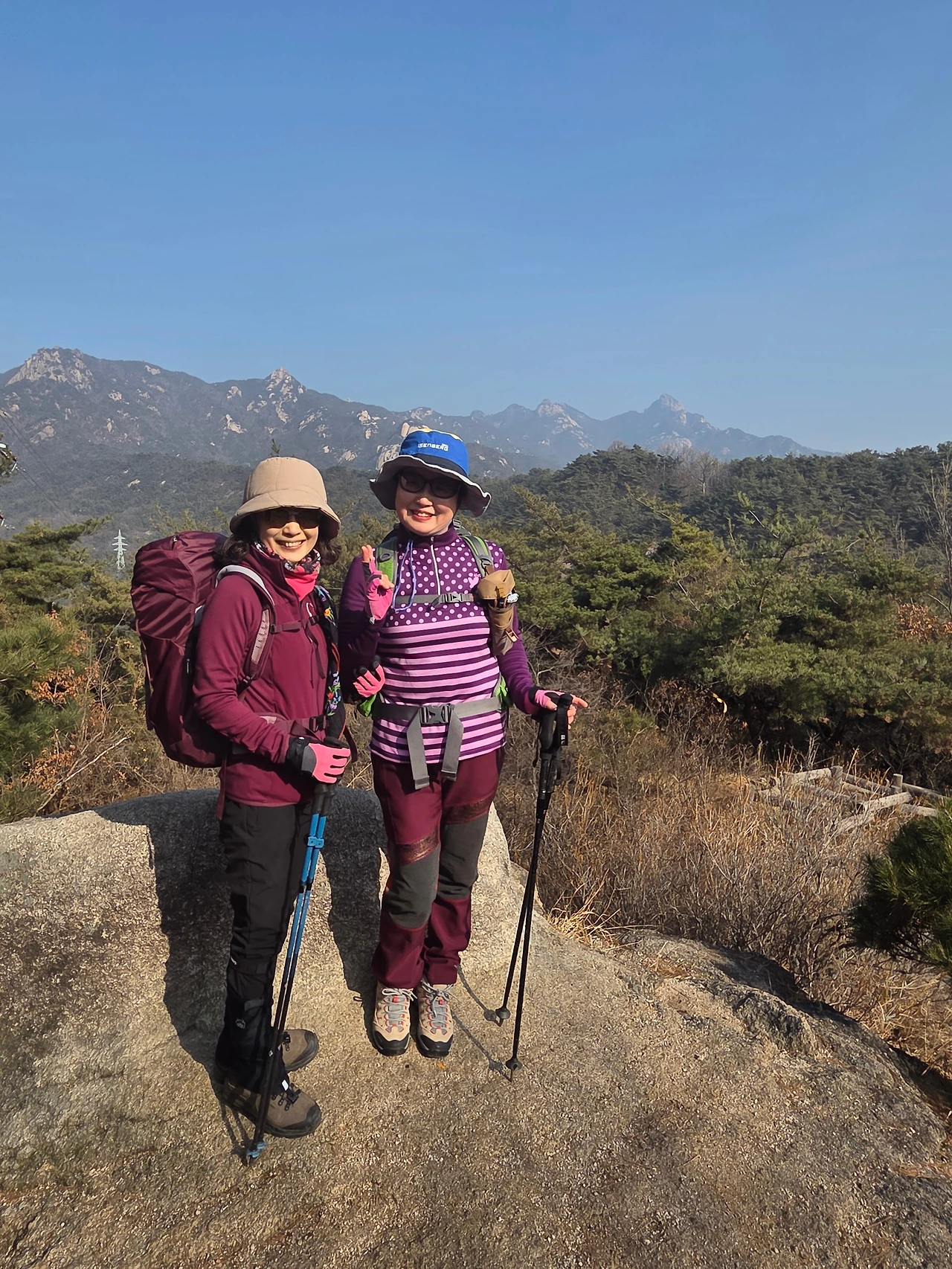 국화님이 좀 쑥스러워했지만 나는 아랑곳하지 않고 굿 포토존이 될만한 곳은 그냥 지나가지 못한다. 그러고 보니까 오늘 코스는 북한산 차마고도만 걷는 거라서 편안한 산행이다. 중간에 암릉 오름코스가 두 군데 있지만 어렵지 않다. 그래서 뭐 포토존이랄 곳도 없지만 우리는 즐겁게 족두리봉, 비봉 등 주변 봉우리들과 차마고도, 병풍 같은 암벽을 배경으로 서서 예쁜 사진을 남긴다.