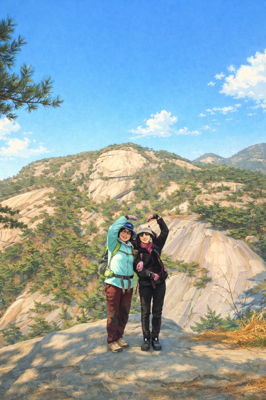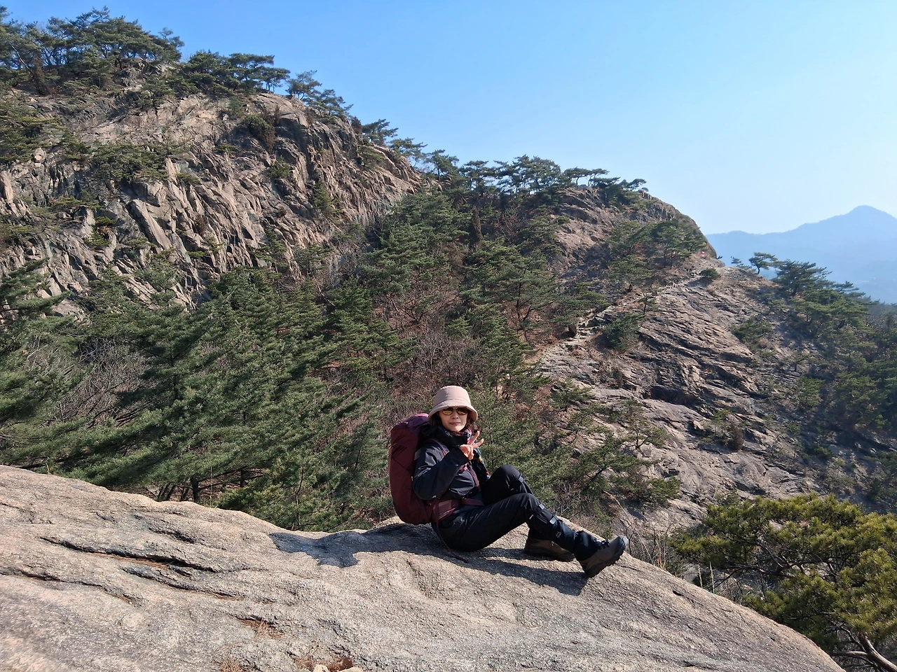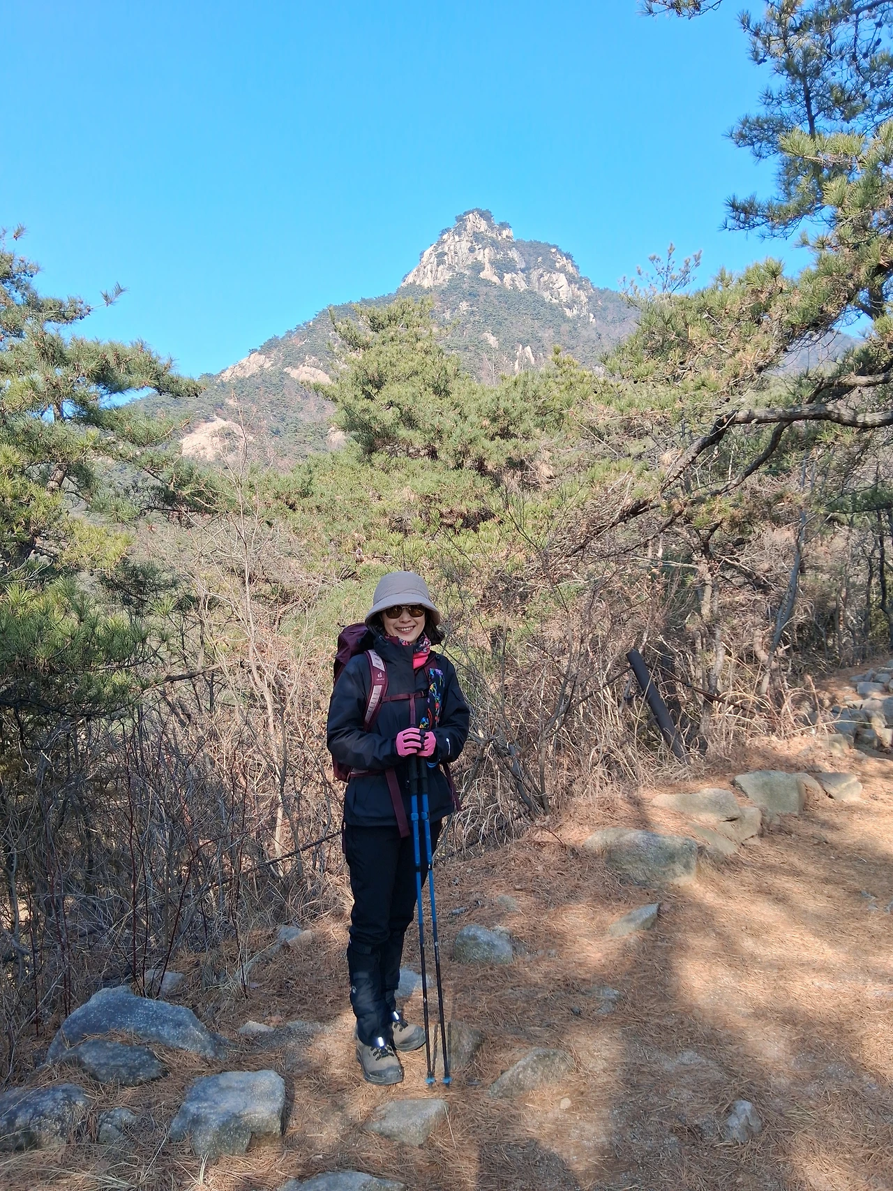국화님이 좀 쑥스러워했지만 나는 아랑곳하지 않고 굿 포토존이 될만한 곳은 그냥 지나가지 못한다. 그러고 보니까 오늘 코스는 북한산 차마고도만 걷는 거라서 편안한 산행이다. 중간에 암릉 오름코스가 두 군데 있지만 어렵지 않다. 그래서 뭐 포토존이랄 곳도 없지만 우리는 즐겁게 족두리봉, 비봉 등 주변 봉우리들과 차마고도, 병풍 같은 암벽을 배경으로 서서 예쁜 사진을 남긴다.