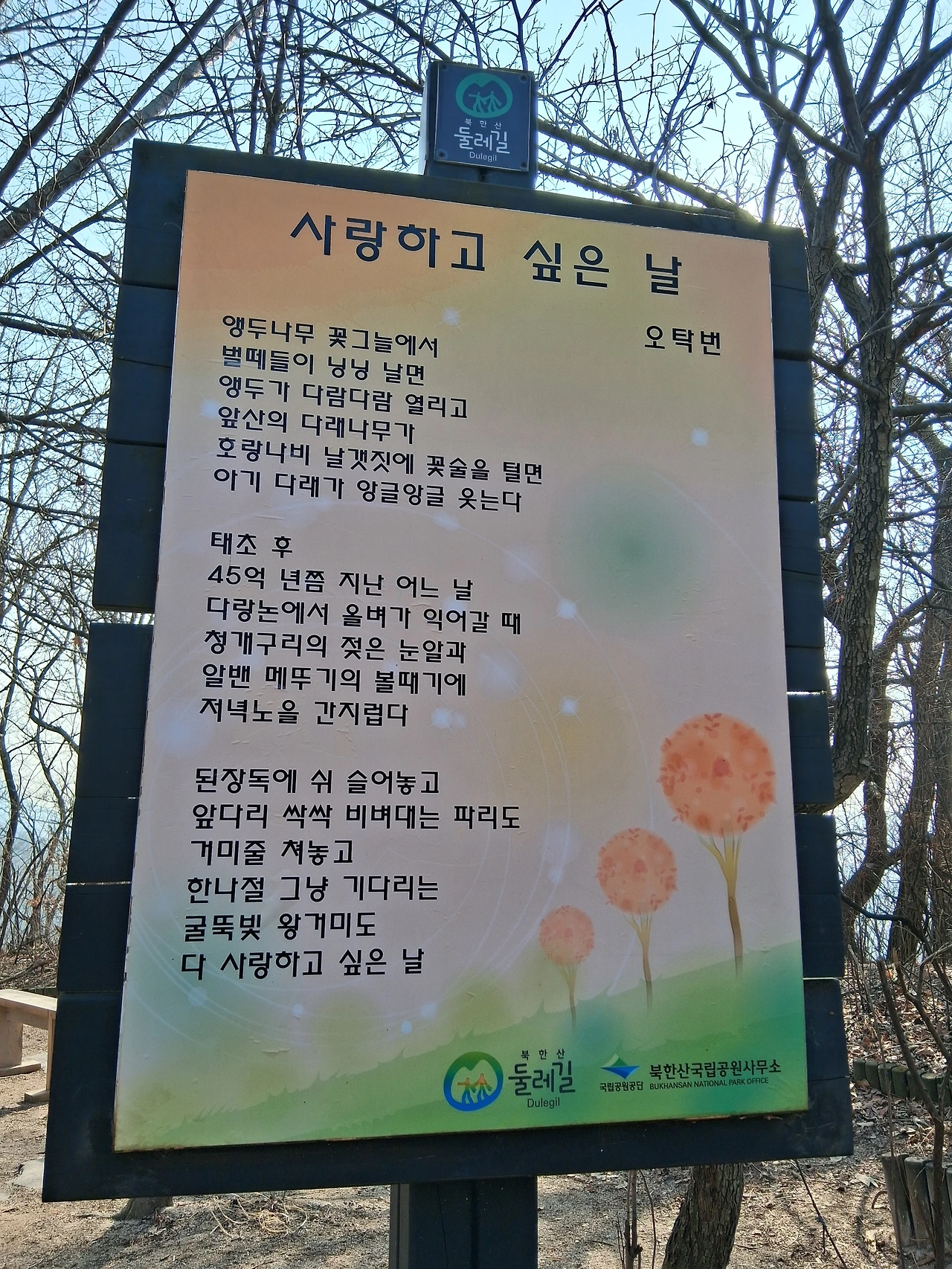 다시 걷다가 정자 옆에 있는 시비가 눈에 띄어 담아본다. 오탁번 시인의 <사랑하고 싶은 날>이다. 자연 속에서 만나는 모든 것이 다 사랑하고 싶은 날이라는 의미를 담고 있다.