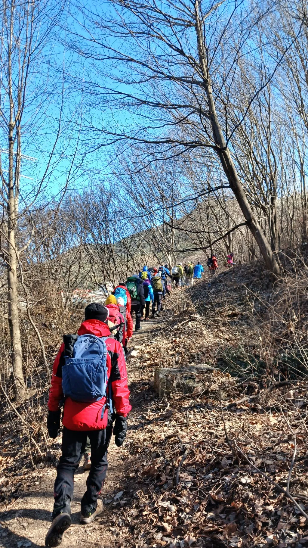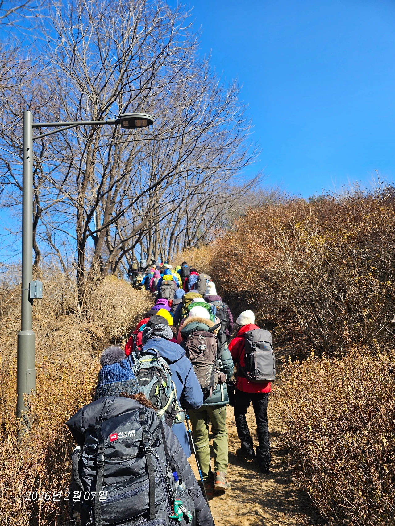 시간이 되자 인테리어 지기 대장님 인사를 하고, 조운, 콜럼보, 징검 세 대장님 소개를 하고 등극 선물을 드리고, 산행 안내를 한 후 단체사진 찍고 출발한다. 일기예보 방송은 날씨가 춥다고 난리이지만 그리 춥지는 않다. 영하 5도, 4도는 딱 산행하기 좋은 날씨이다. 70여 명이 한꺼번에 움직이니 도로가 꽉 찬다.