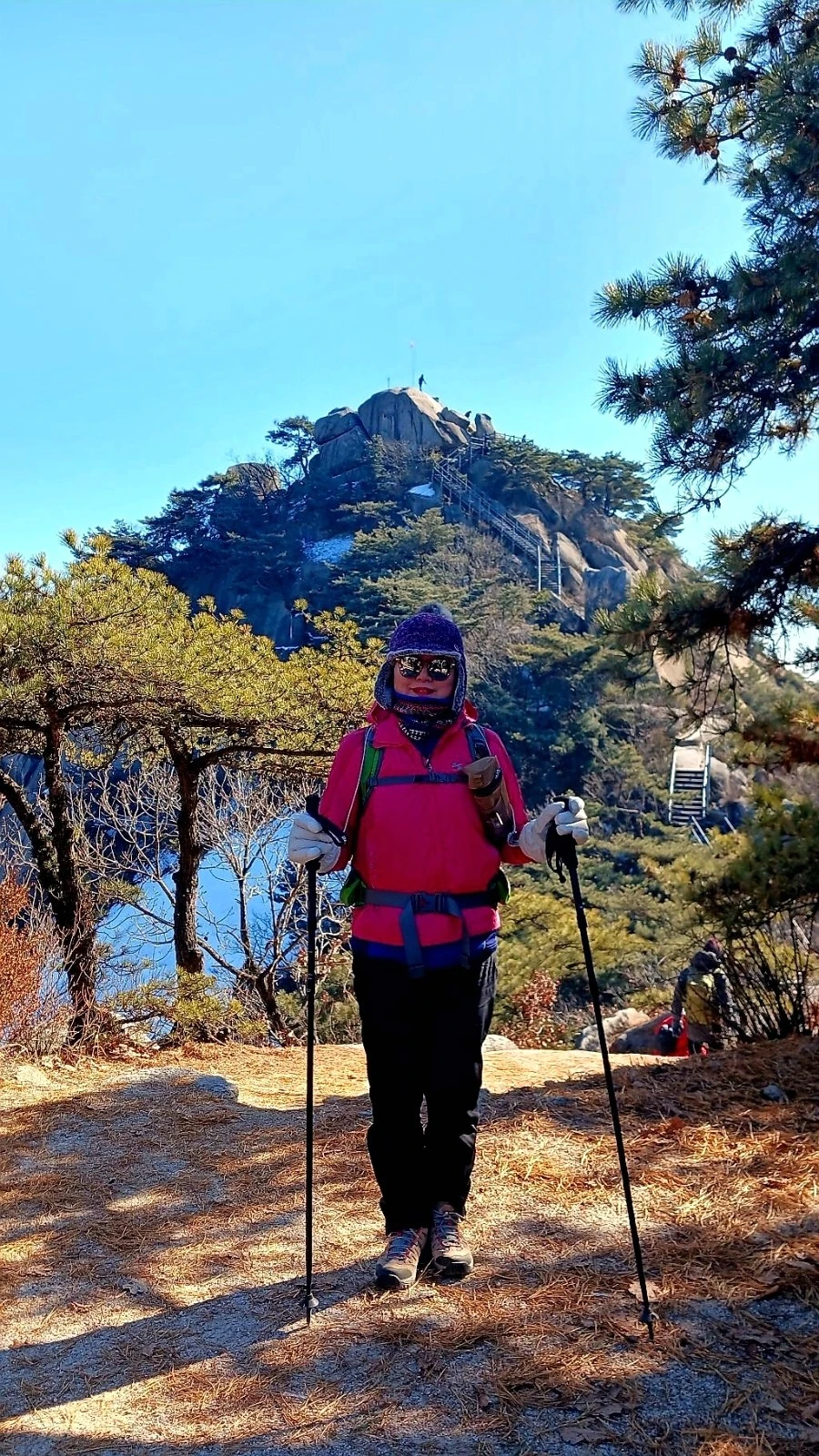 반달님과 해무리님도 나와 보폭이 비슷해서 거기서 멈춰 선다. 반달님도 바로 내려가는 줄 알았는지 스틱을 꺼내서 편다. 짬을 이용해서 해무리님에게 내 폰을 내밀고 사진 부탁을 한다. 가로로 한 장, 세로로 한 장, 두 장 찍어주었다.