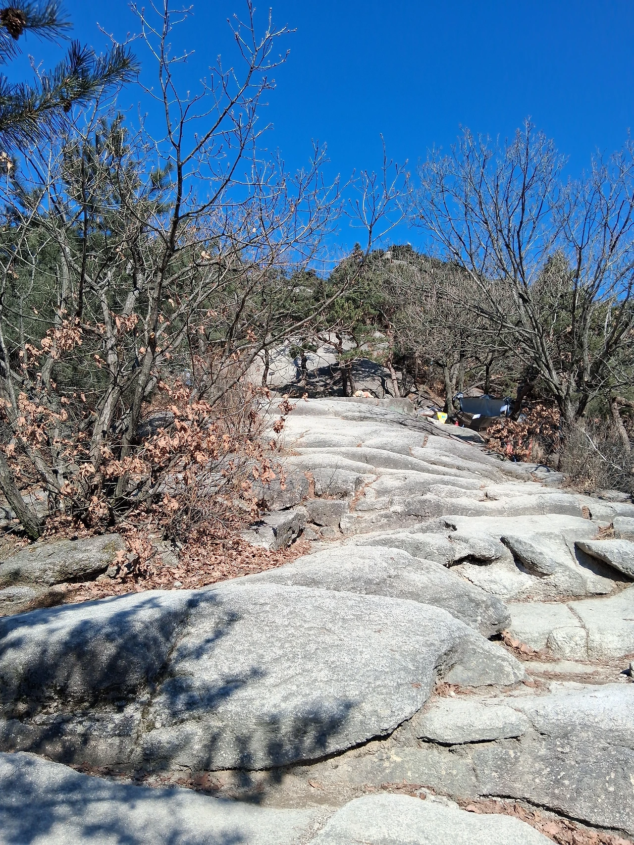 하산길 초반은 가파른 암릉길 로프구간이다. 작년에 H 대장님과 함께 정상 밟고 내려왔던 길이라 한 손에는 스틱을 들고 한 손으로는 로프를 잡고 쓱쓱 밀면서 잘도 내려온다.