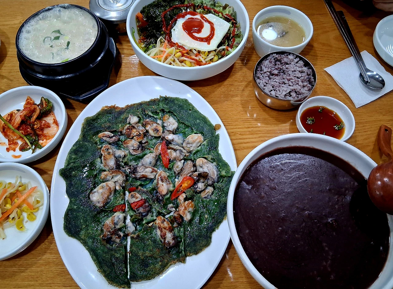 친구들이 <백년옥>은 '순두부로 유명한 집'이라고 '순두부전골을 먹자'고 하는데, 우리 테이블은 따로 몇 가지를 시켜서 나누어 먹자고 한다. 다른 테이블도 우리를 따라서 골고루 주문해서 나눠먹기로 한다. 우리 테이블은 들깨순두부, 동지팥죽, 매생이굴전, 야채비빔밥 등을 시켰는데 푸짐하다. <백년옥> 음식은 정갈하고 맛이 있다. 들깨순두부는 구수하고, 동지팥죽은 달지 않으면서도 깊은 풍미가 있다. 매생이굴전은 굴이 들어가 있어서 하나씩 씹히는 맛이 달큼하면서도 고소하다. 야채비빔밥이 제일 인기가 없었는데. 그냥 집에서 온갖 야채를 섞어서 해 먹는 것처럼 평범해서이다. 돌솥비빔밥이었으면 딱 구색이 맞았을 것 같다. 그렇지만 우리들은 '맛있다 맛있다' 하면서 먹는다. 다 먹고 나니 배가 너무 부르다. 맛있는 음식 앞에서는 늘 과식이 문제이다. 저녁시간에 카페인 영향이 없는 친구들은 커피까지 마시고 7시 전에 예술의 전당으로 간다. 이슬비가 살짝 내리고 있어서 양우산을 꺼내 쓰고 둘씩 함께 쓰고 간다.