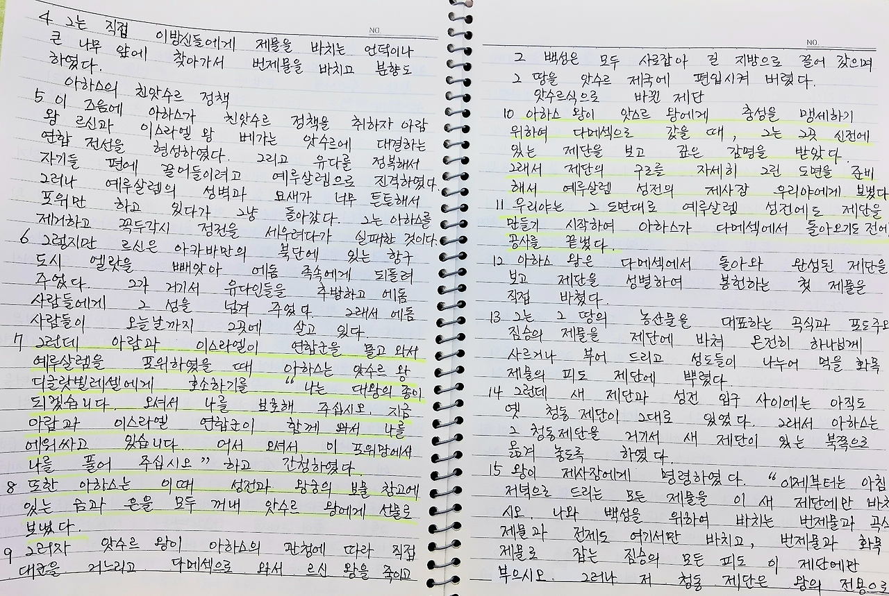 그런데 이것이 남유다가 망하는 화근이 되고 만다. 아하스는 하나님의 제단까지 이방신을 섬기는 앗수르의 도면대로 바꾸고 거기에서 엉터리 제사를 지낸다. 하나님께서 명하신 제사법을 전혀 따르지 않는다. 백성들이 나누어 먹어야 하는 화목제물의 피도 불살라 바친다. 물두멍도 없애고 청동 제단도 새 제단 옆으로 옮겨간다. 성전에 있는 왕의 예배 자리도 특별 통로도 없애 버린다.