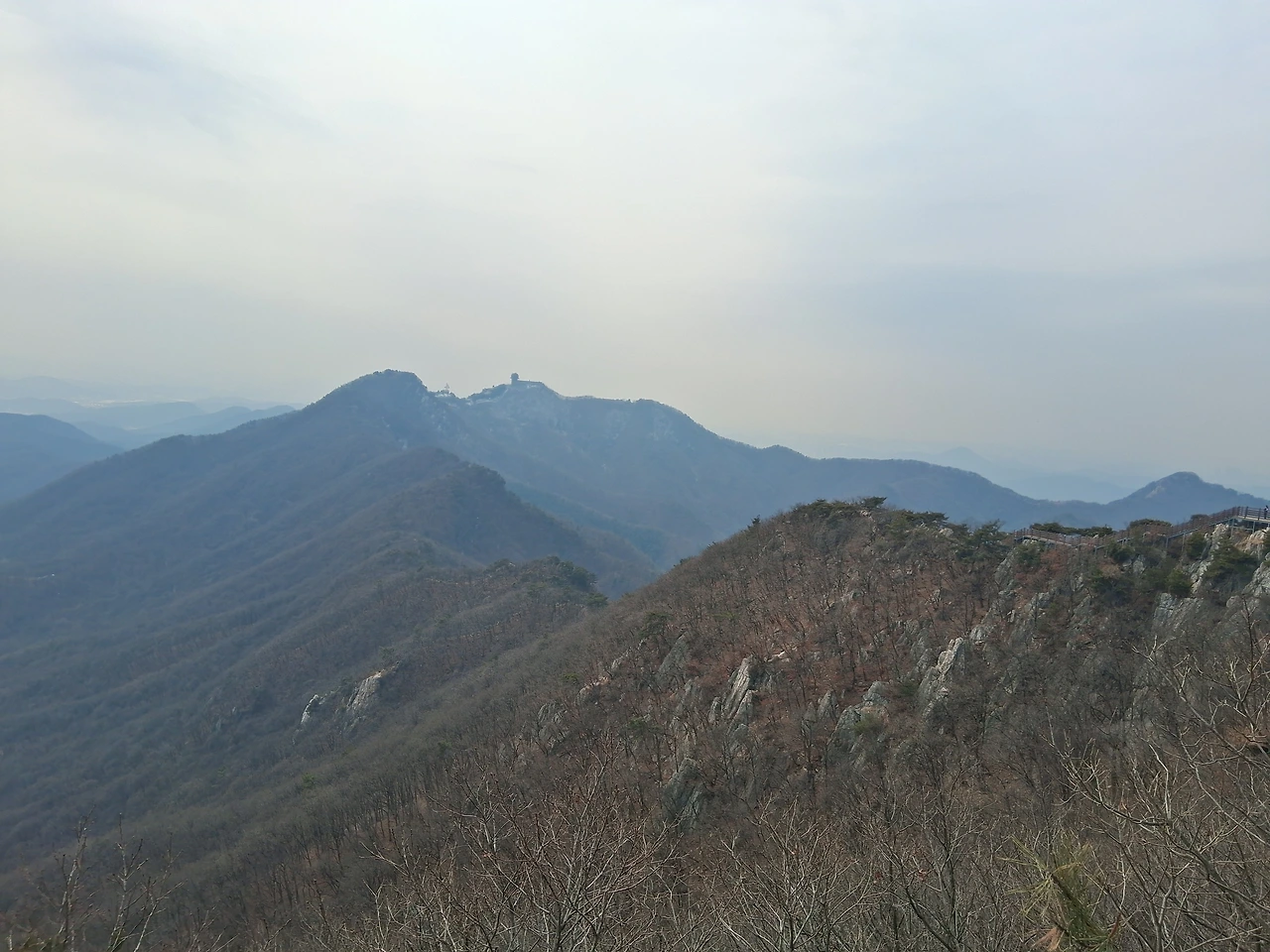 가파른 데크길과 암릉길을 올라가니 널찍한 전망데크가 나오고 슬기봉 쪽인지 태을봉 쪽인지 봉우리들 조망이 된다. 거기서부터는 암릉길이 꽤 있다. 그렇지만 또 우회로가 있어서 나는 그 길로 간다. 관모봉 오르는 마지막 구간도 암릉길이다. 위험하지는 않다. 암릉길 끝에 태극기가 휘날리는 게 먼저 보인다. 반갑다.