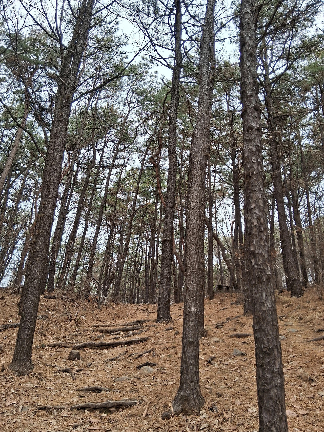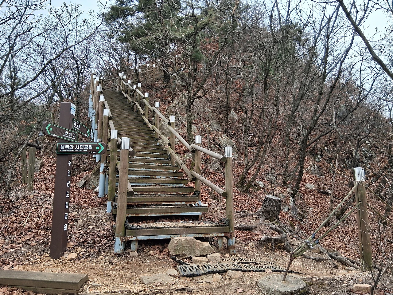 내가 산악회에서 늘 가던 가운데 가파른 길로 올라가니 조금 있다가 그 남자가 오른쪽 완만한 길로 올라와 내 앞에서 간다. 중간에 길이 합쳐지기 때문이다. 마주치고 싶지 않아서 가다가 한참 아래를 내려다보며 해찰을 한다. 관모봉 가는 가파른 길로 오르니 저 앞쪽에서 또 보인다. 조금 더 가니 관모봉과 수리산둘레길 분깃점이 나오는데 그곳 나무의자 쉼터에 그 남자가 앉아 있다. 간격을 두고 나이 든 남녀 두 사람이 또 다른 의자에 앉아 있다가 일어서서 둘레길로 간다. 나는 그 남자가 무서워서 관모봉 포기하고 두 남녀를 따라 둘레길로 들어선다. 남자가 뒤에 가는 나를 쳐다본다.