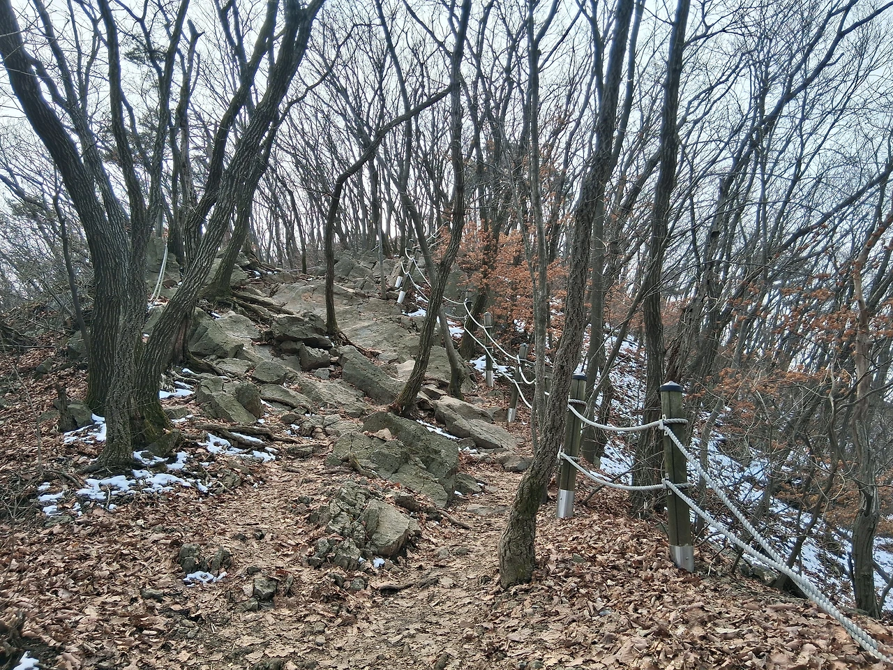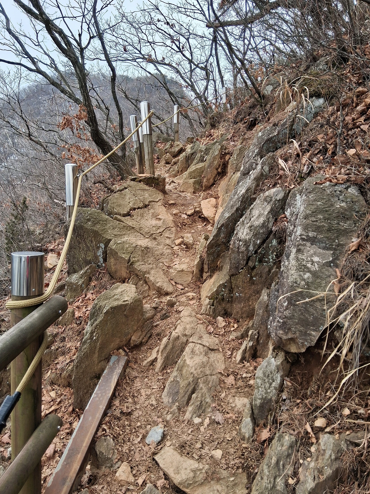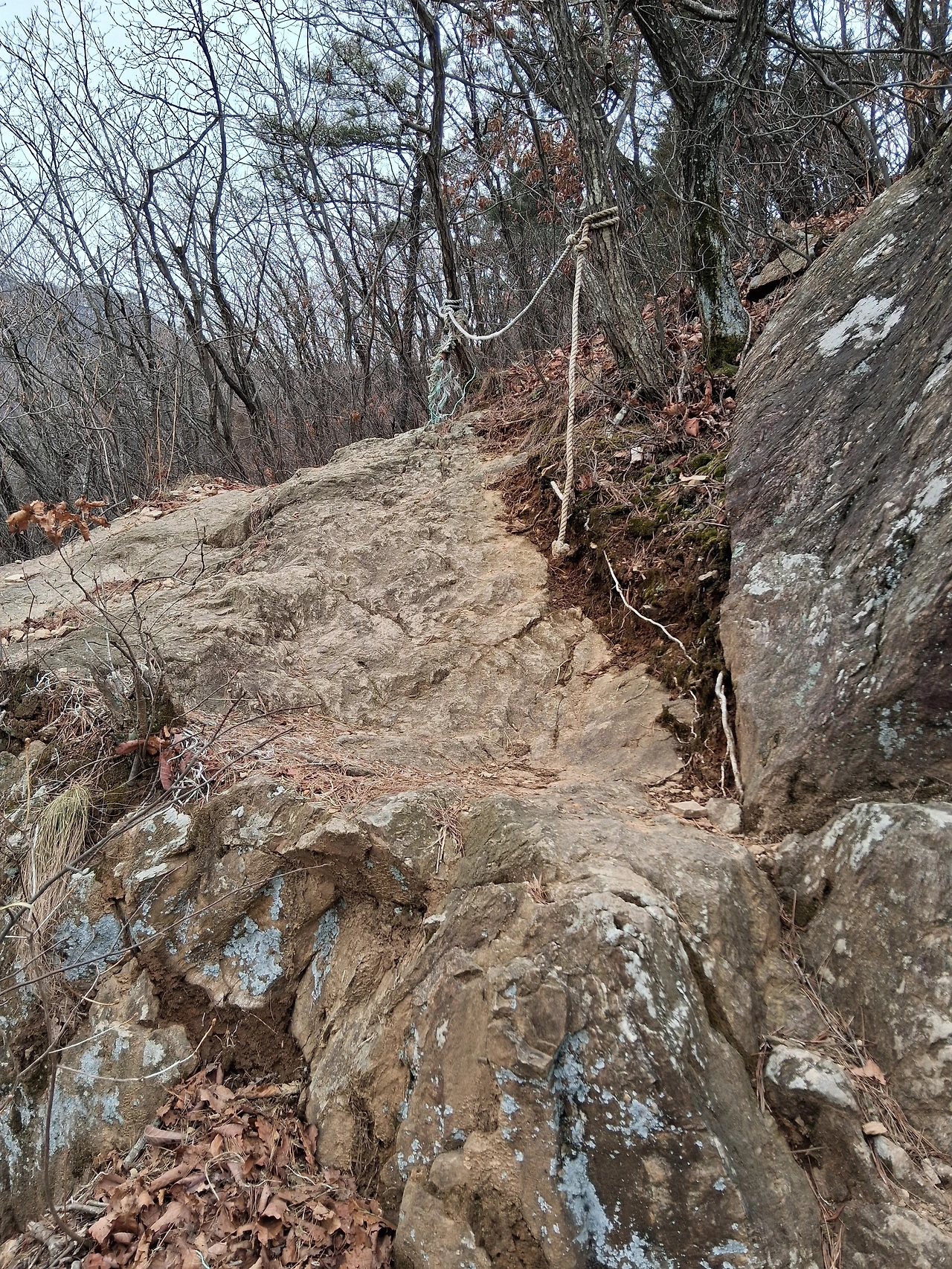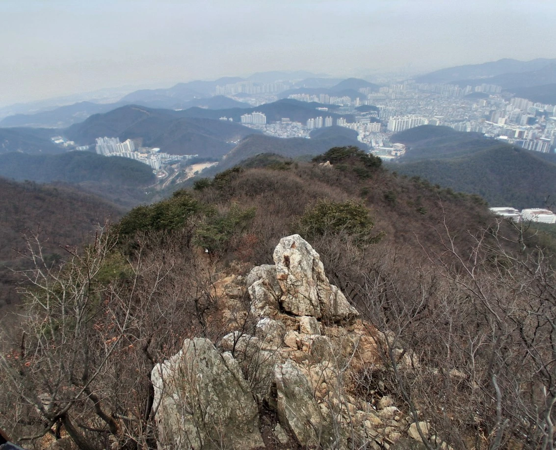 관모봉까지는 계속 오름길이다. 조금 가파른 길이다. 암릉길도 있지만 험하지는 않고 오르기가 좋다. 몇 군데 암릉 조망터가 있는데 시내가 한눈에 내려다보인다. 어디가 어디인지 잘 알 수는 없었지만 탁 트인 공간에서 발아래를 조망하는 기분은 시원스럽다. 비스듬한 암릉길에 짧은 줄이 달려 있다.