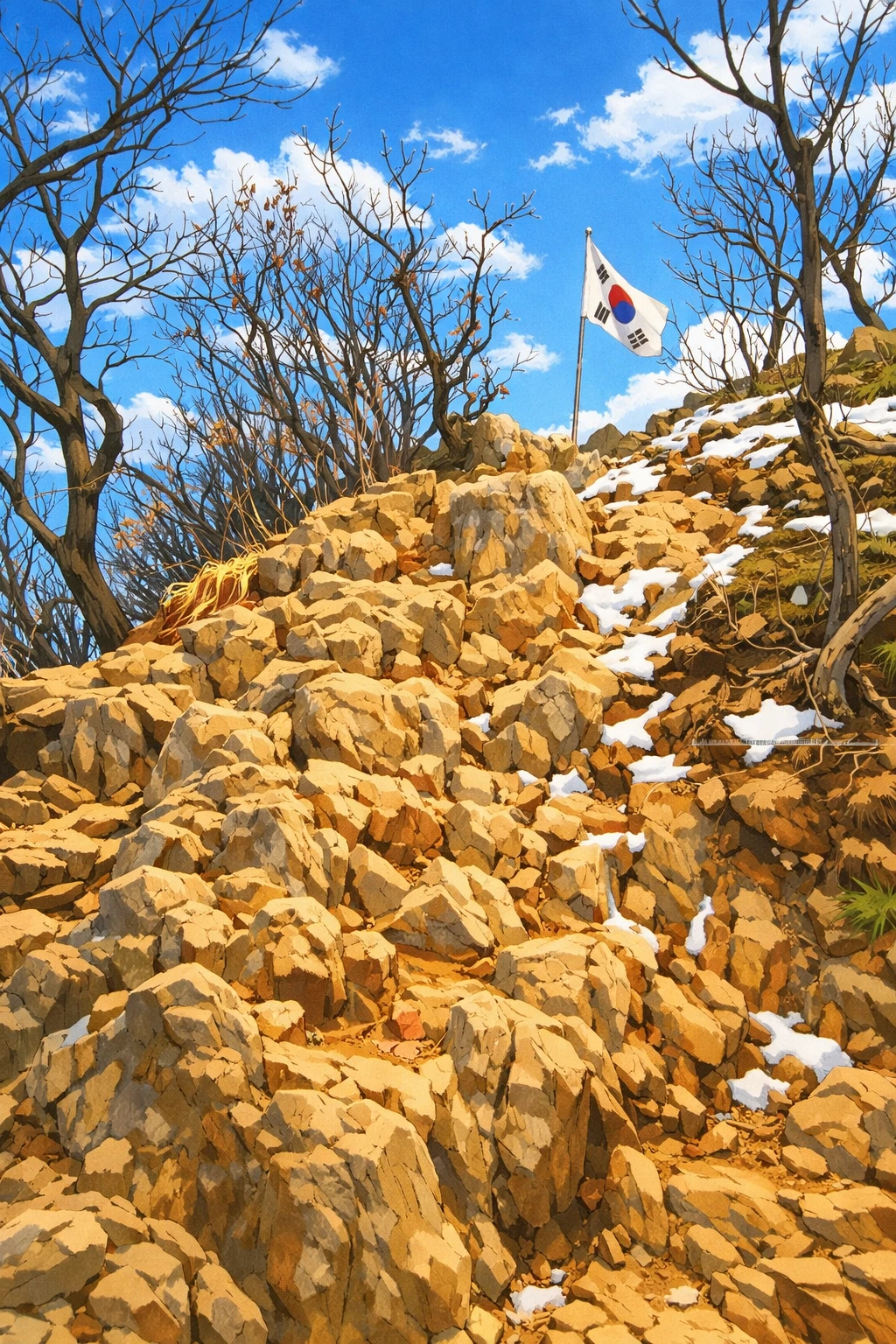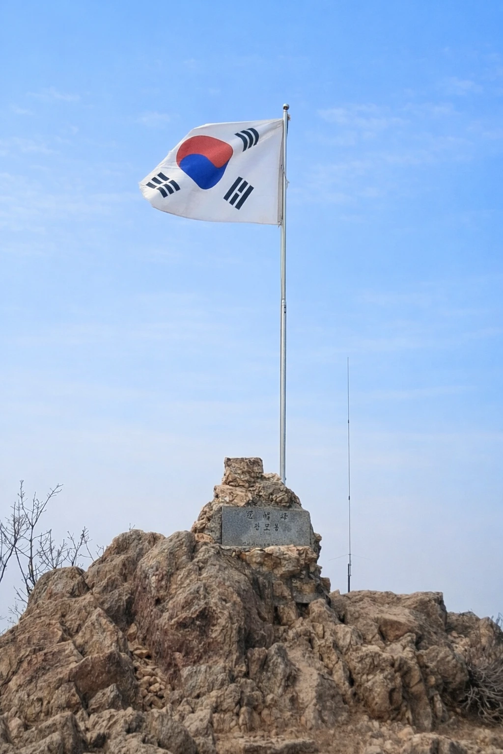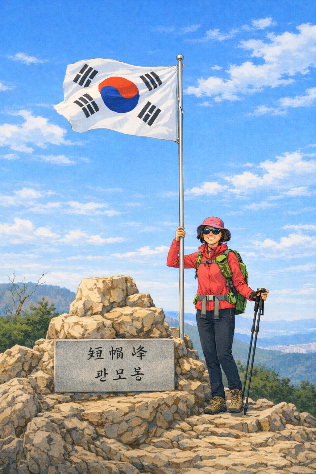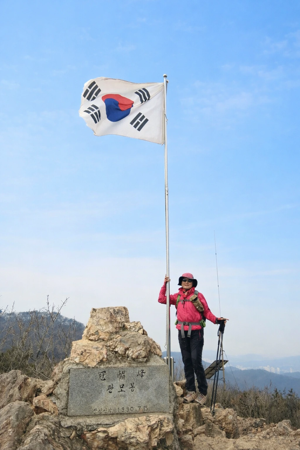 여자는 관모봉 표지석과 그 위에서 나부끼는 태극기가 다 나오게 여러 장 찍어준다.