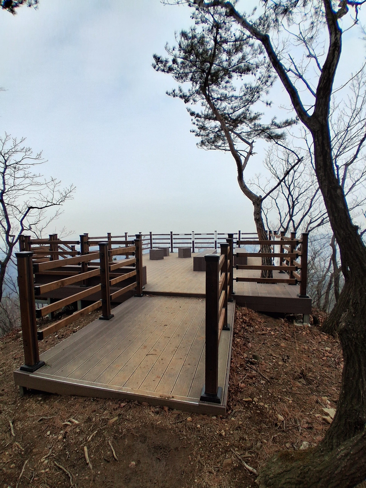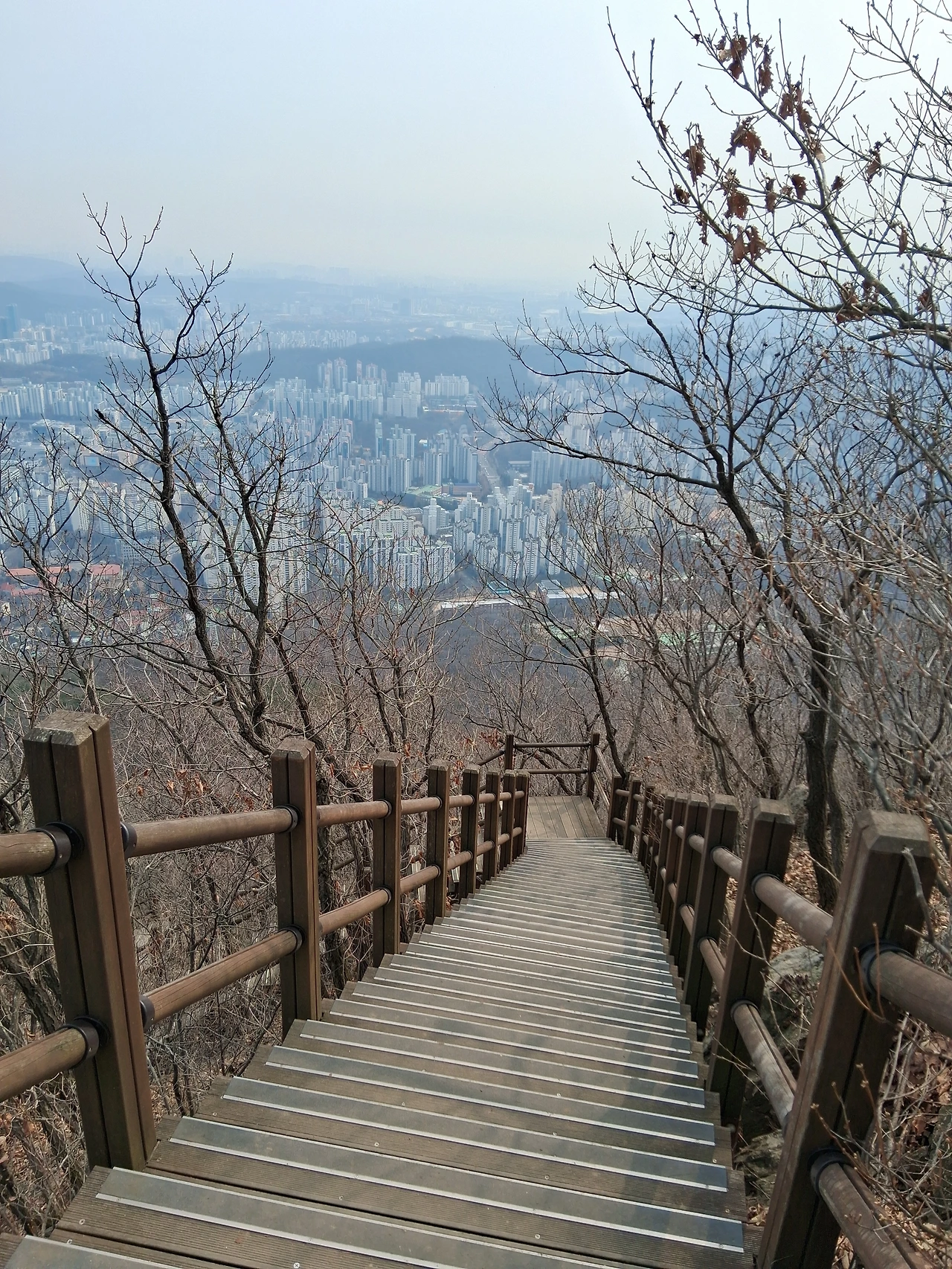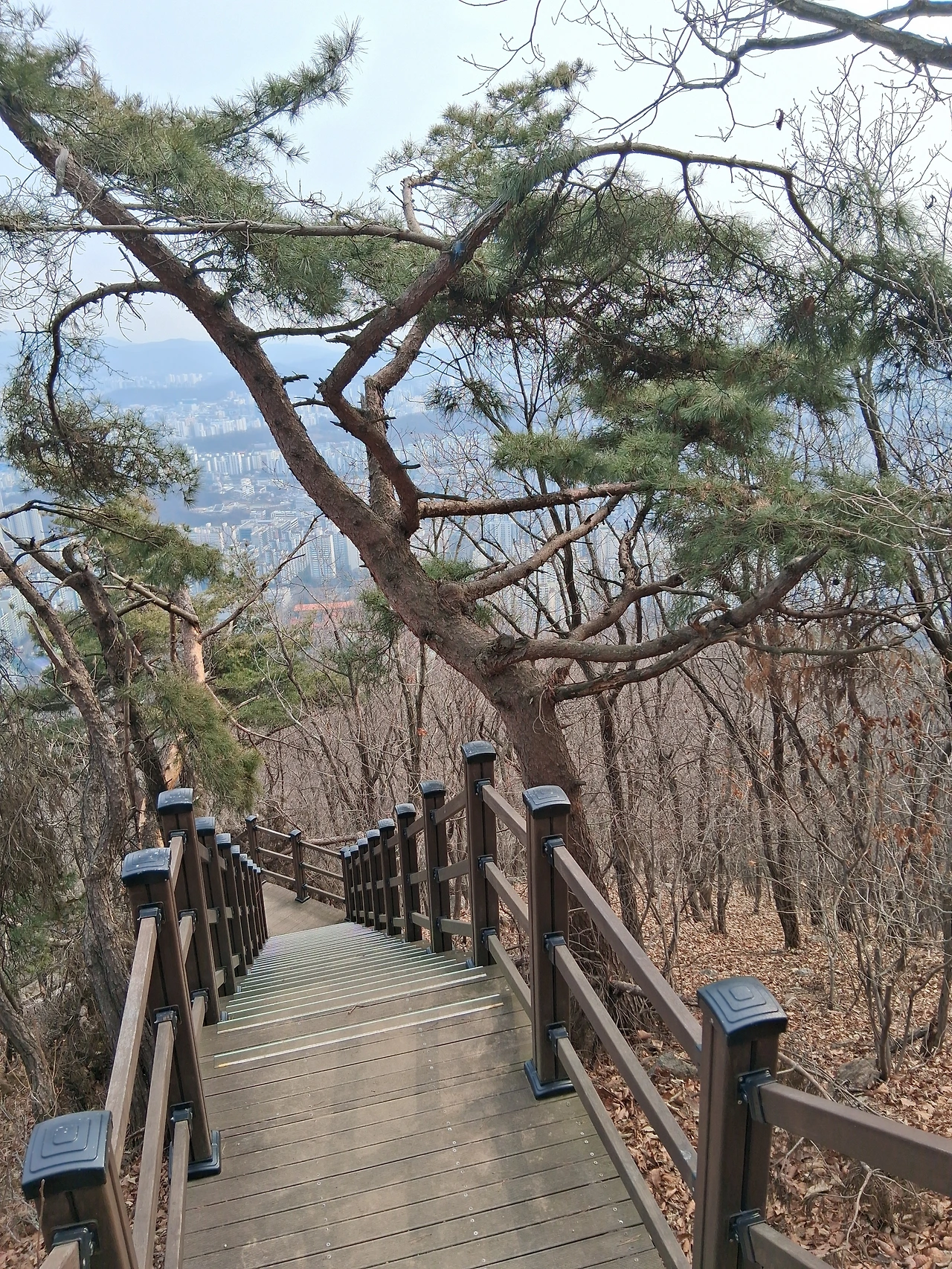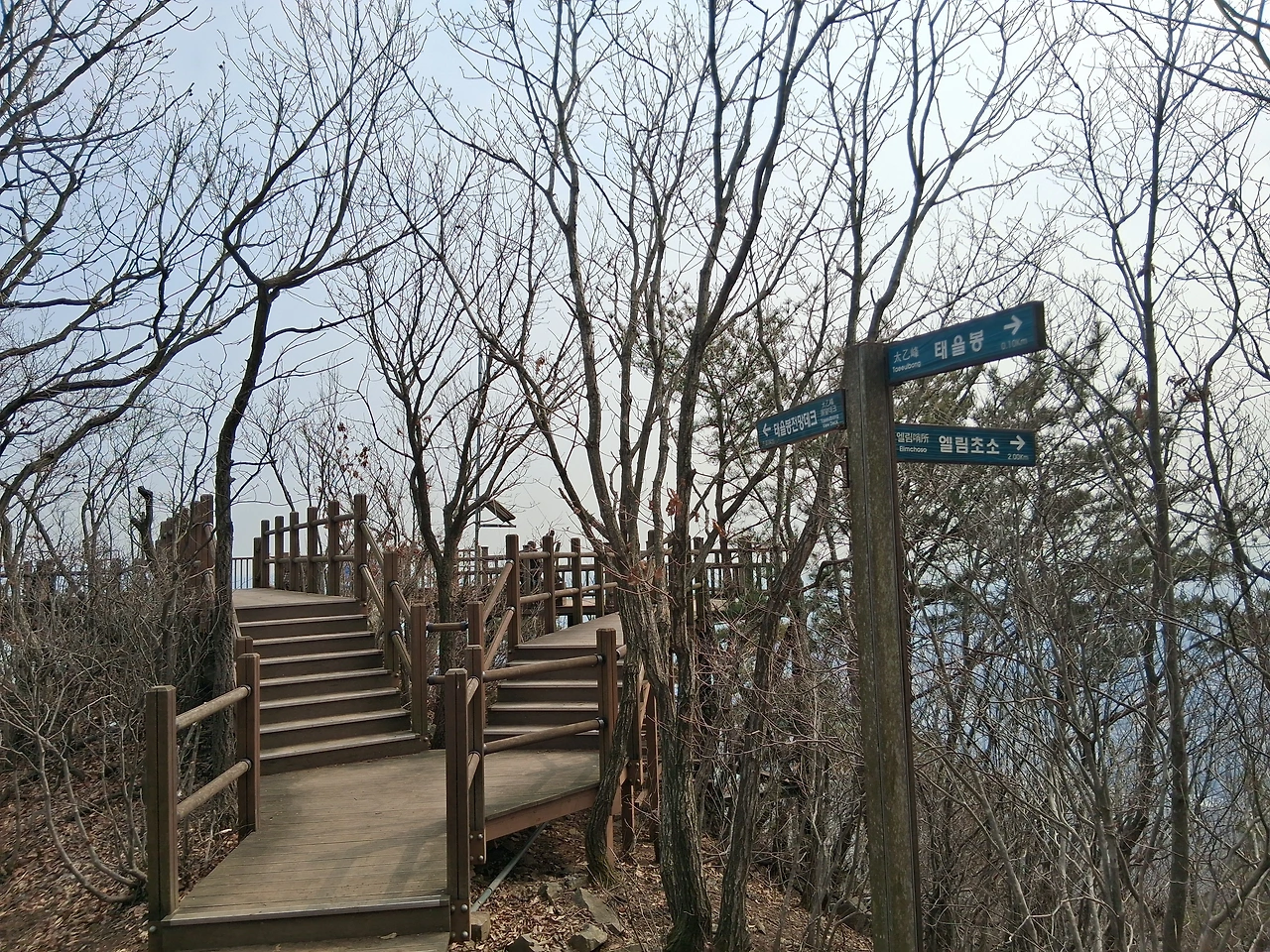 태을봉 전망대에서 남자 두 명이 의자에 앉아 쉬고 있다. 한 남자는 신문을 뒤적이고 있다. 조망터 사진을 찍고 가파른 데크계단이 이어지는 길을 휘리릭 내려간다. 오를 때는 계단이 힘들어도 내려갈 때는 쉽다.