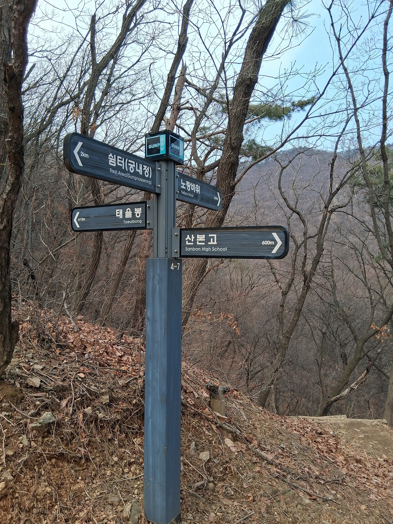 나는 슬기봉은 한 번도 안 가봐서 다음 기회에 가보리라 기약을 하며 군포문화회관 쪽으로 내려오기로 한다. 이정표를 보니 2km이다.