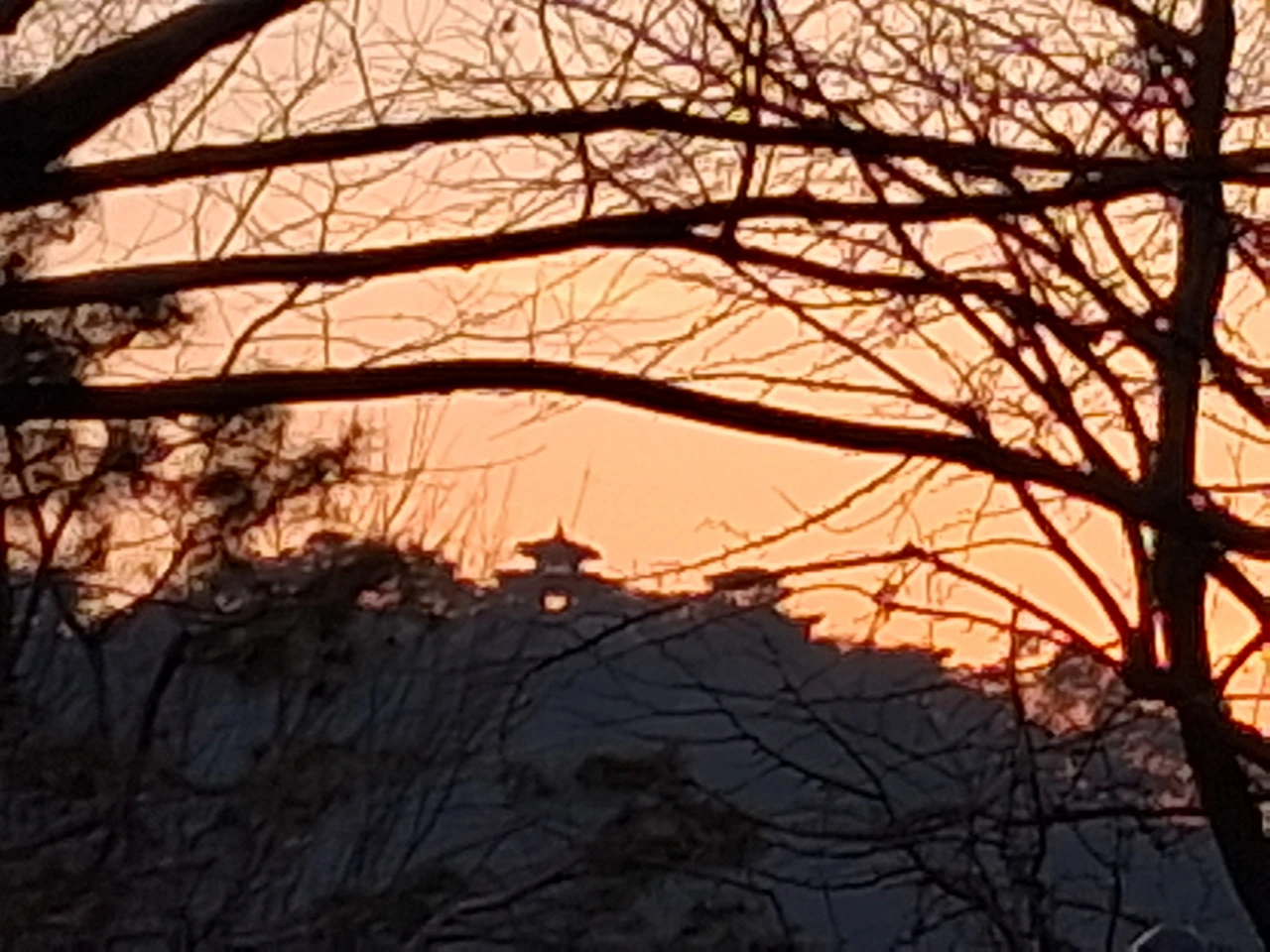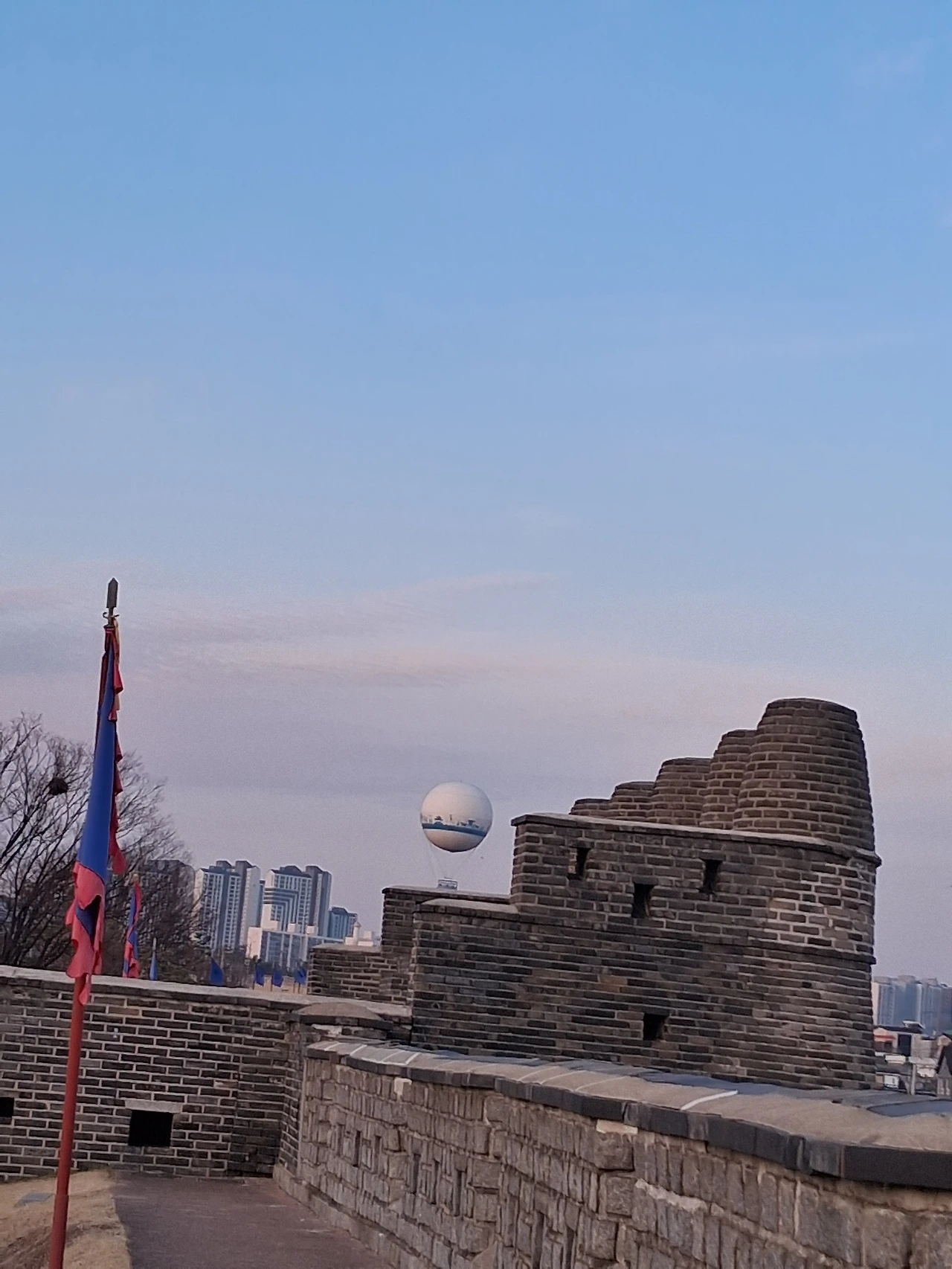 저녁 6시 30분이 막 지난 시간이라 아직 날이 어둡지 않아 수원화성성곽길로 가기로 한다. 남수문 지나 동남각루로 올라간다. 첨탑이 고풍스러운 수원제일교회 십자가에 불이 들어와 반짝이고, 오늘도 창룡문 쪽에 열기구가 떠 있다. 동2포루, 봉돈을 지나간다. 팔달산 위 서장대 쪽에는 이제 막 해가 지고 있는지 석양이 물들고 있다. 하늘이 불그스름하다. 서장대는 아주 작게 보이는데 확대해서 보면 또렷하다.
