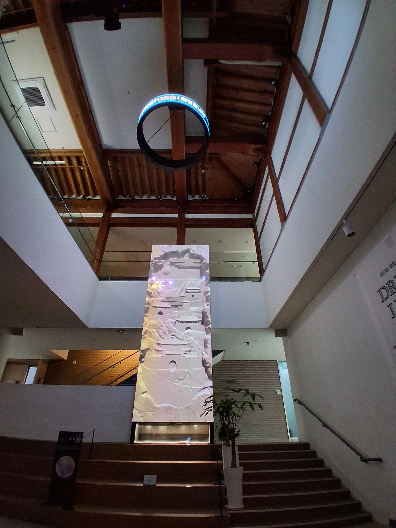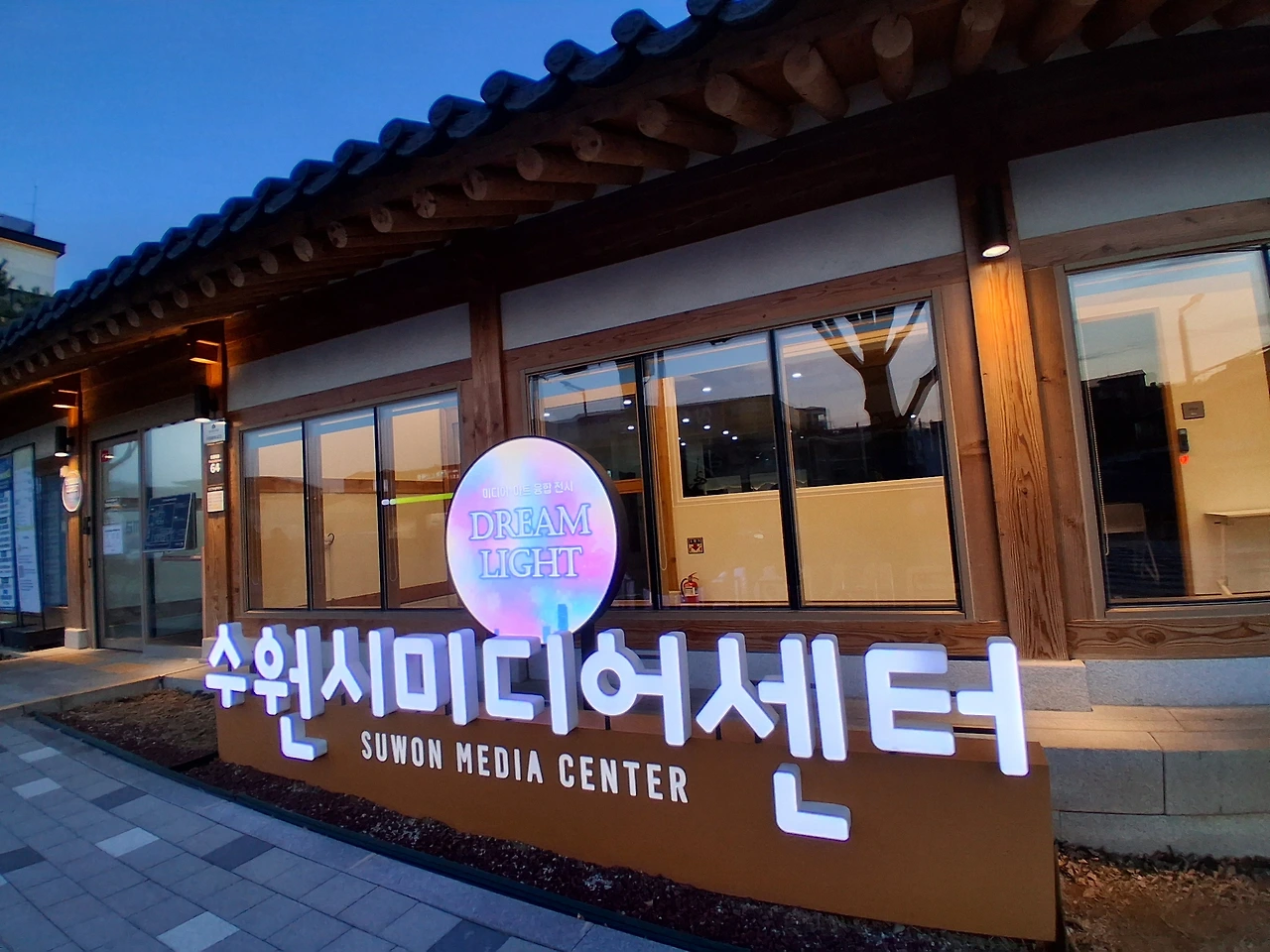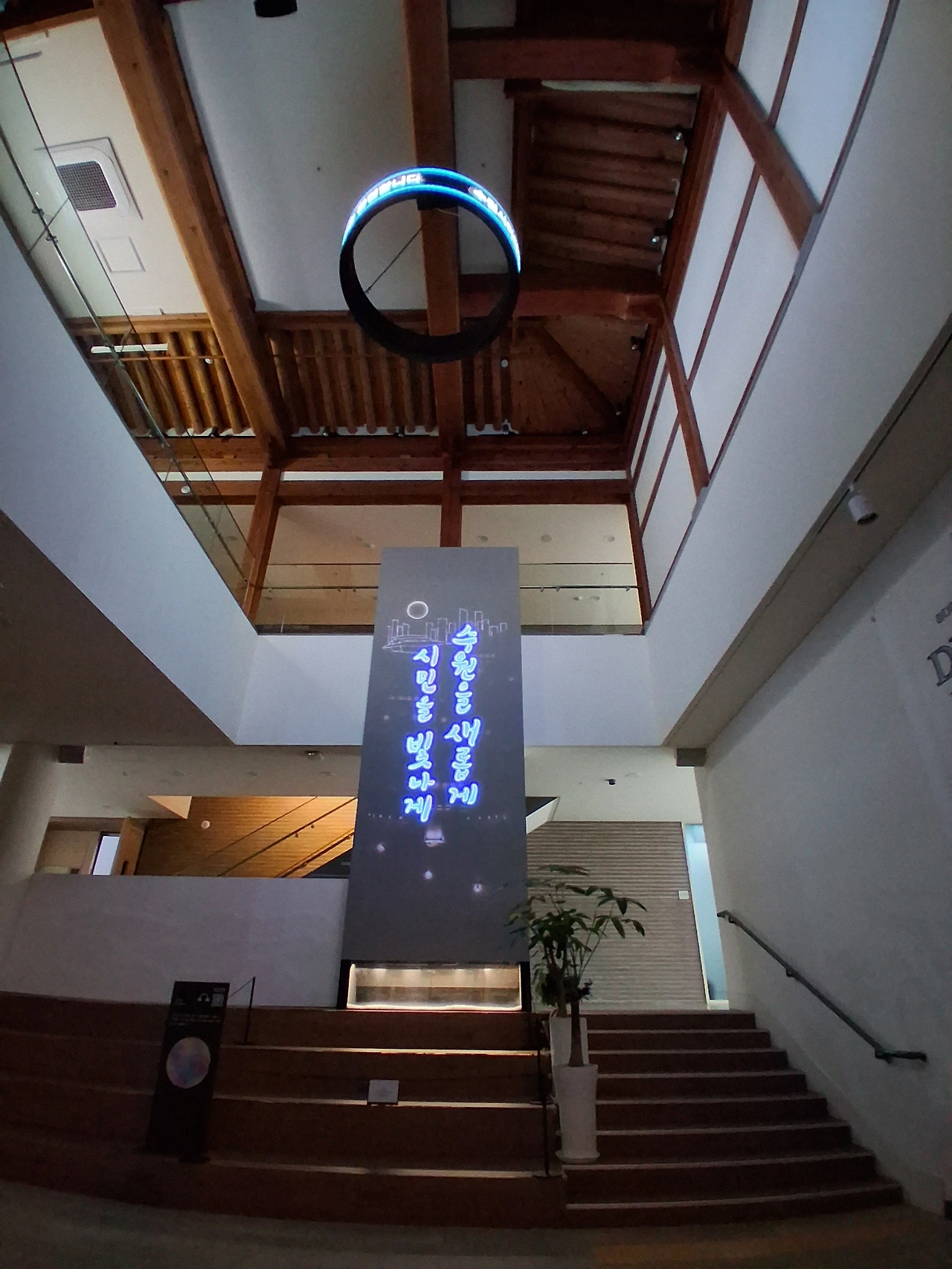 수원미디어센터에 도착하니 20여 분 여유가 있다. 예약 체크하고 1층 로비에 앉아 드림 라이트 <빛의 기원>과 <수원의 서재, 책가도>를 또 본다. <빛의 기원>이 끝나자 수원시 표어 "수원을 새롭게 시민을 빛나게"가 펼쳐진다.