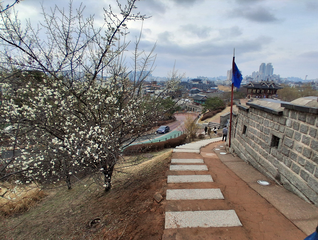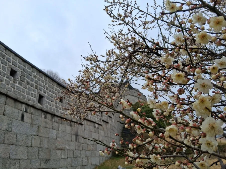 수원화성 성곽길 올라가면서도 성벽 사이로 그 매화를 담아본다. 매화꽃 뒤로 전통시장의 간판들이 보여서 그리 예쁘게 구도가 나오지는 않지만 애써 사진을 찍어본다.