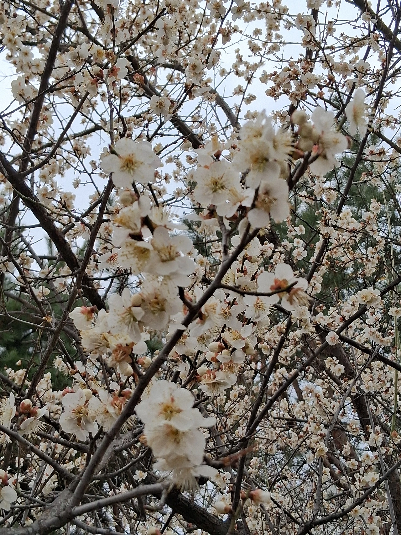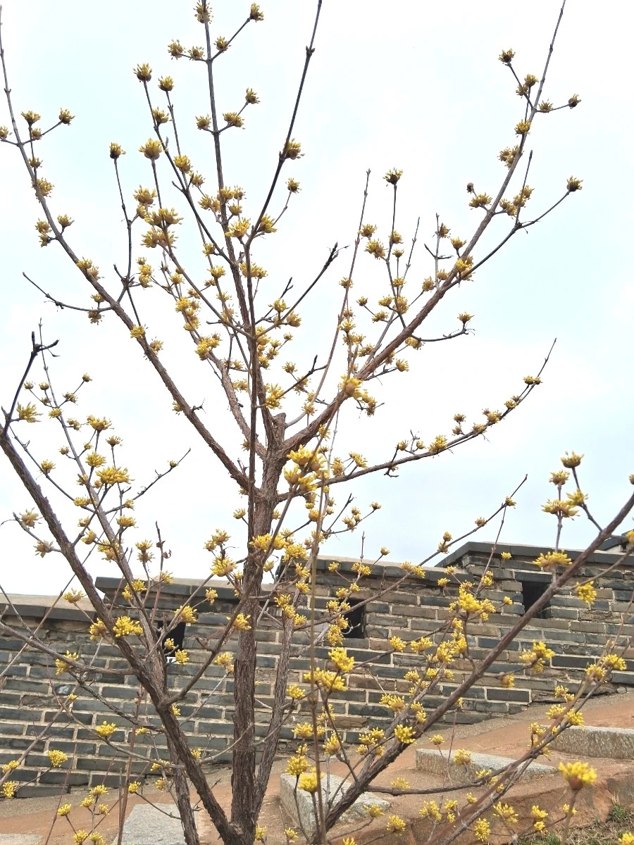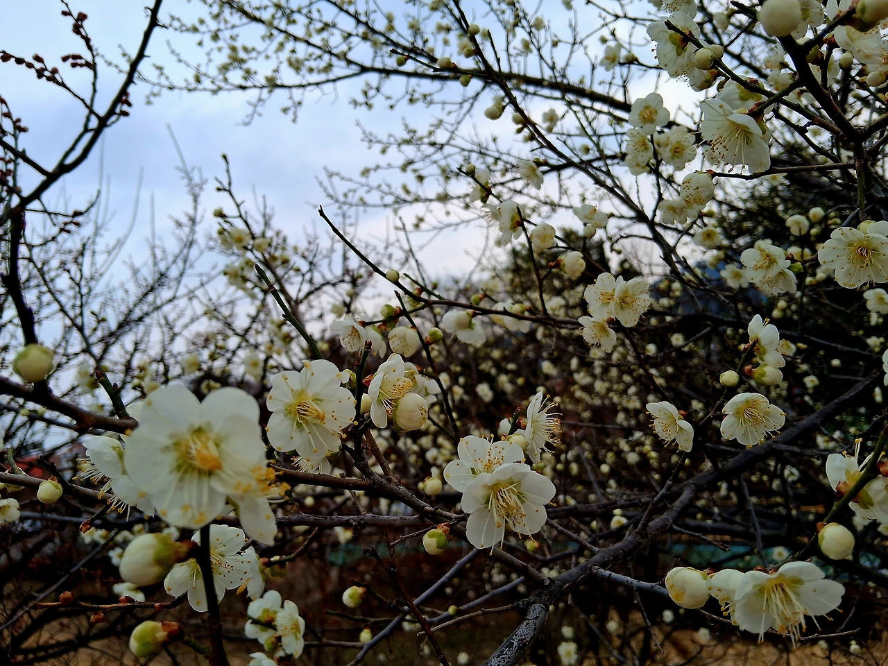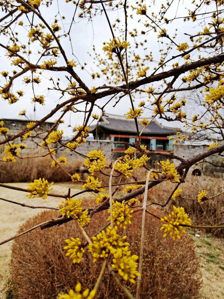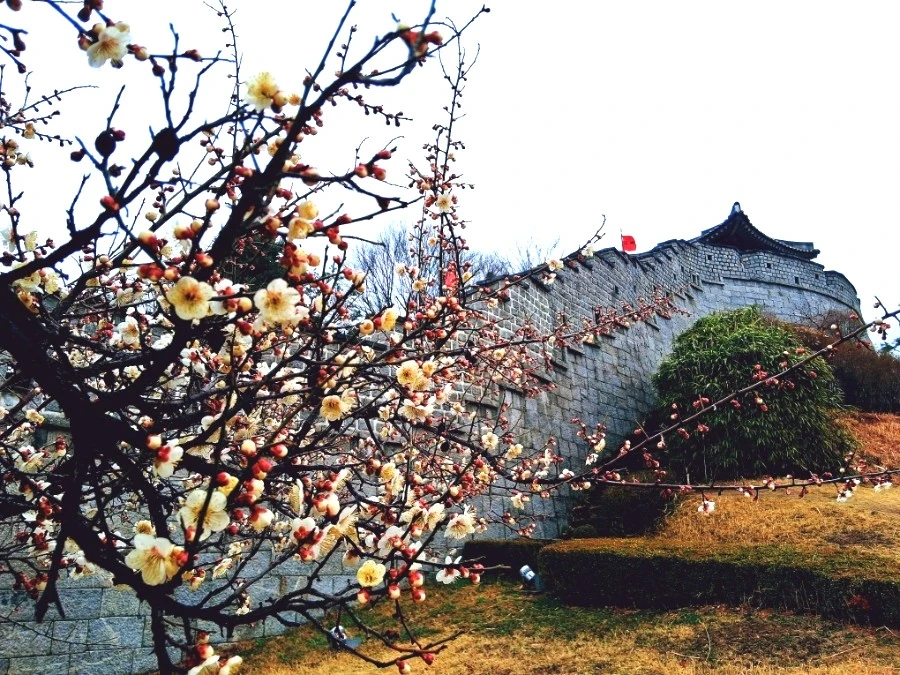 수원화성 성곽길 동남각루로 올라가려는데 꽃나무 한 그루가 눈에 띈다. 얼른 그 옆으로 다가간다. 꽃이 꽤나 많이 피어 있다. 속눈썹이 긴 매화꽃이다. 동남각루를 배경으로 매화꽃이 나오게 사진에 담는다. 매화는 수원화성 성곽길과 잘 어우러진다. 옛것이고, 고고하고, 우리 것을 잘 지키고 있다는 의미에서다.