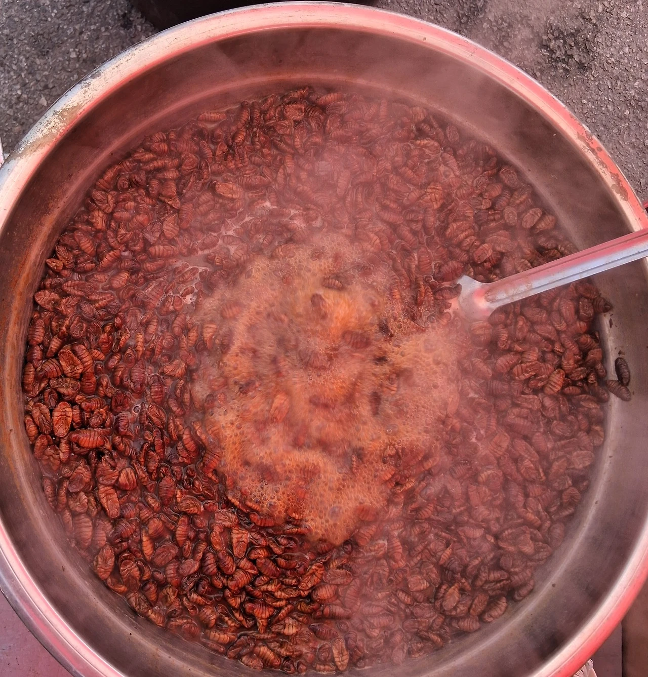 커다란 양푼에 번데기 끓이는 모습도 구경한다.