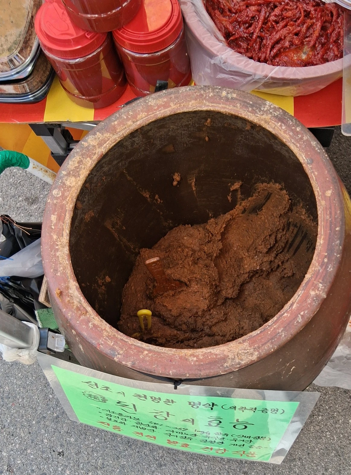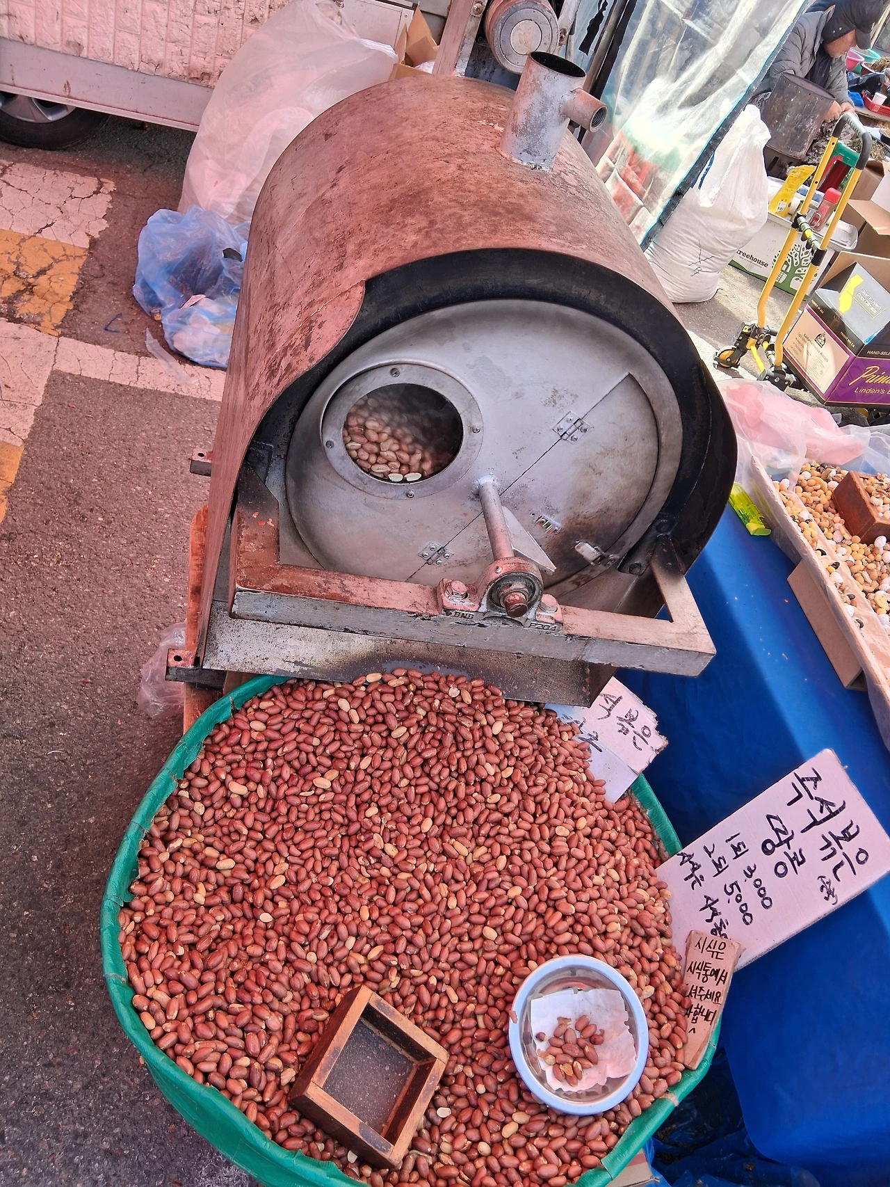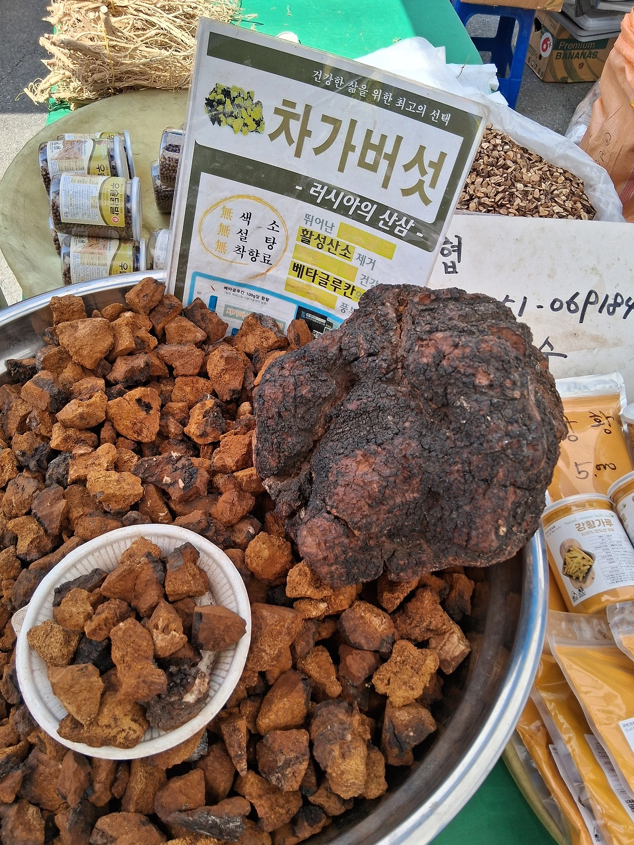 러시아의 산삼 차가버섯 구경하고, 땅콩 볶는 기계 앞에서 고소하게 볶아져 나온 땅콩 두 되를 5천 원에 산다. 선조의 현명한 명약 재래식 된장 항아리를 담고 베 보자기들이 여러 장 펼쳐져 있는 곳을 지나간다.