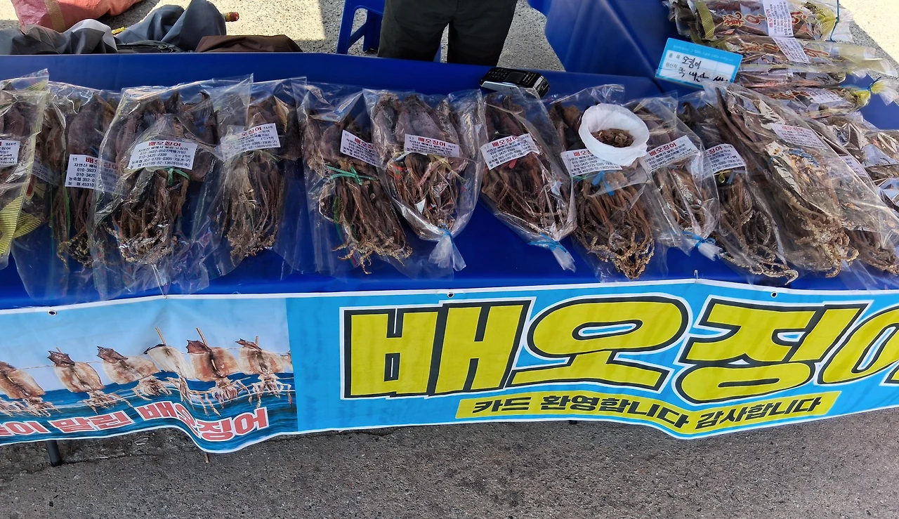 대로변으로 나왔다. 배오징어 파는 곳이 있다. 나는 오징어 킬러라서 꼭 값을 물어본다. 10마리에 5만 원짜리부터 15만 원짜리까지 다양하다. 시식을 하라고 잘게 잘라서 접시에 조금 내놓았기에 먹어보니 짜지 않고 맛있다. 6만 원짜리를 6만 원에 달라니까 안 된단다. 할인가라서 1천 원, 2천 원도 깎아주기 어렵단다. 그냥 지나온다. 가다가 되돌아간다.