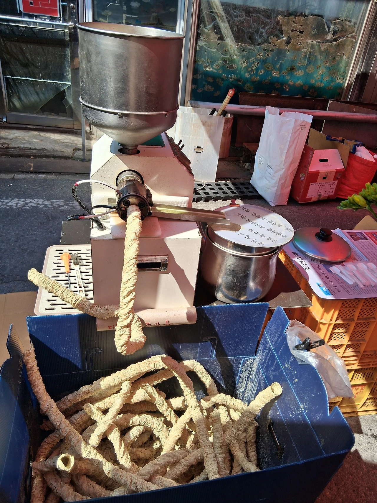 그렇지만 대충 보면서 간다. 골목 끝부분에서 오른쪽으로 꺾어져서 또 골목을 따라 걷는다. 신기한 것들이 많다. 대마씨 기름 짜는 모습, 기름은 따로 짜져서 그릇에 내려오고 하얗게 과자 비슷한 것이 기다랗게 구멍으로 나온다.