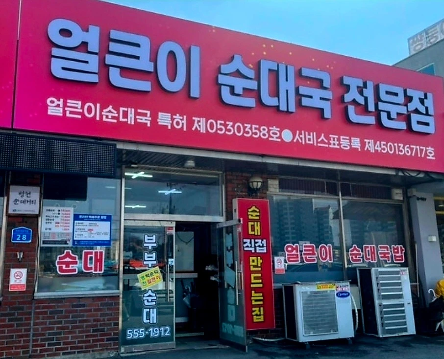 내 평소 지론대로 살펴보니 식당 앞에 주차장이 아주 넓은 집이 보인다. 주차장에 자동차가 가득 찼다. 거기다가 간판에 '얼큰이 순대국' 특허를 받았다고 특허번호까지 적어 놓았다.