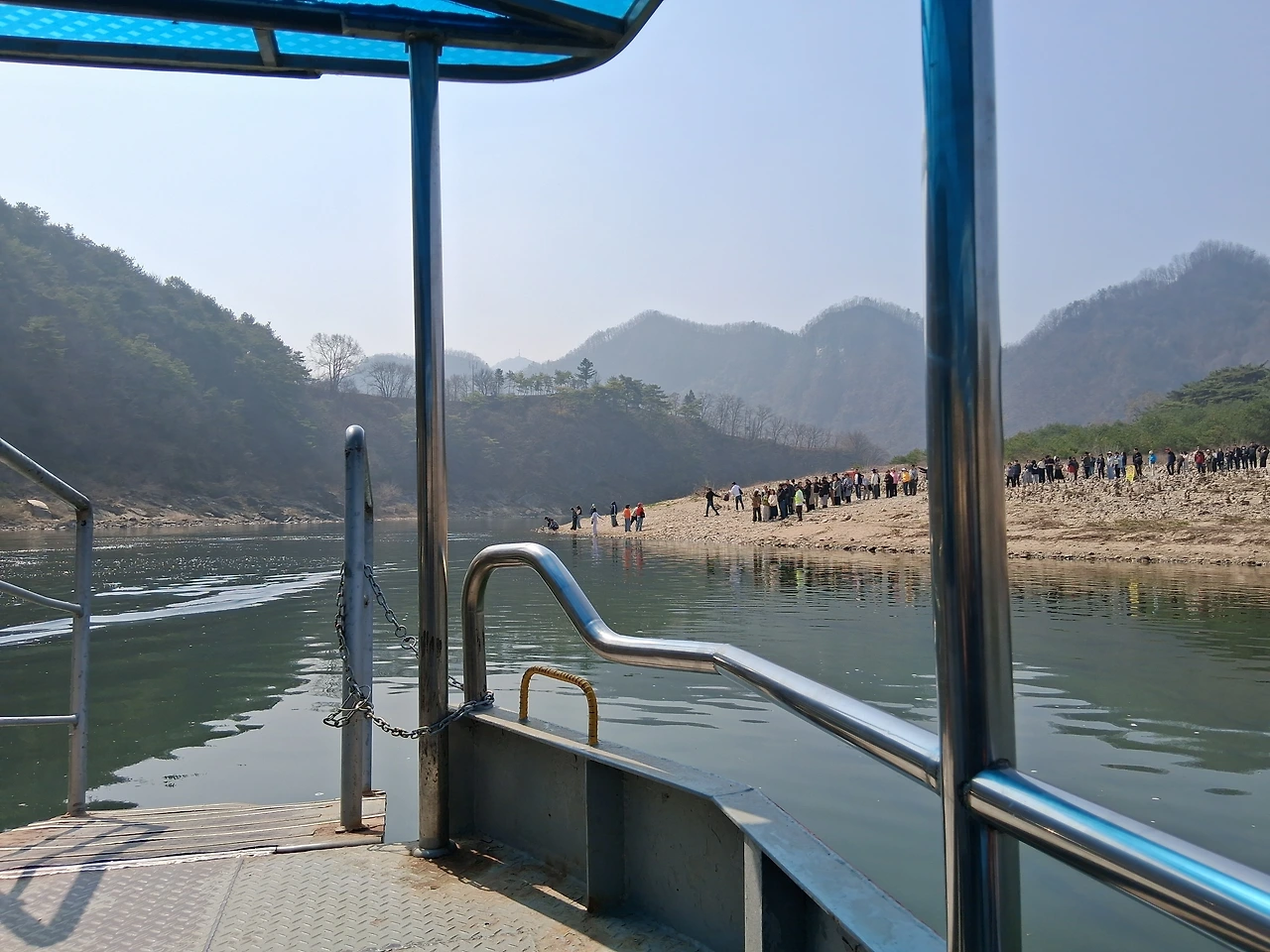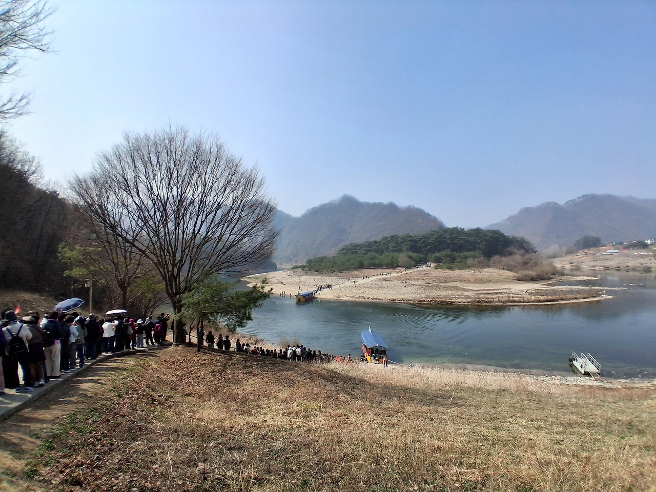 아니나 다를까? 주차장도 차들로 가득 찼고 청령포 들어가는 배 타는 줄도 아주 길다. 거의 1시간 이상 줄을 서야 배를 탈 수가 있다. 청령포로 가려면 건너야 하는 서강은 폭도 그리 넓지 않고 깊이도 그리 깊어 보이지 않았다.