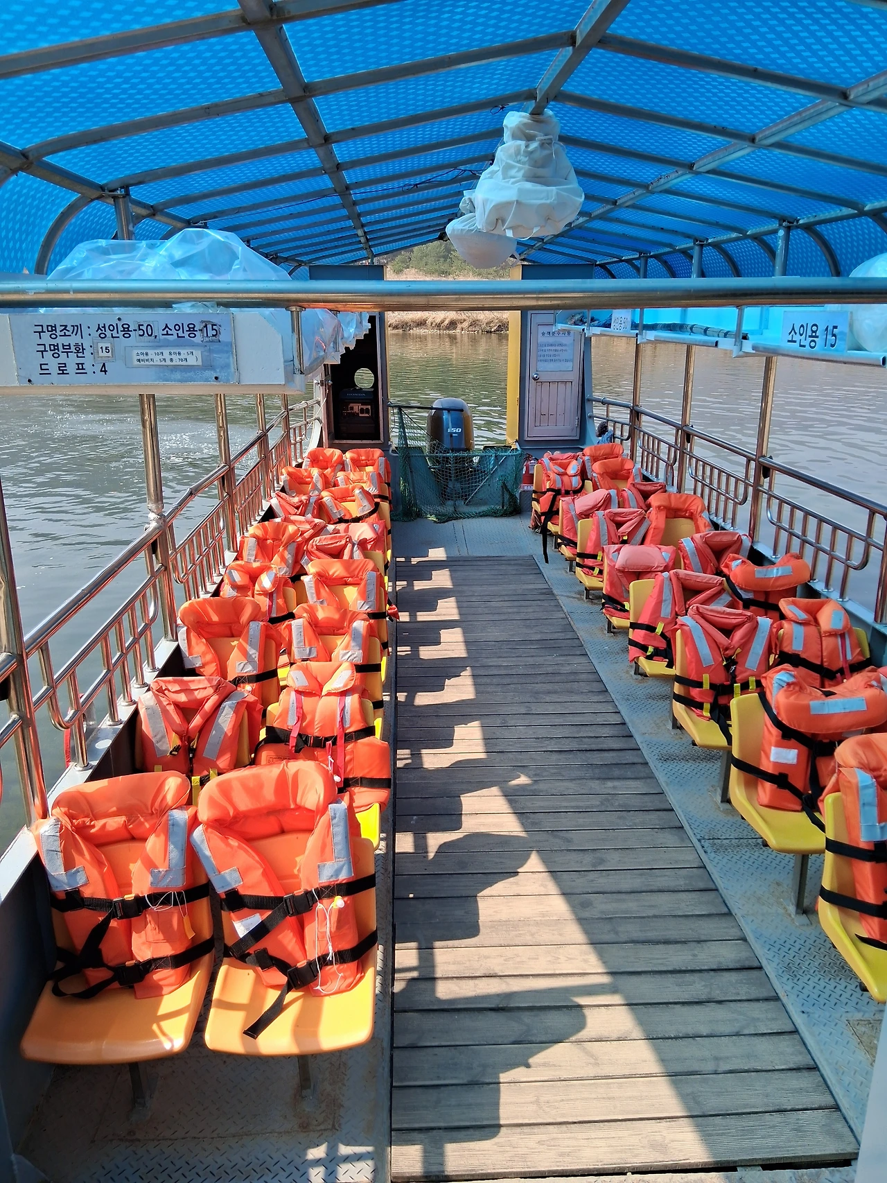 배는 34명이 탈 수 있다. 맨 앞에서 배를 타면서 안을 찍어서 의자 수를 세어보니 그렇다. 서강을 건너는데 배로는 5분도 채 안 걸리는 거리이다.
