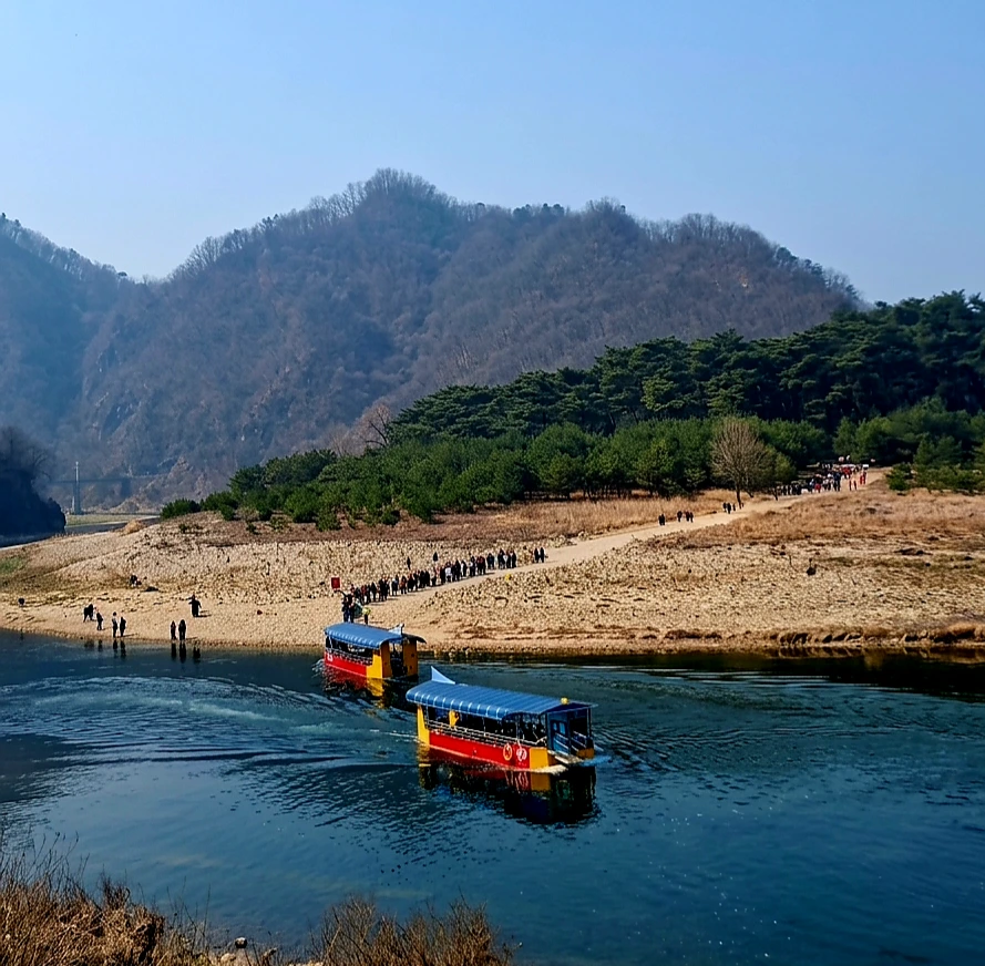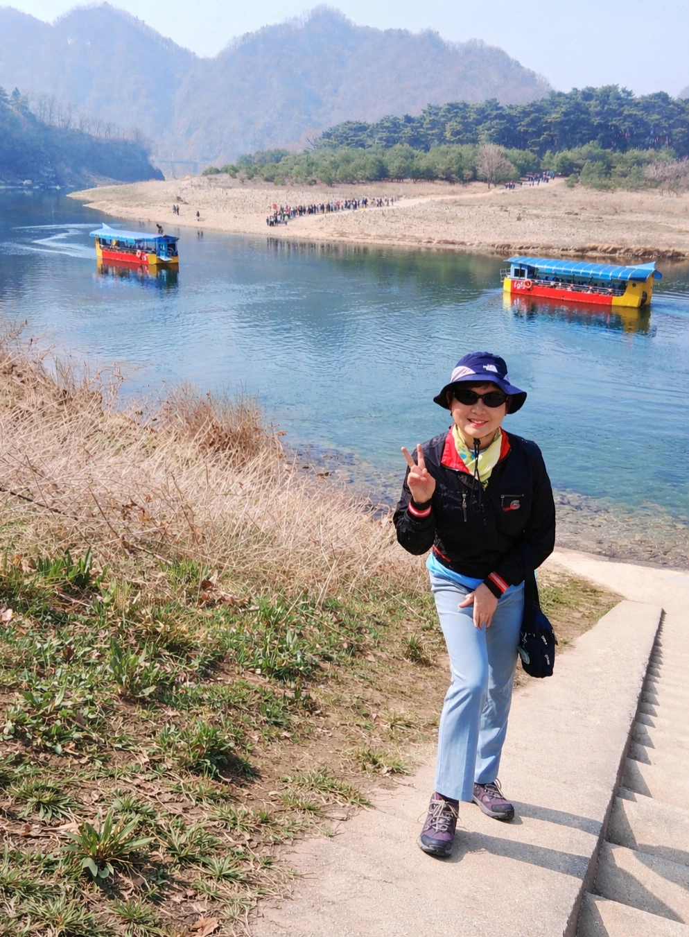 거의 내 순서가 왔을 즈음 청령포와 서강과 배를 배경으로 기념사진을 찍는다. 가이드님이 바로 옆에 있어서 부탁을 하니 예쁘게 찍어 주신다.