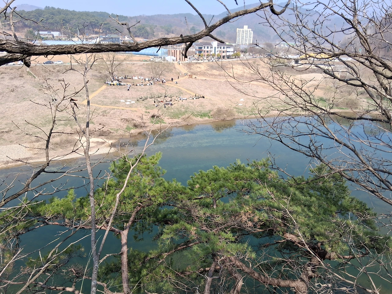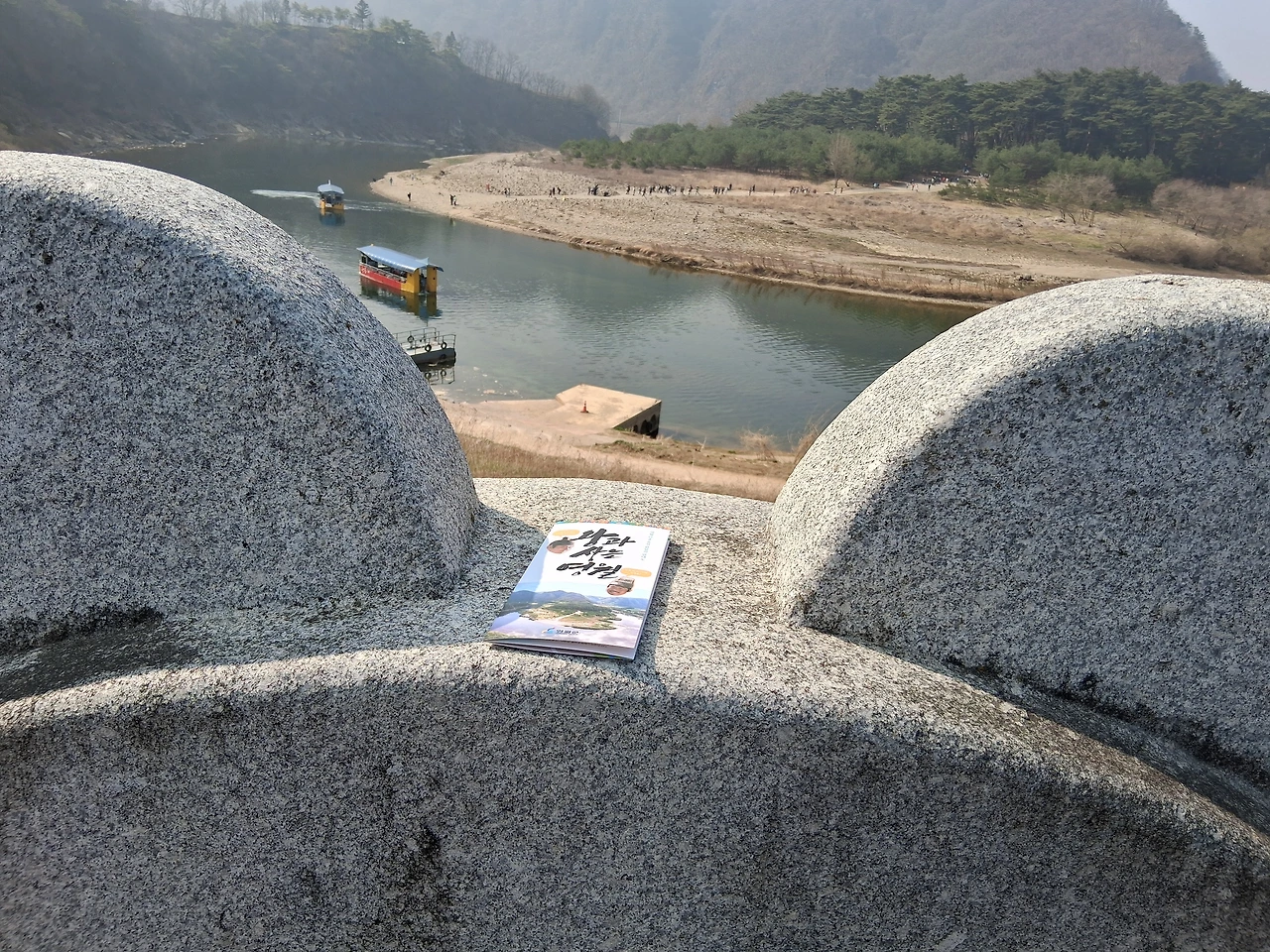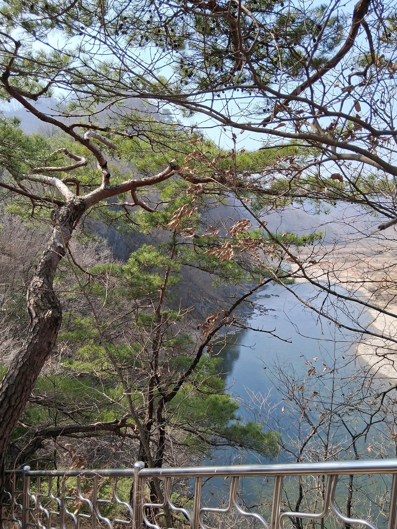 다들 기다리면서 한 마디씩 하지만 내려다보이는 풍경이 괜찮아서 기다릴 만하다. 삼면이 서강으로 둘러싸인 조그만 섬 청령포가 한눈에 들어오고, 부드러운 곡선의 파란 강 위에 배 두 척이 사람을 싣고 오가는 모습도 한 폭의 그림이다. 청령포 뒤쪽으로는 산봉우리들과 산 마루금이 배경 수묵화를 그리고 있다.