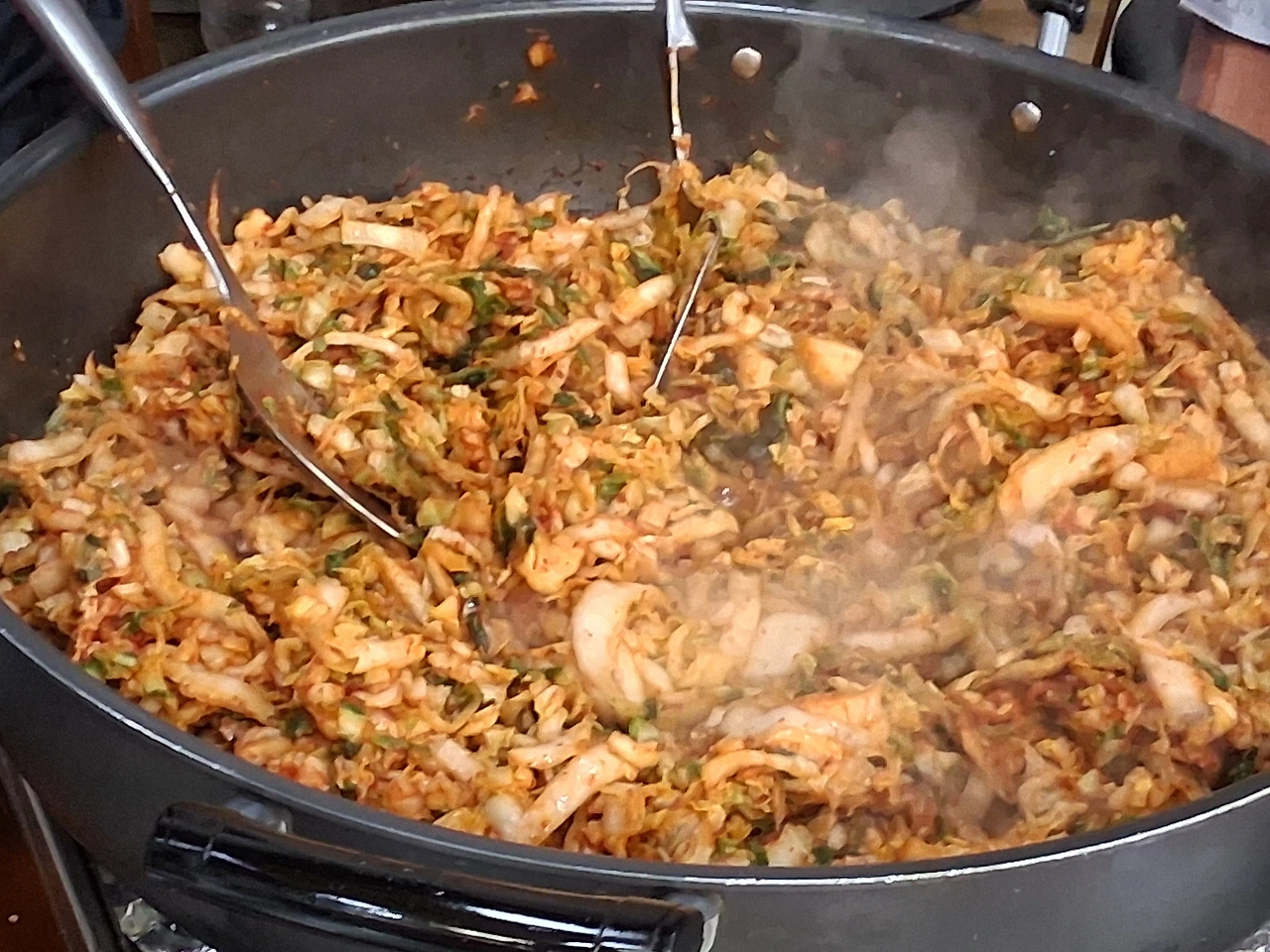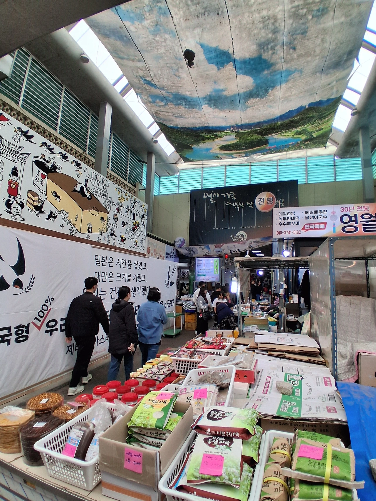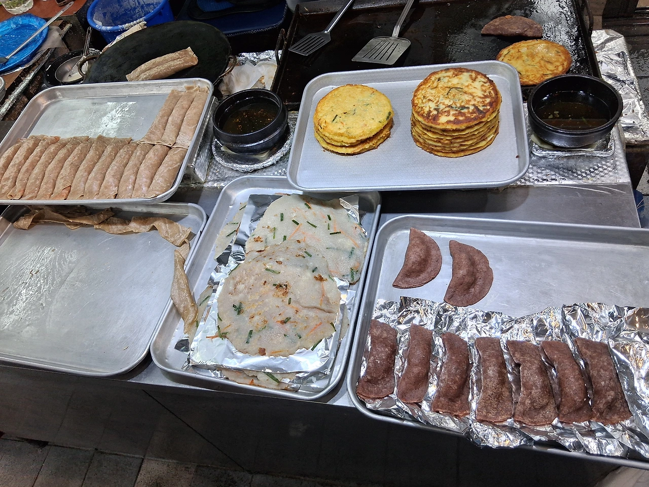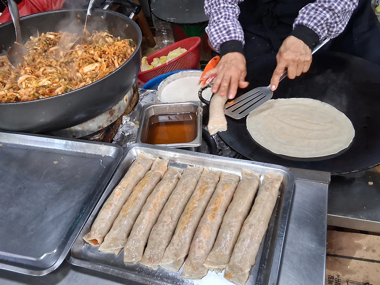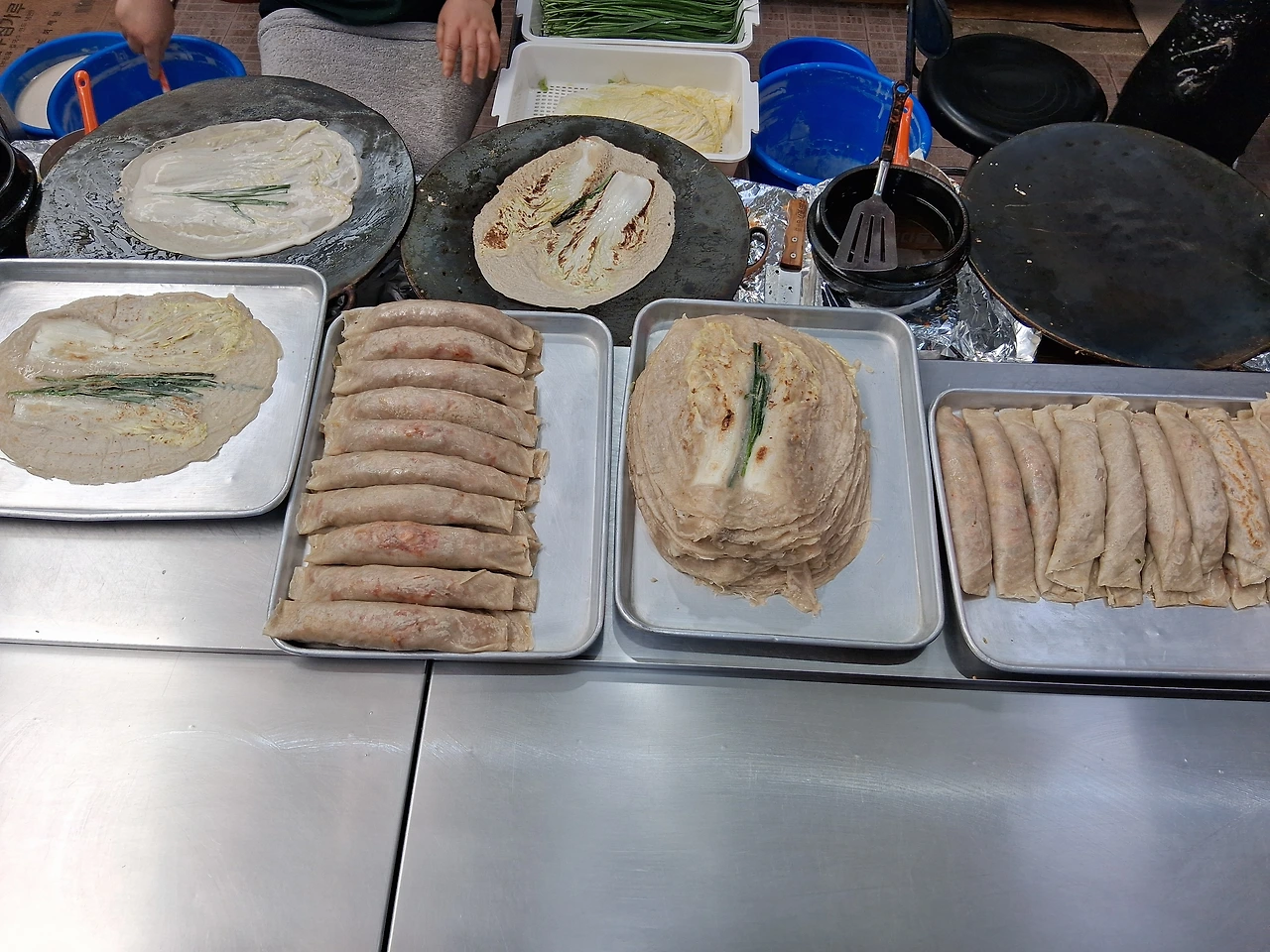 영월 서부시장 주차장에 내려 시장 안으로 들어왔는데 가게마다 온통 전을 부치는 풍경이다. 나는 안으로 쑥 들어가서 판을 벌여놓고 부침개를 부치는 아주머니들을 둘러본다. 순대를 벌여놓고 파는 곳도 있다.