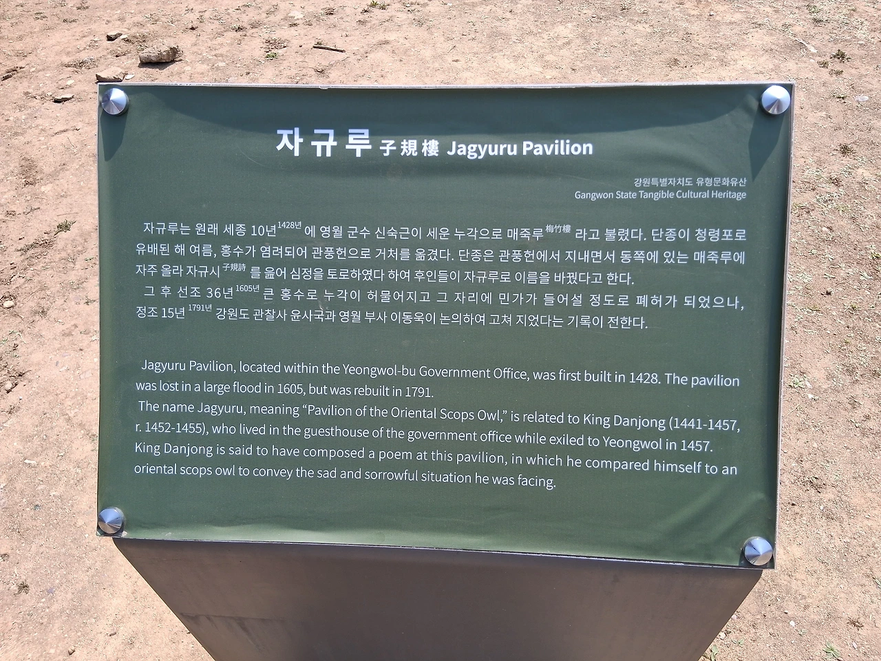 커다란 마당 한쪽 모서리 쪽에 정자가 있어서 가보니 안내판에 '자규루(매죽루)'라고 설명이 되어 있다. 단종왕이 자주 올라 자규가를 읊었다고 해서 붙은 이름이란다.