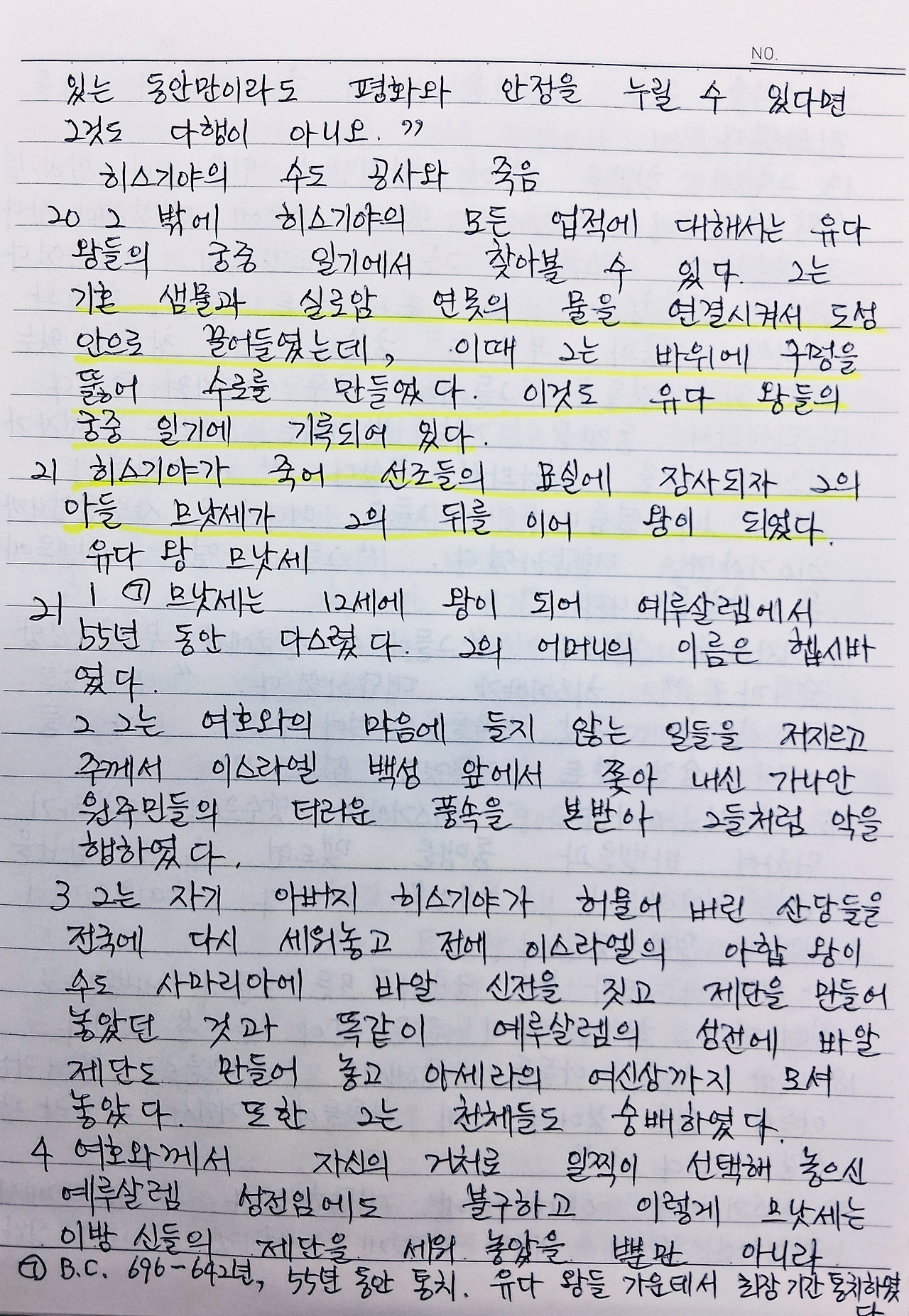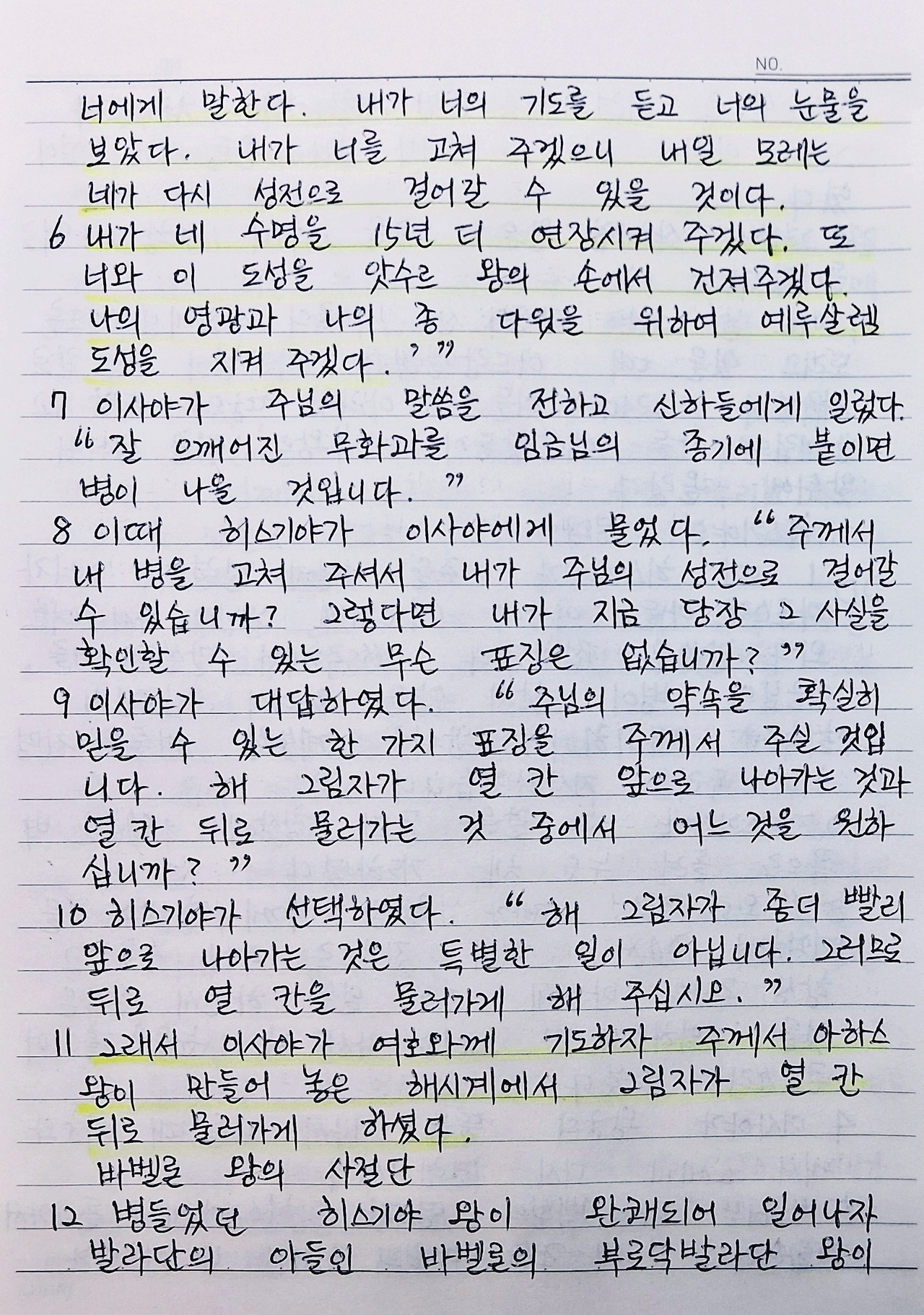 오늘 말씀 본문 열왕기하 20장은 죽을병에 걸려 당장 생명이 끝날 위기에 처한 남유다 히스기야 왕의 이야기이다. 히스기야 왕은 하나님께 기도하여 생명을 15년이나 연장받는다.