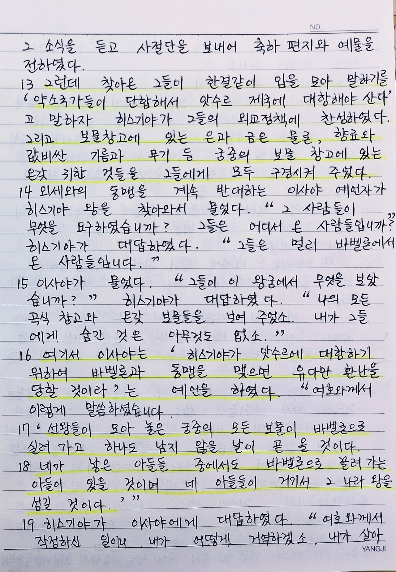 하나님께서는 이사야 선지자를 통해 히스기야 왕에게 말씀하신다. 그런데 순종하지 않고 벽 쪽으로 향하여 울면서 기도를 해서 히스기야 왕은 15년이나 더 살게 된다.