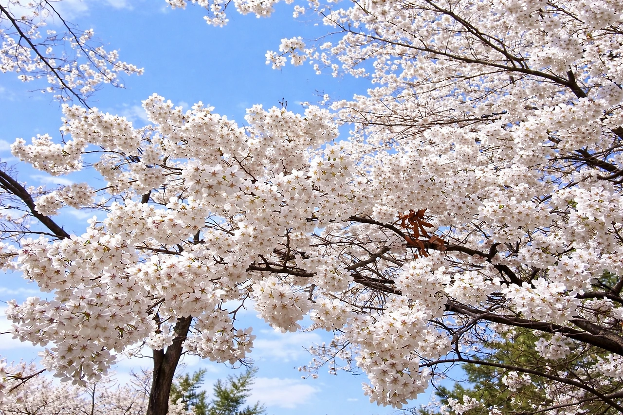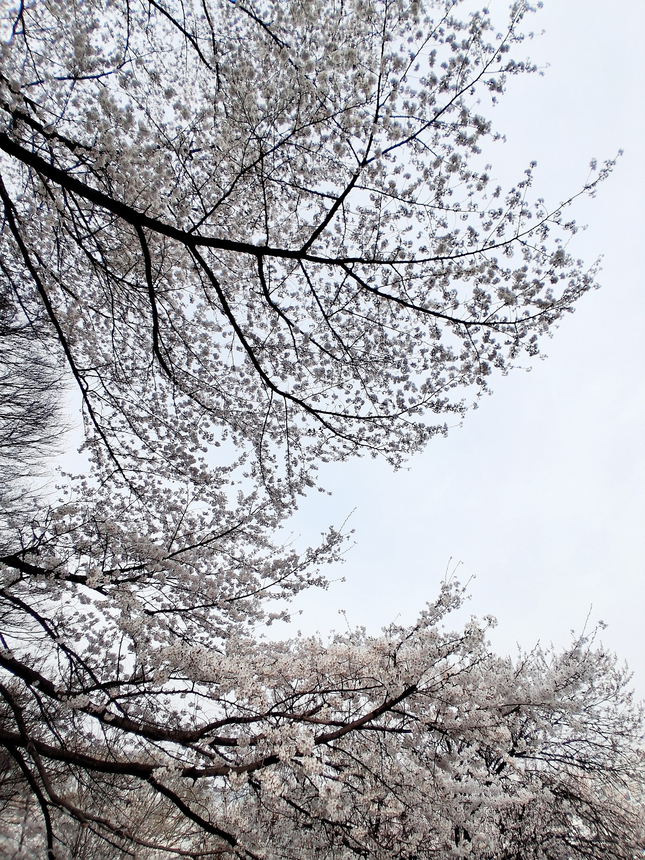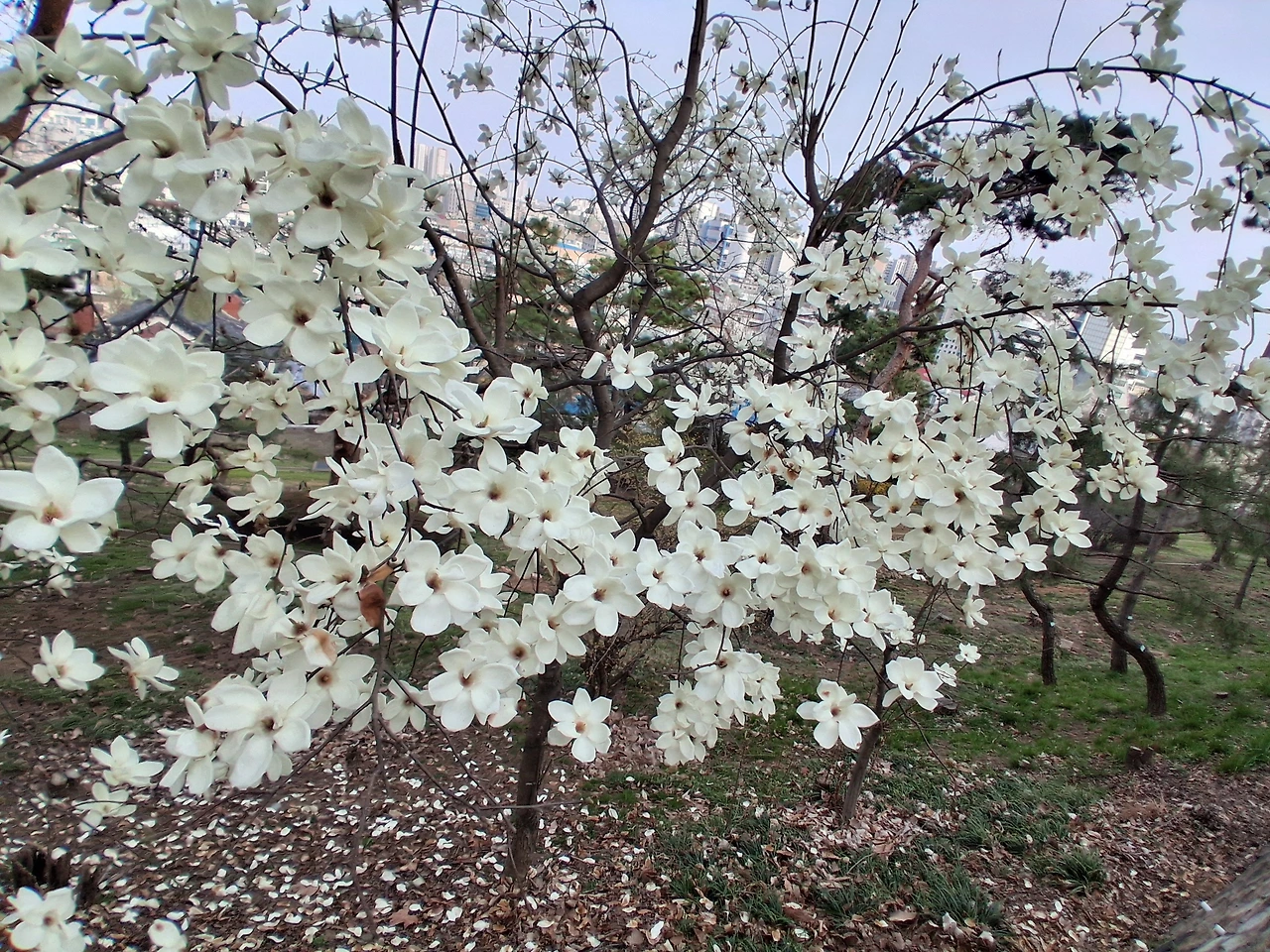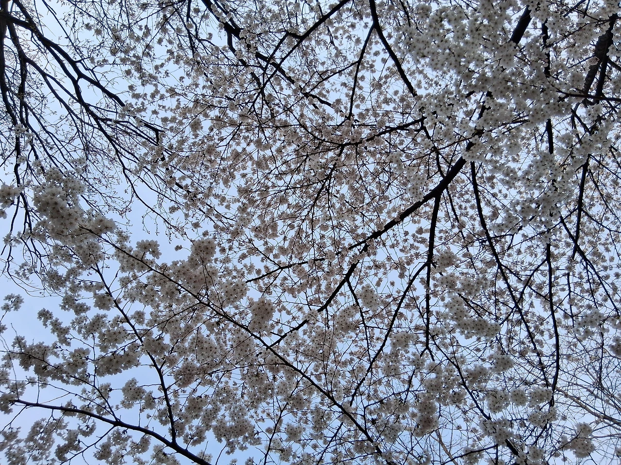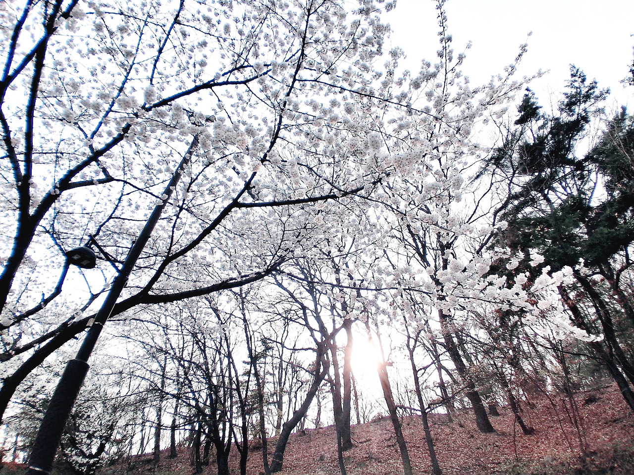 벚나무는 돌계단 중간 부분부터 있는데 완전히 만개를 했다. 올라갈수록 벚나무가 더 많고 꽃도 더 활짝 피었다. 환상의 세계이다. 지금까지 팔달산 올라본 중에는 가장 뽀얗게 화려하게 예쁘게 피었다. 바닥에 떨어진 꽃잎도 그리 많지 않다. 이제 막 꽃이 피어난 것이다. 벚꽃은 물론 개나리도 목련도 꽃송이가 흐트러짐이 없이 정제된 상태로 정성스럽게 피어 있다.
